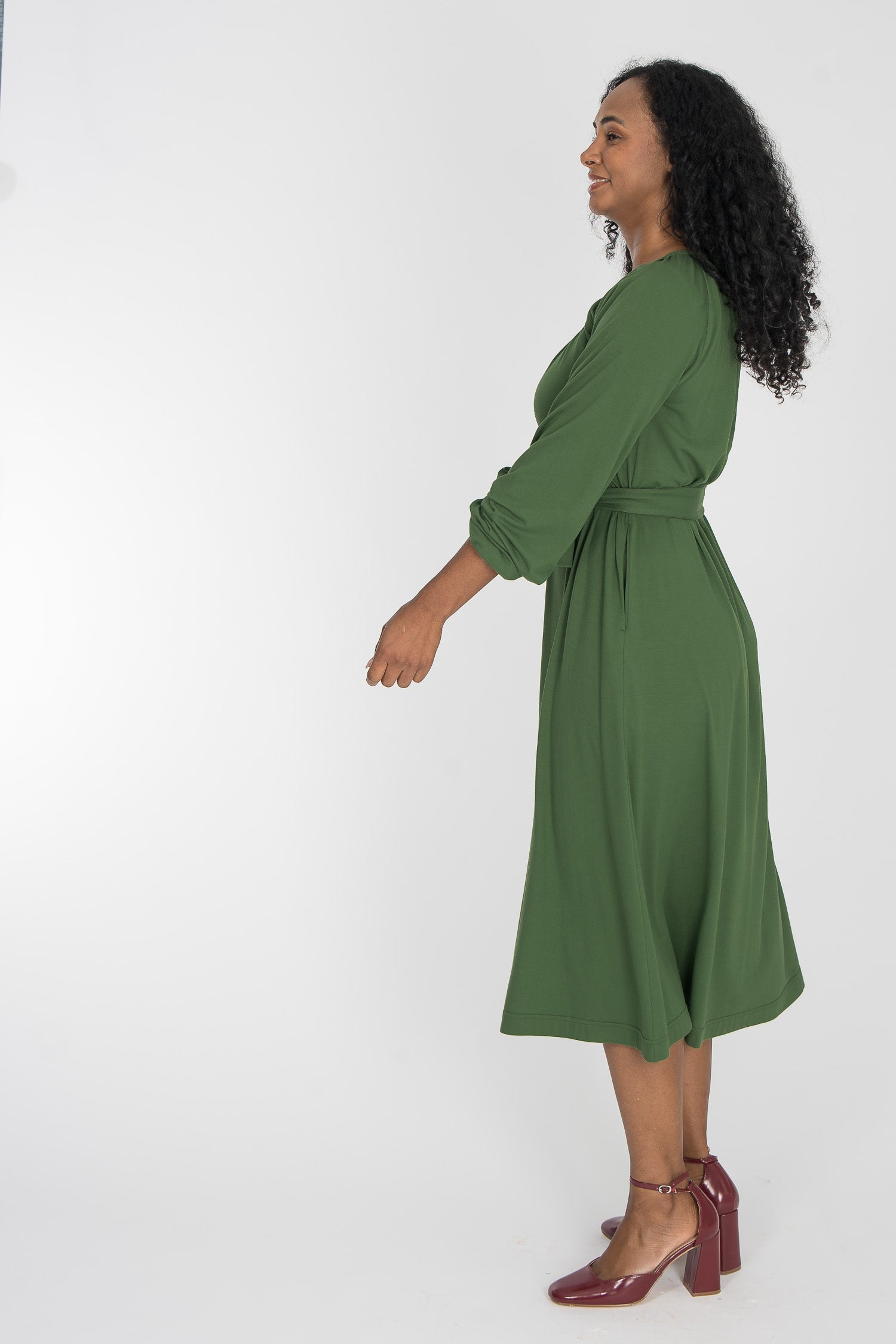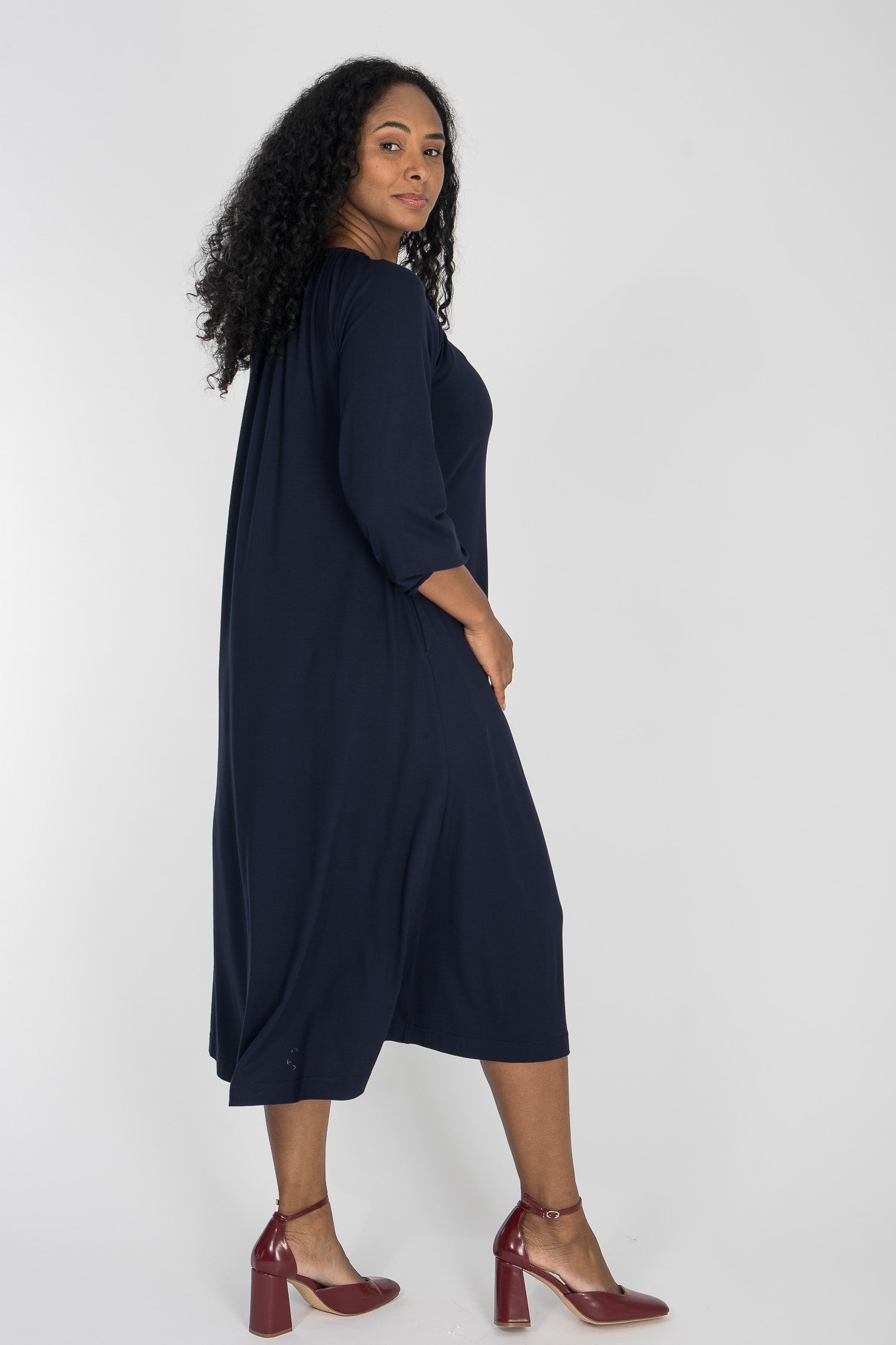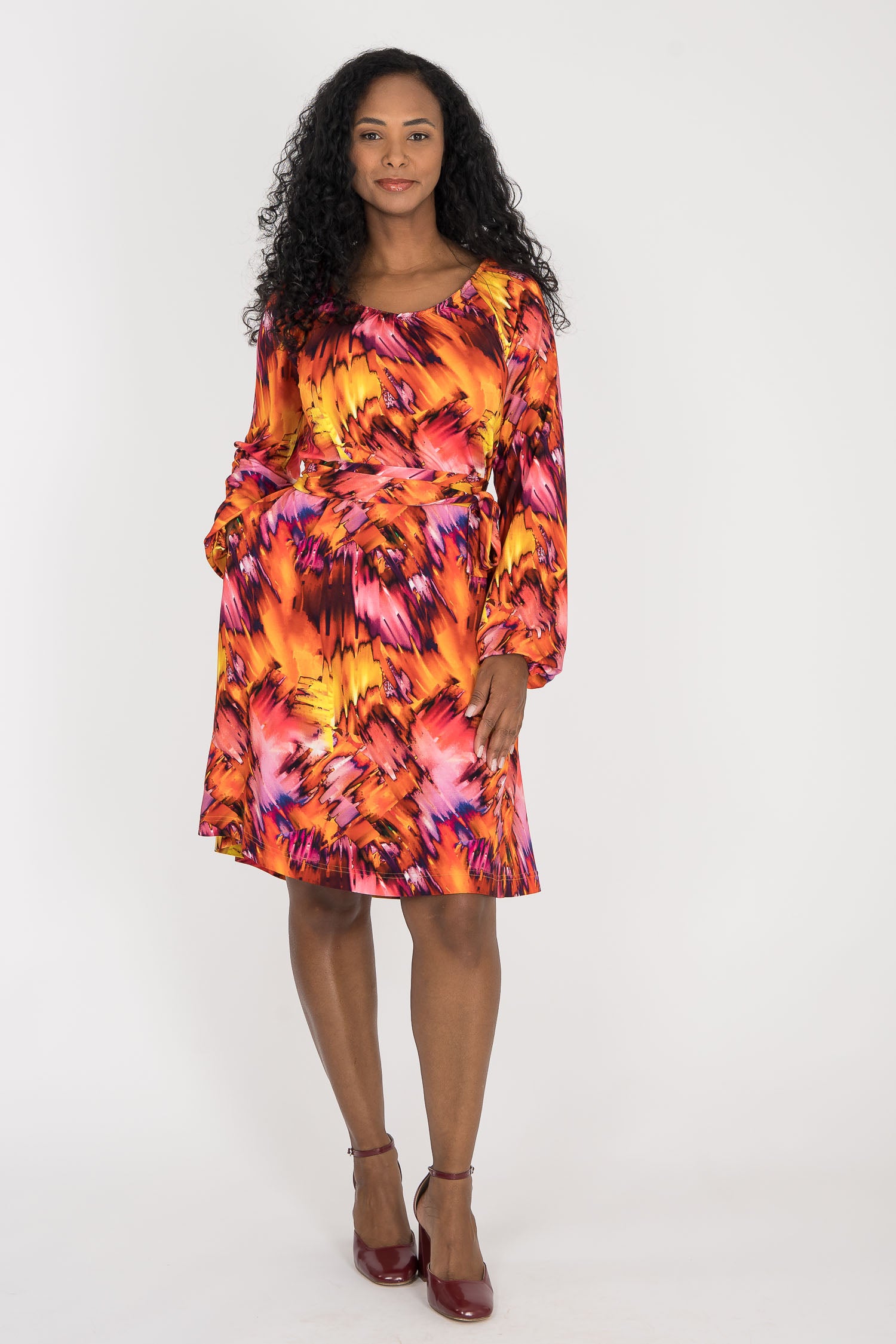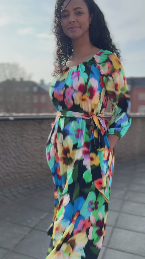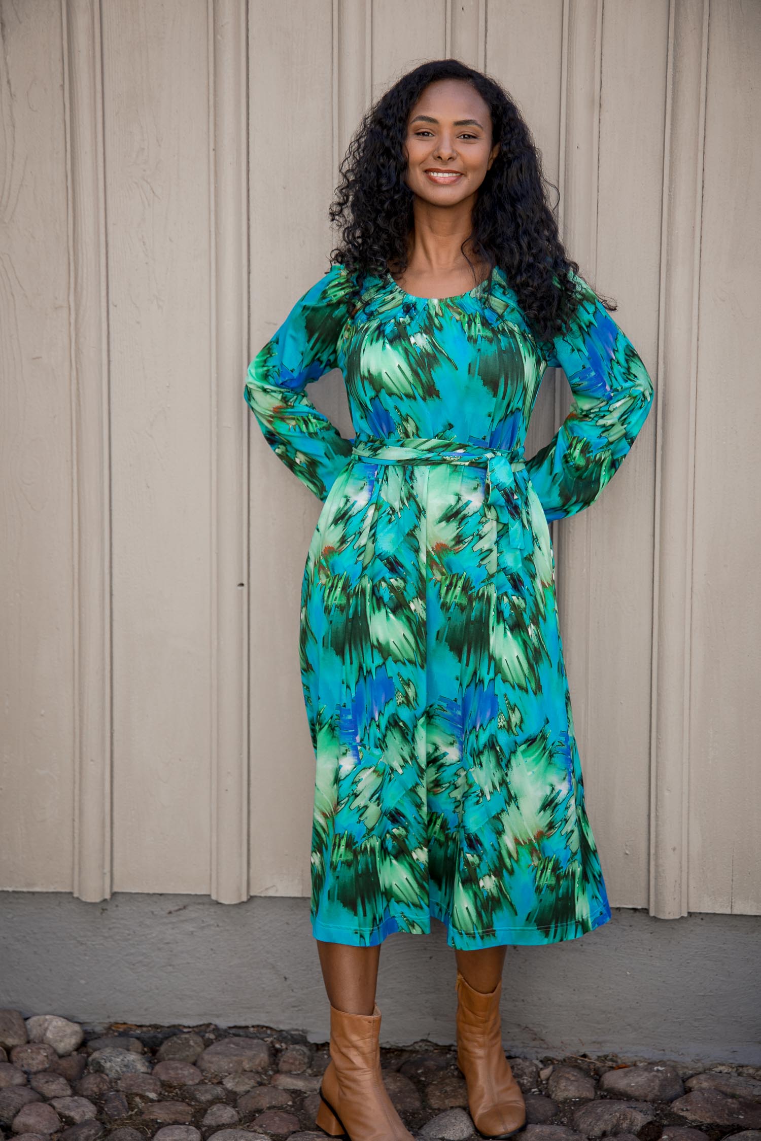 Omlottklänning med öppen omlott och knytband i sidan som knyts runt midjan och kan justeras för önskad silhuett. V-ringad överdel och figurnära ärm. Rundskuren kjol med generös vidd – vi snålar inte med tyg, vilket ger fint fall och inga glipor. Sys i stretchig viskos/elastan-trikå med tungt fall.