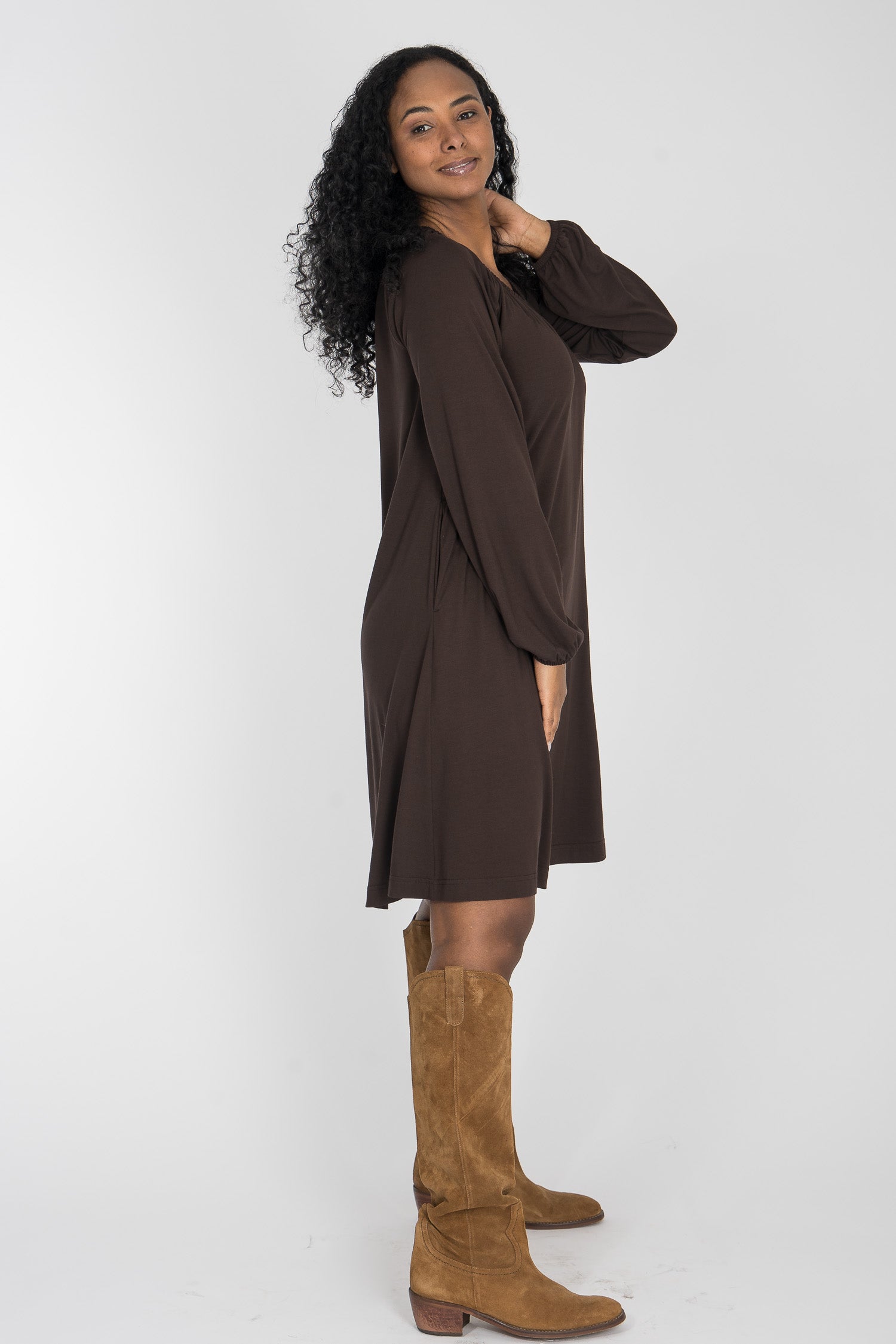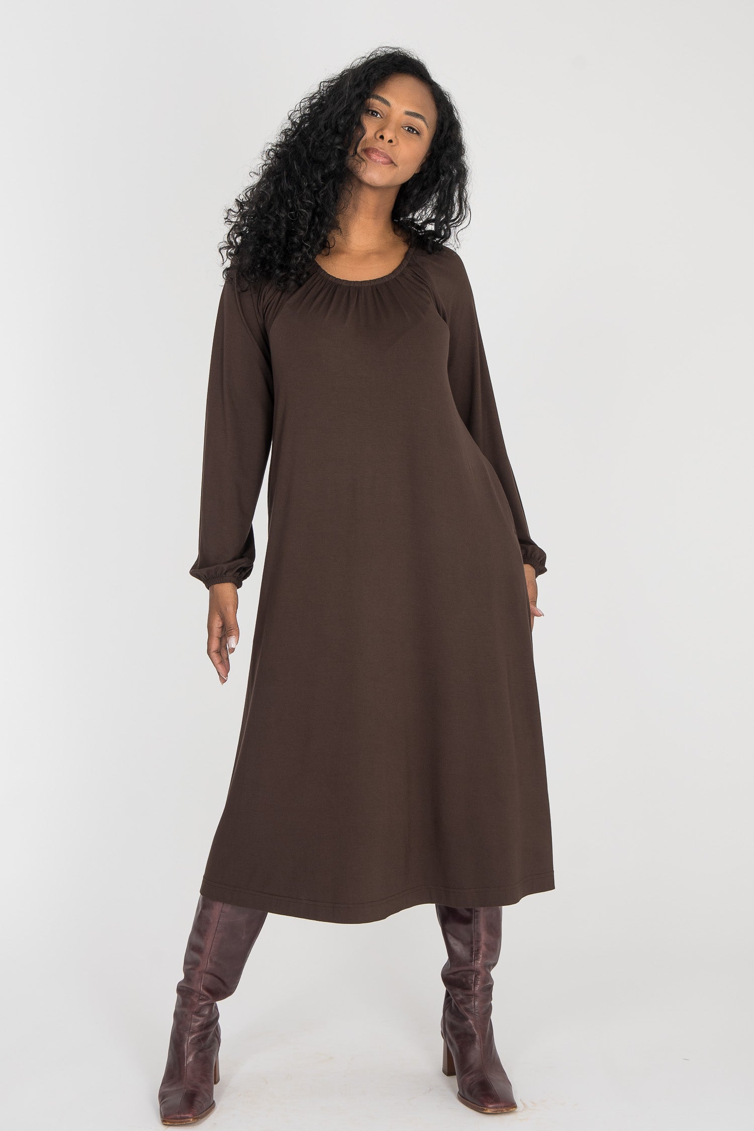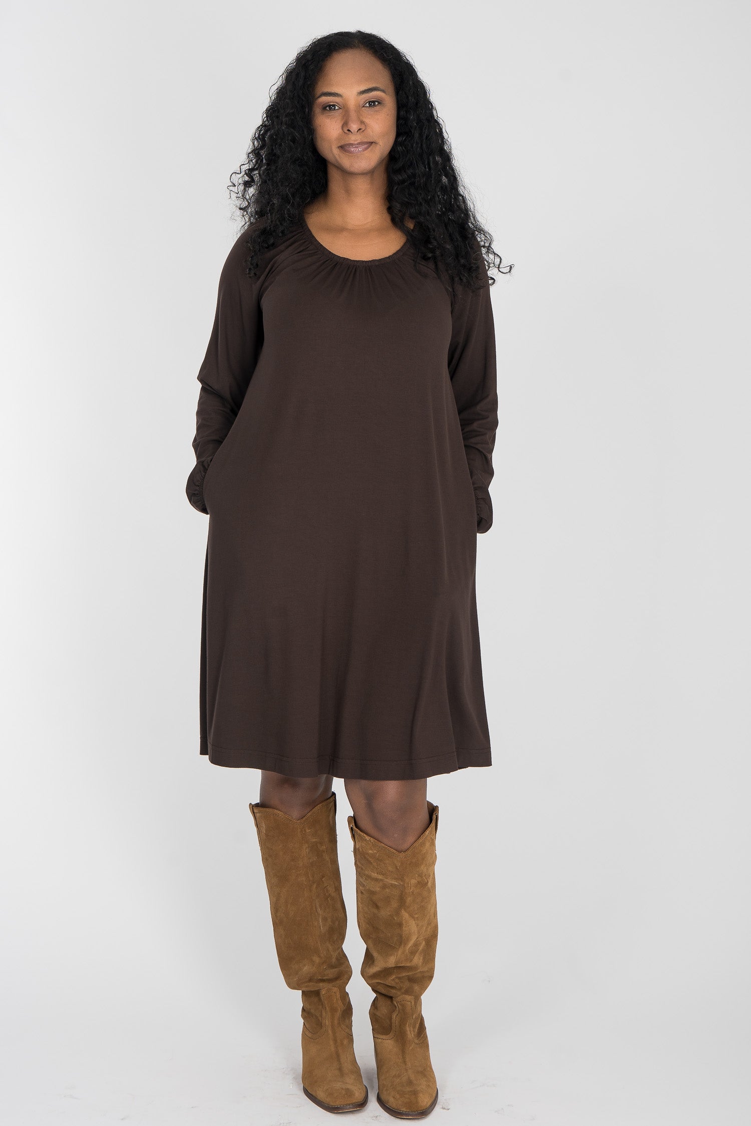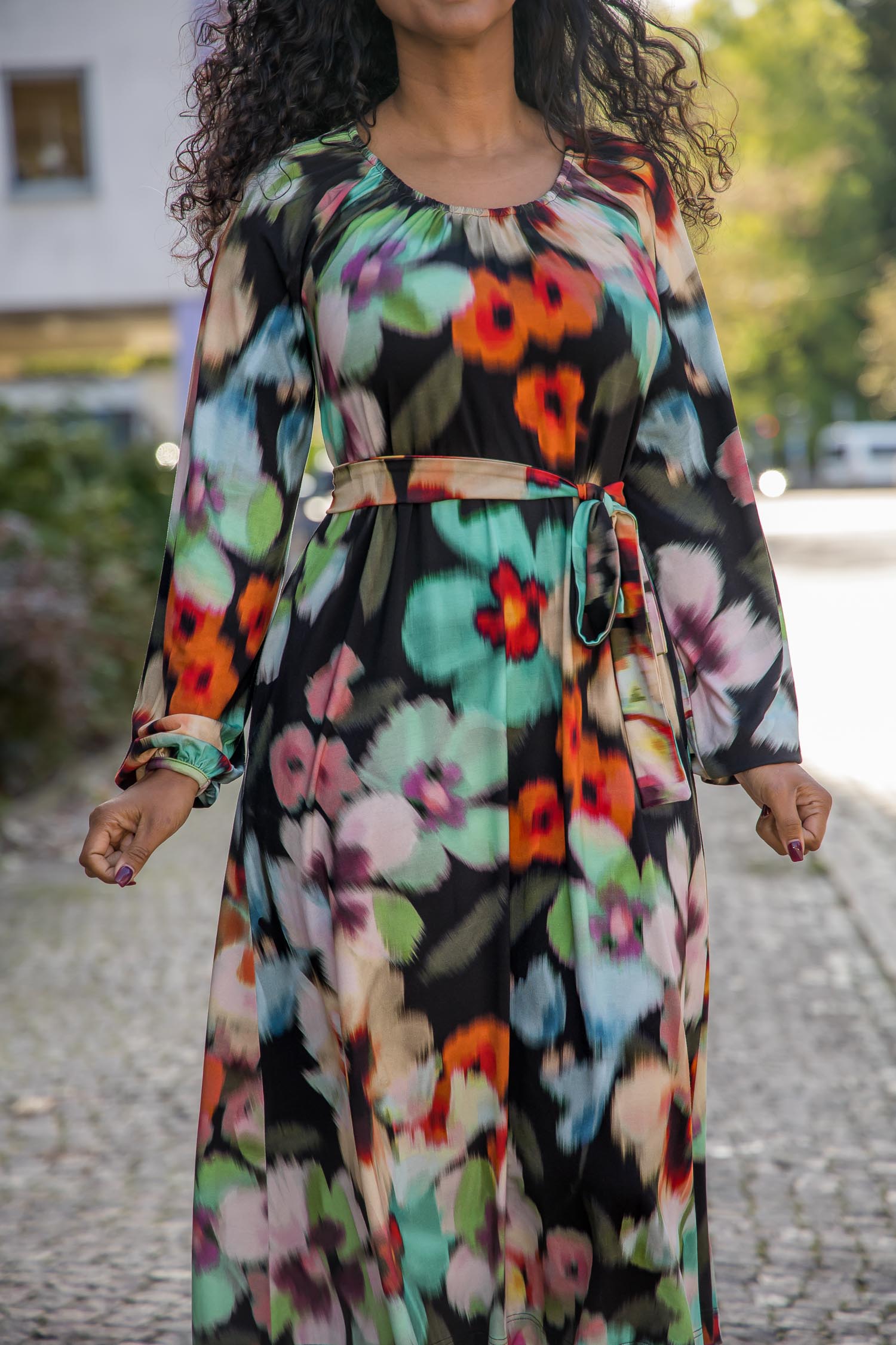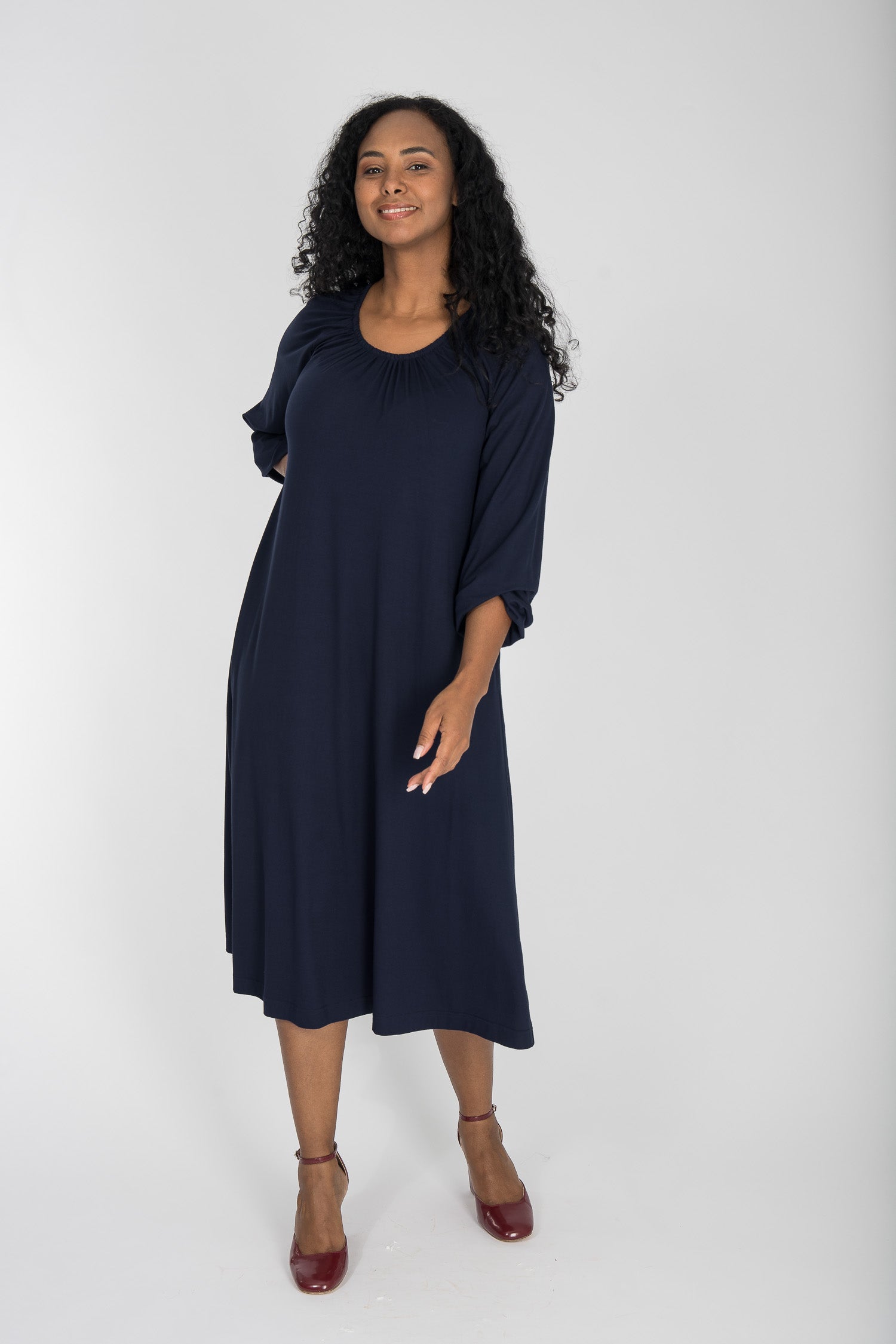 Omlottklänning med öppen omlott och knytband i sidan som knyts runt midjan och kan justeras för önskad silhuett. V-ringad överdel och figurnära ärm. Rundskuren kjol med generös vidd – vi snålar inte med tyg, vilket ger fint fall och inga glipor. Sys i stretchig viskos/elastan-trikå med tungt fall.