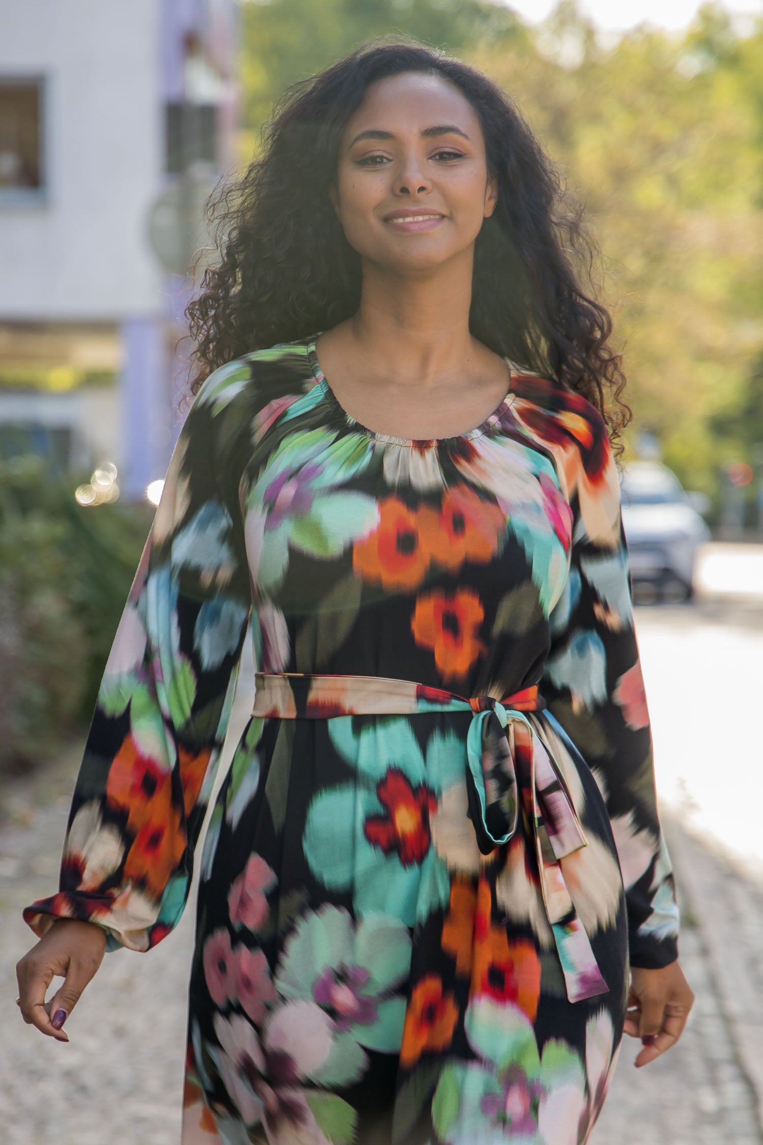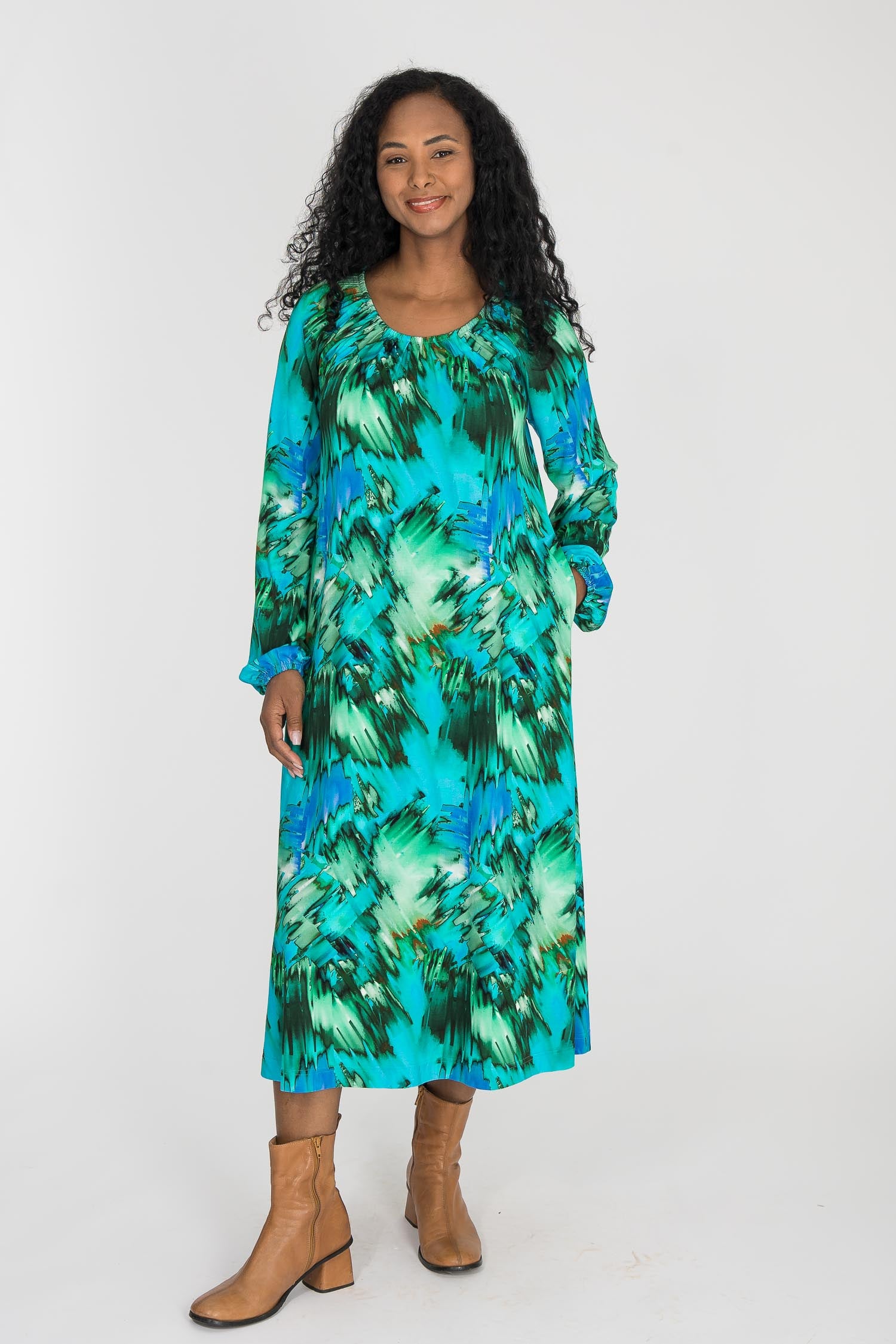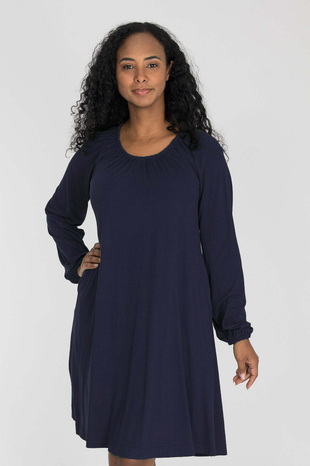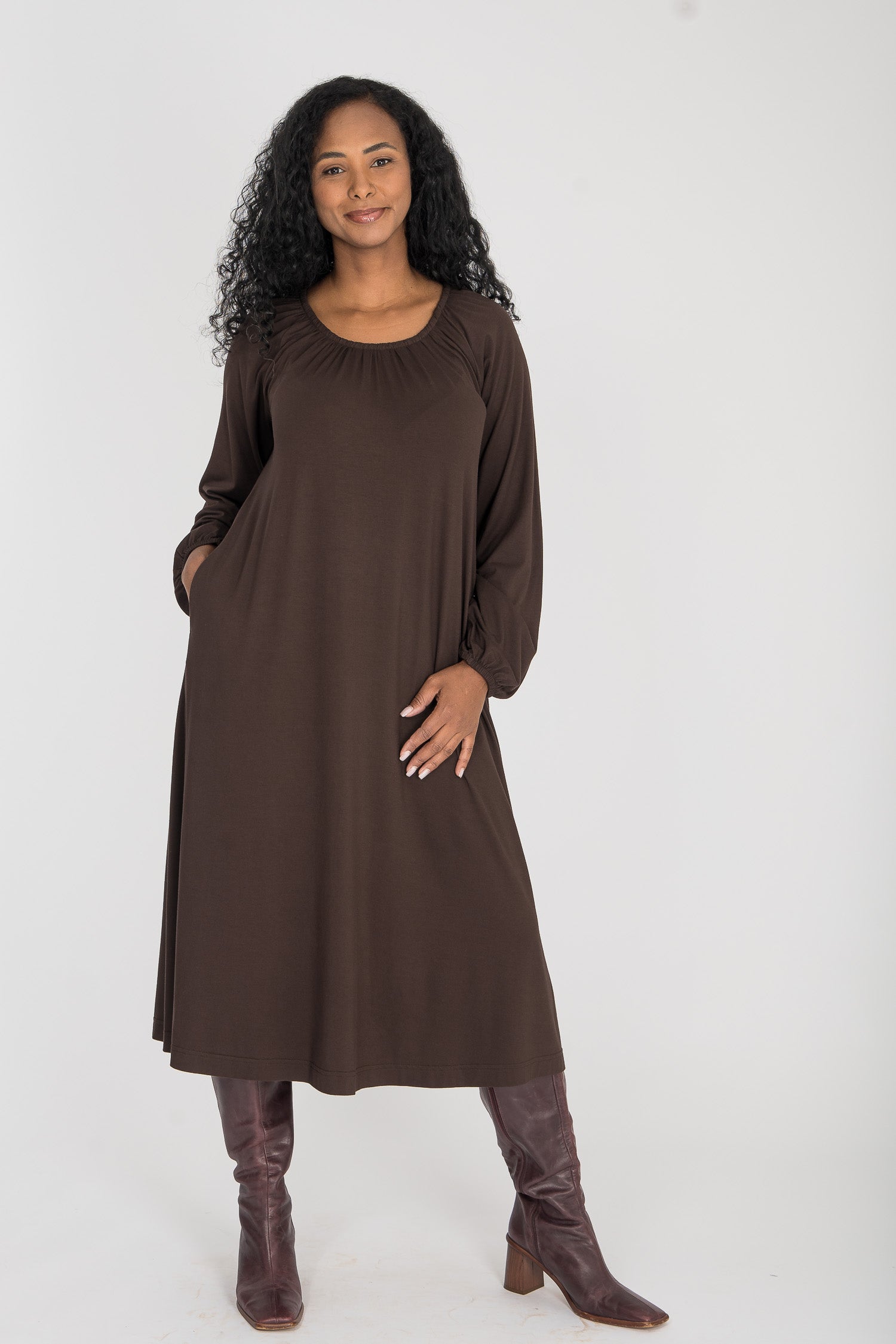 Omlottklänning med öppen omlott och knytband i sidan som knyts runt midjan och kan justeras för önskad silhuett. V-ringad överdel och figurnära ärm. Rundskuren kjol med generös vidd – vi snålar inte med tyg, vilket ger fint fall och inga glipor. Sys i stretchig viskos/elastan-trikå med tungt fall.