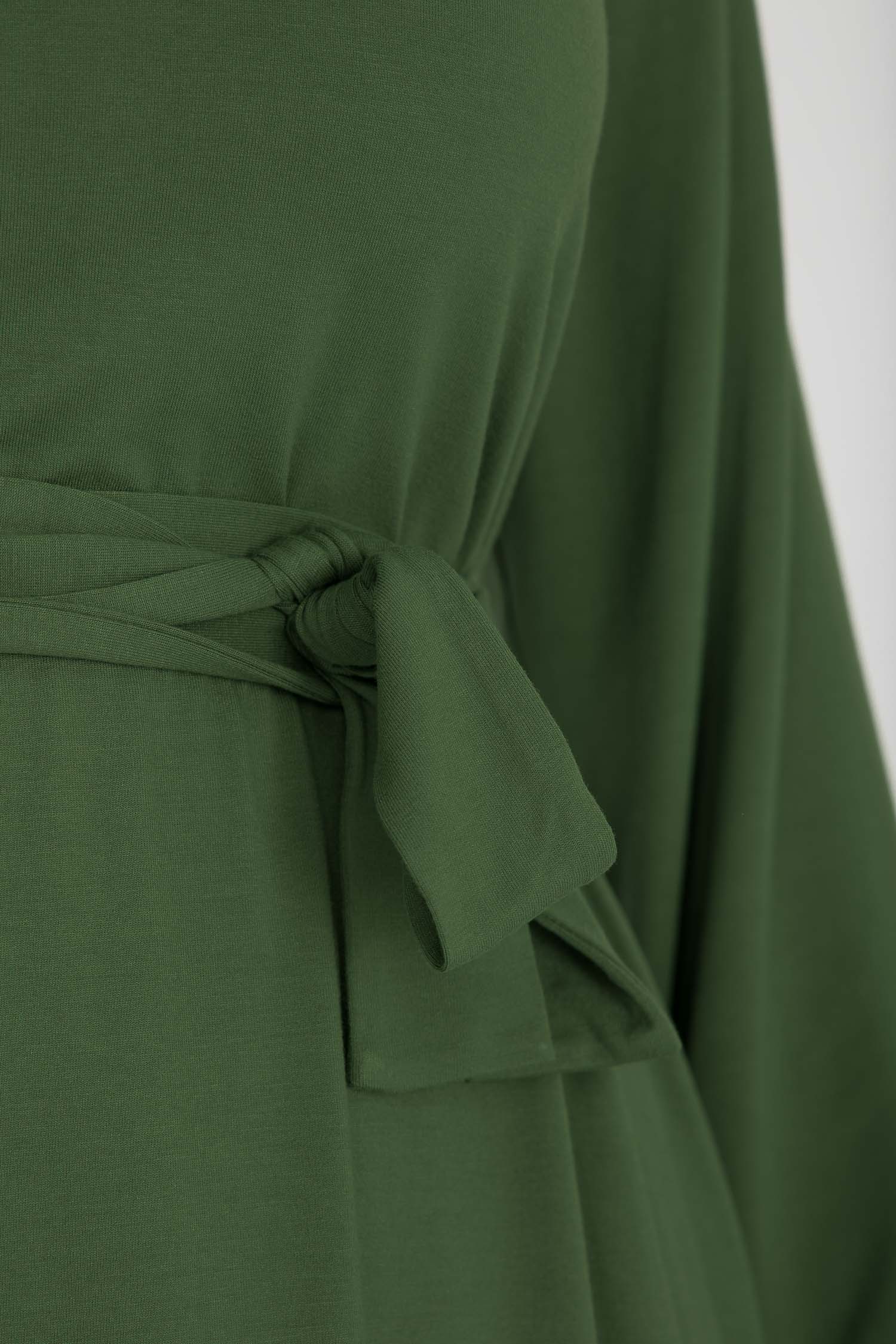 A-lined belted är vår A-linjeformade klänning i mjuk, stretchig trikå med ett tungt fall. Klänningsmodellen har en ledig passform och fickor i sidorna. Halsringningen är rundad med rynk och de långa raglanärmarna är vida med rynk nertill. Klänningen kommer med ett löst knytband som kan användas om du vill markera midjan. På bilderna syns den både med och utan bälte.