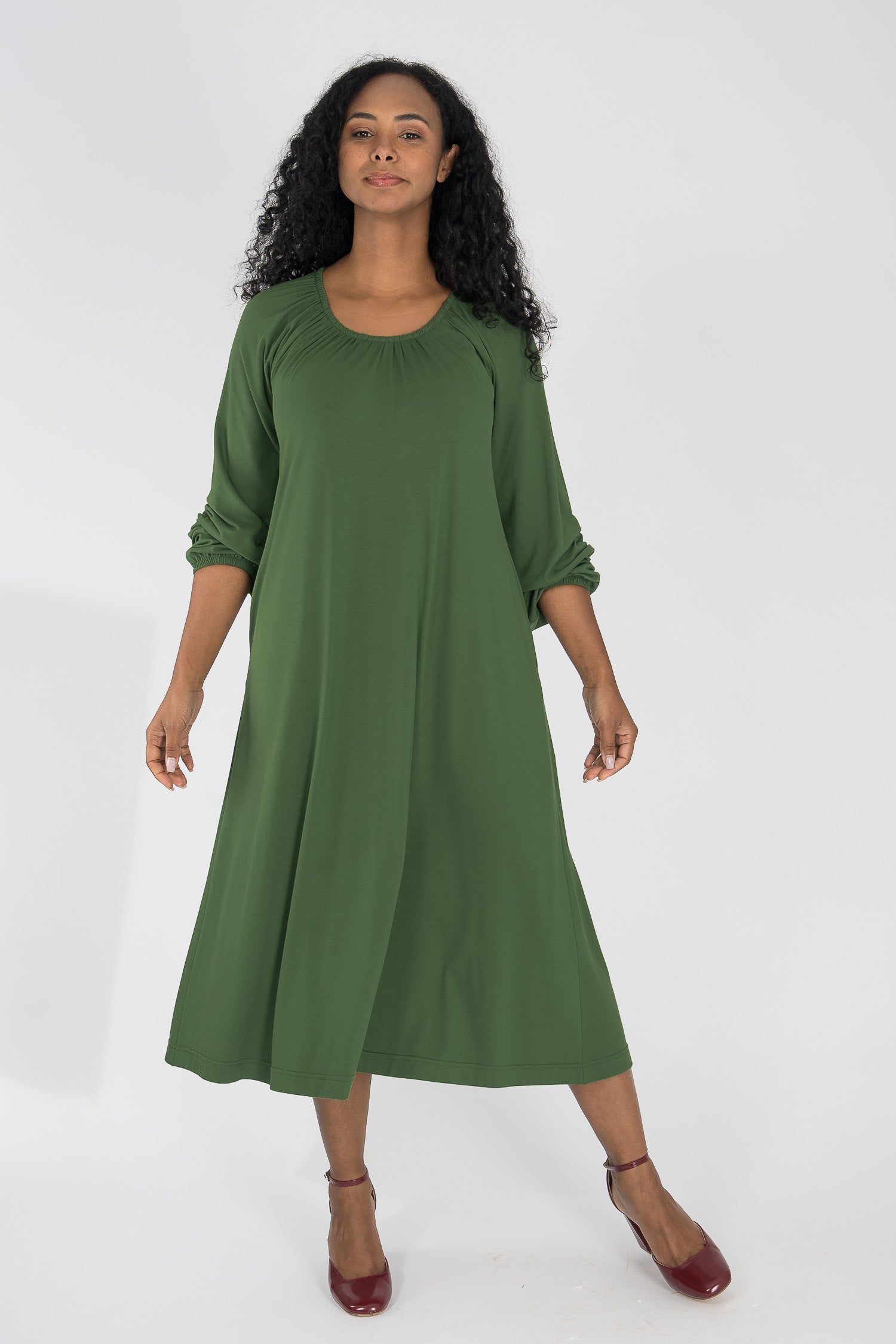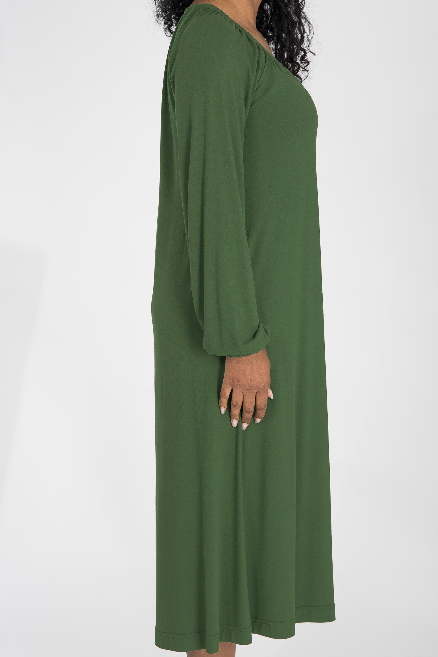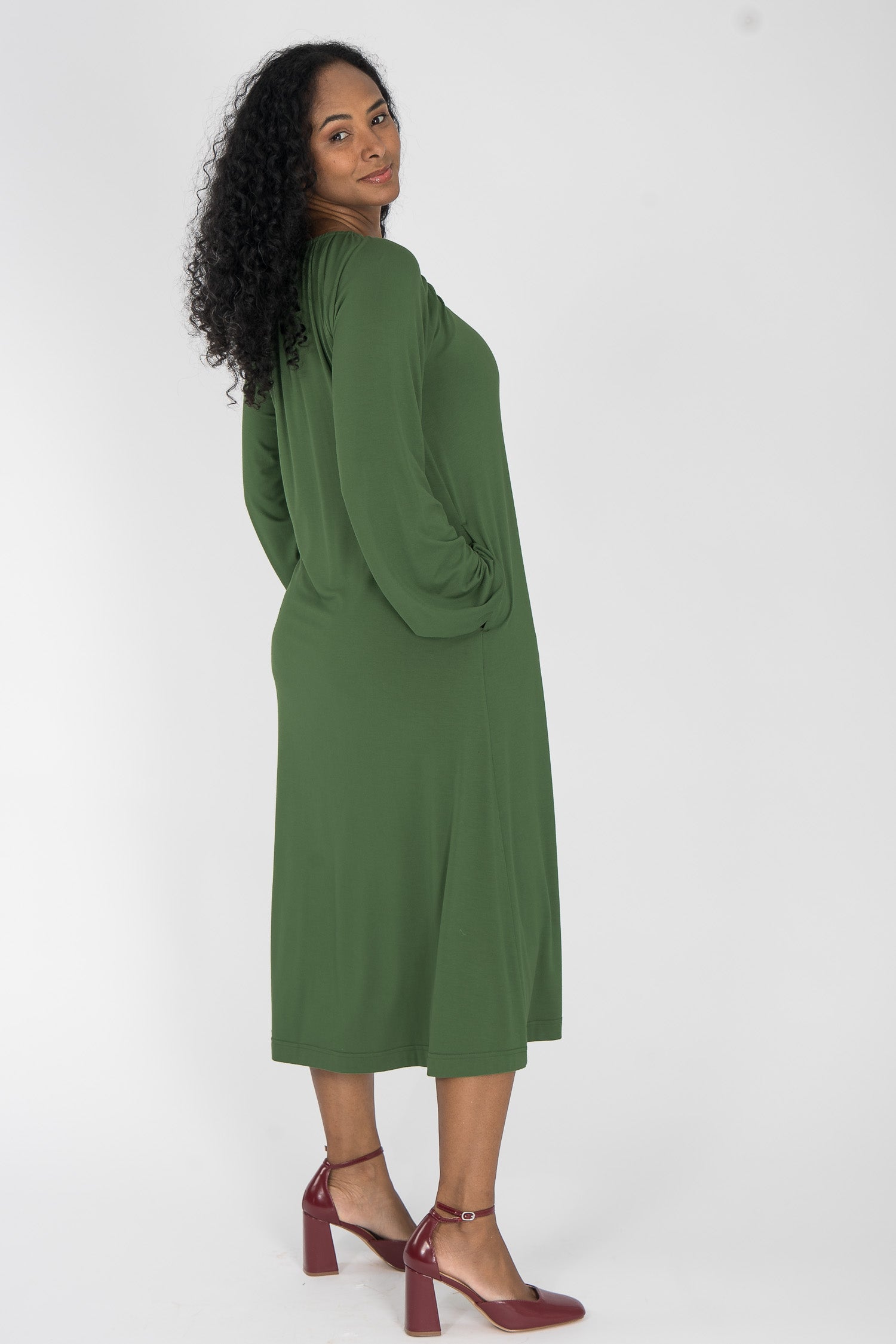 Klänningen är sydd i en hållbart tillverkad trikå av högkvalitativ Vortex-viskos och elastan som känns mjuk, är följsam och behåller både form och färg tvätt efter tvätt. En klänning som är enkel att använda ofta, och som fungerar lika bra till vardag som till mer uppklädda tillfällen.