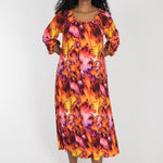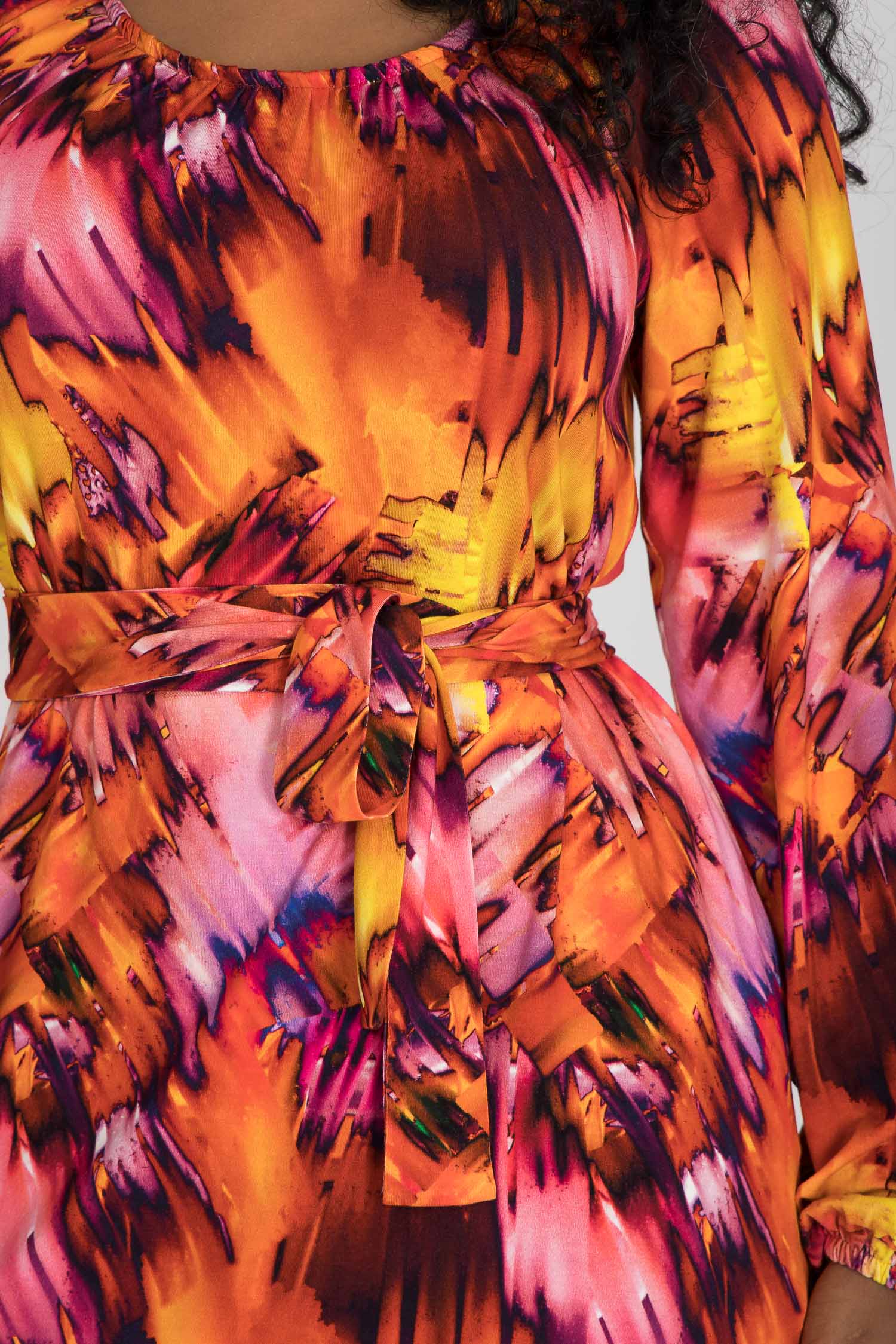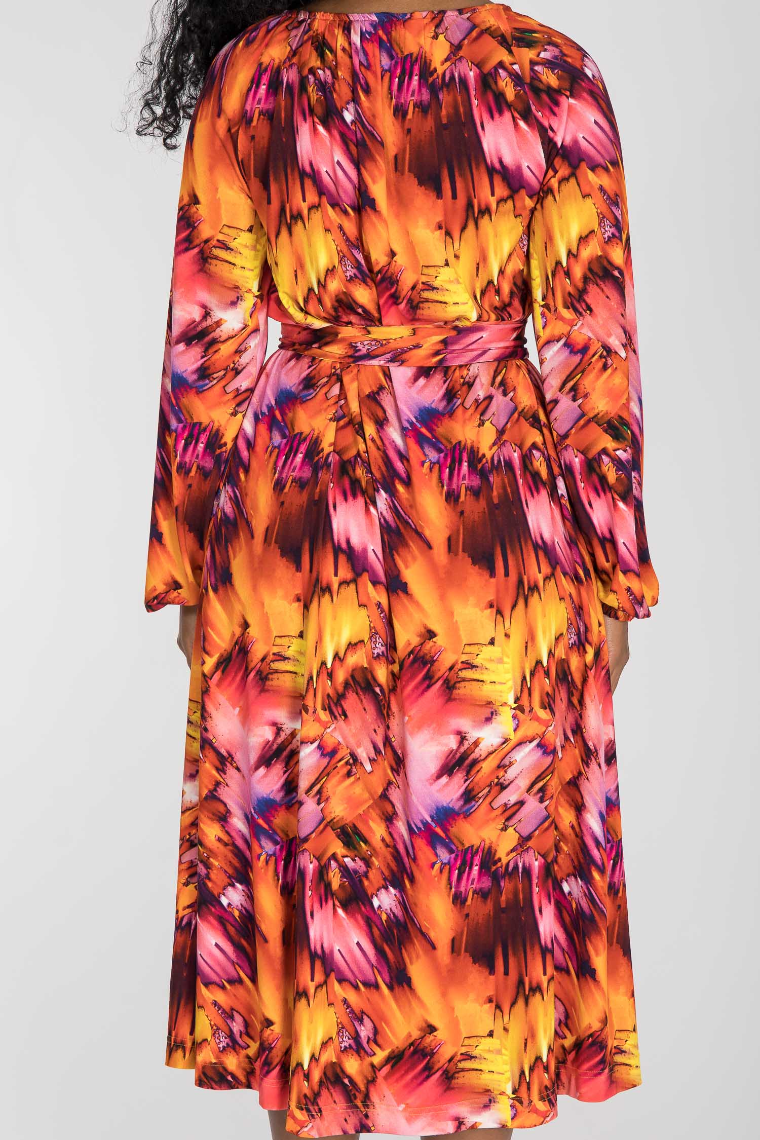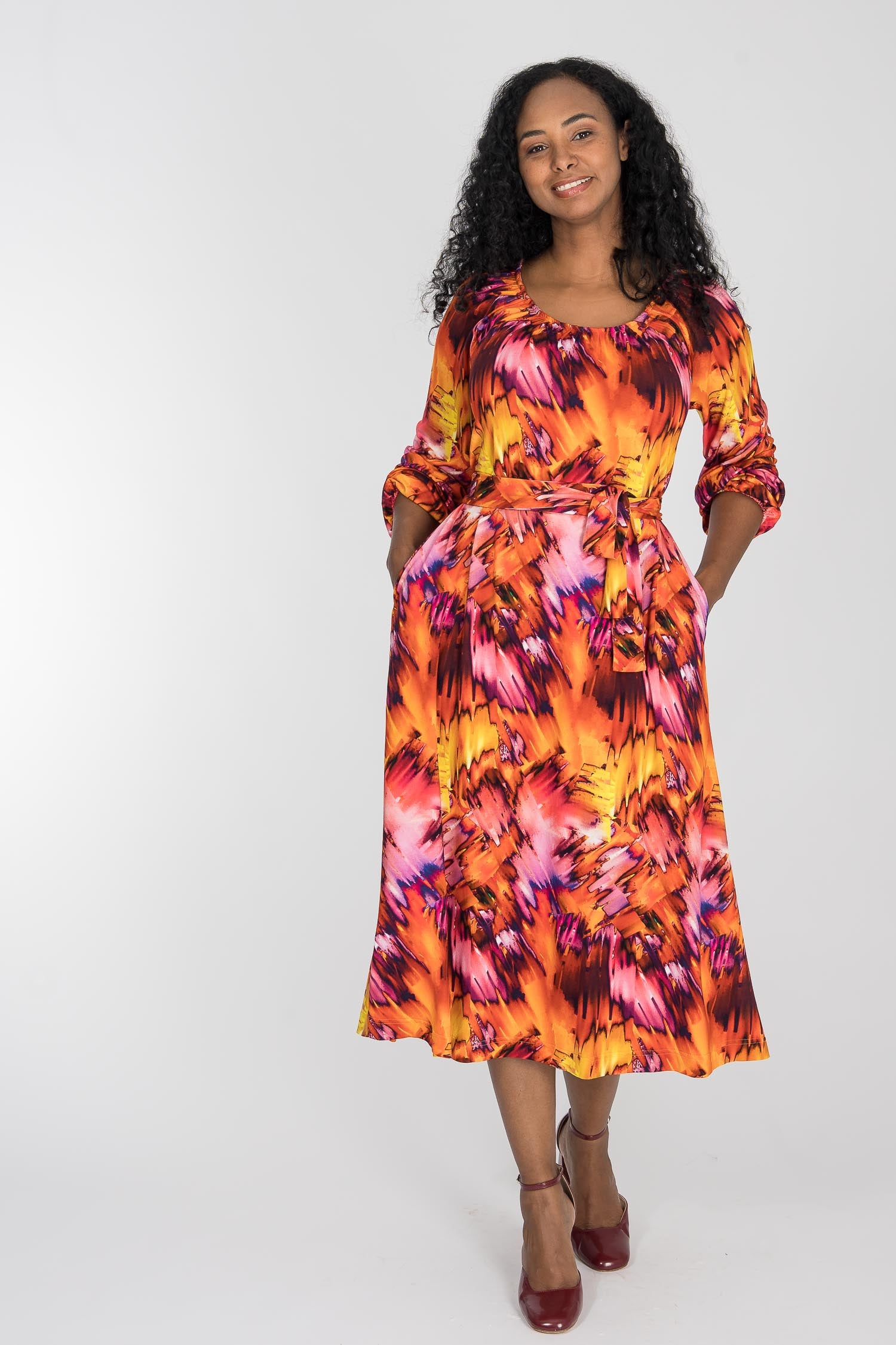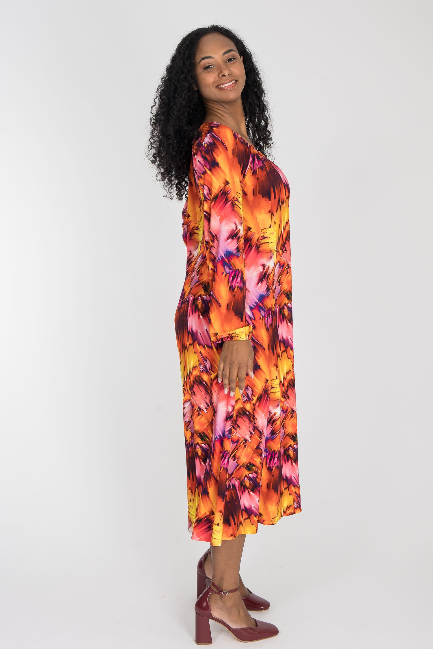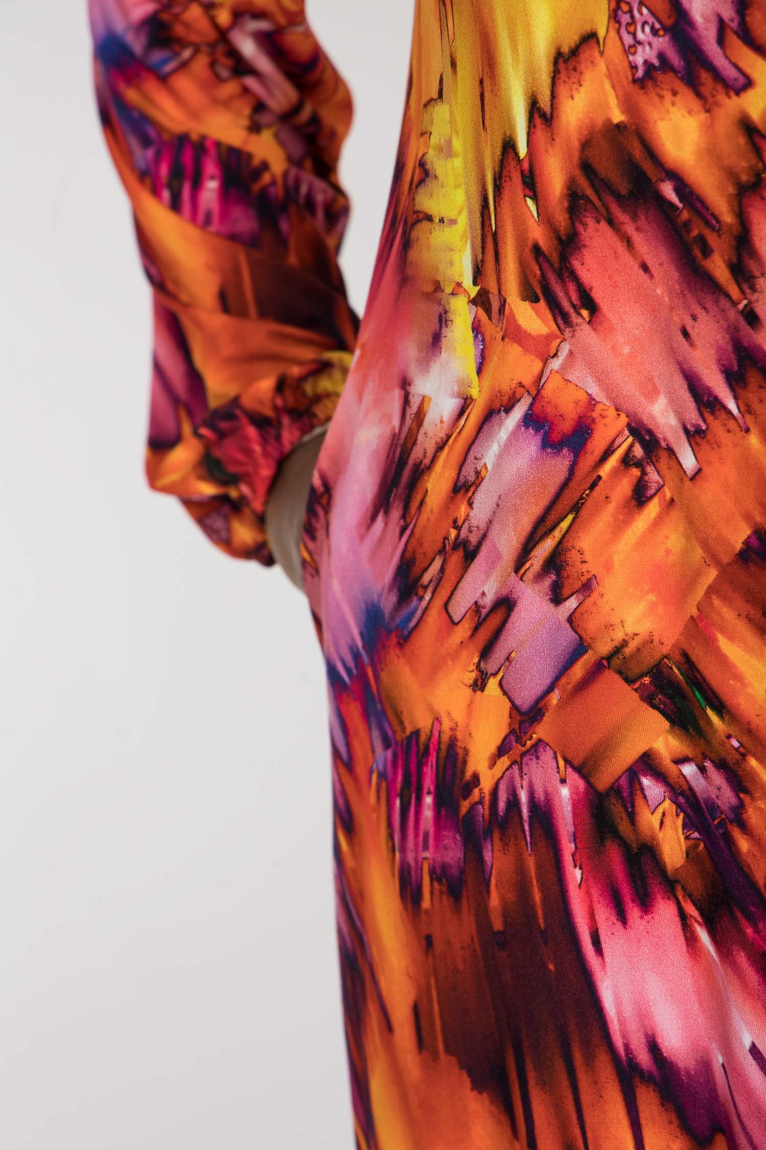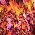 Mönstret bjuder på en varm mix av orange, rosa, lila och en hint av gult – färger som tillsammans ger en livfull känsla utan att ta över.