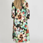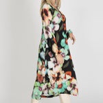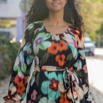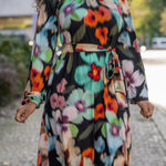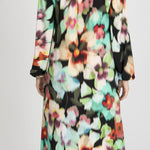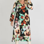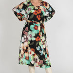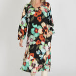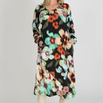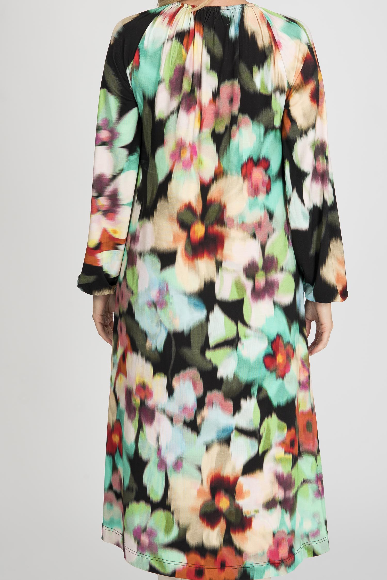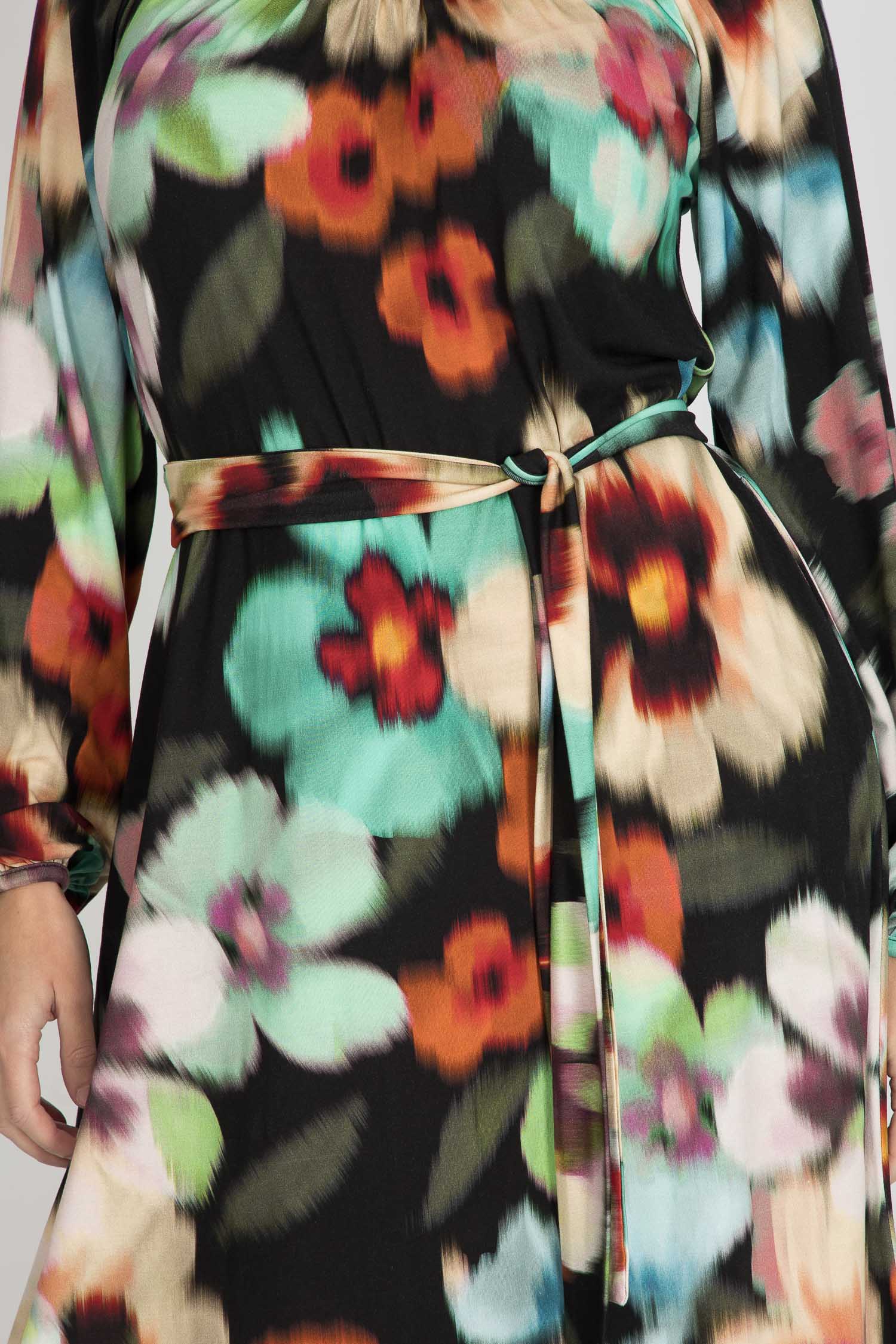 Vår nya A-linjeformade klänning, A-lined belted, är tillverkad i mjuk, stretchig trikå med ett tungt fall. Tyget har ett Blurred florals-mönster i pigga färger på en svart botten. Klänningen har en avslappnad passform och praktiska fickor i sidorna. Den rundhalsade designen med rynk och de vida, långa raglanärmarna ger en bekväm och stilfull look. Vill du markera midjan? Ett löst knytband medföljer, så du enkelt kan anpassa looken efter dina önskemål.