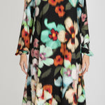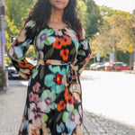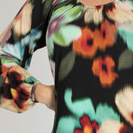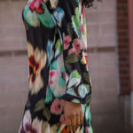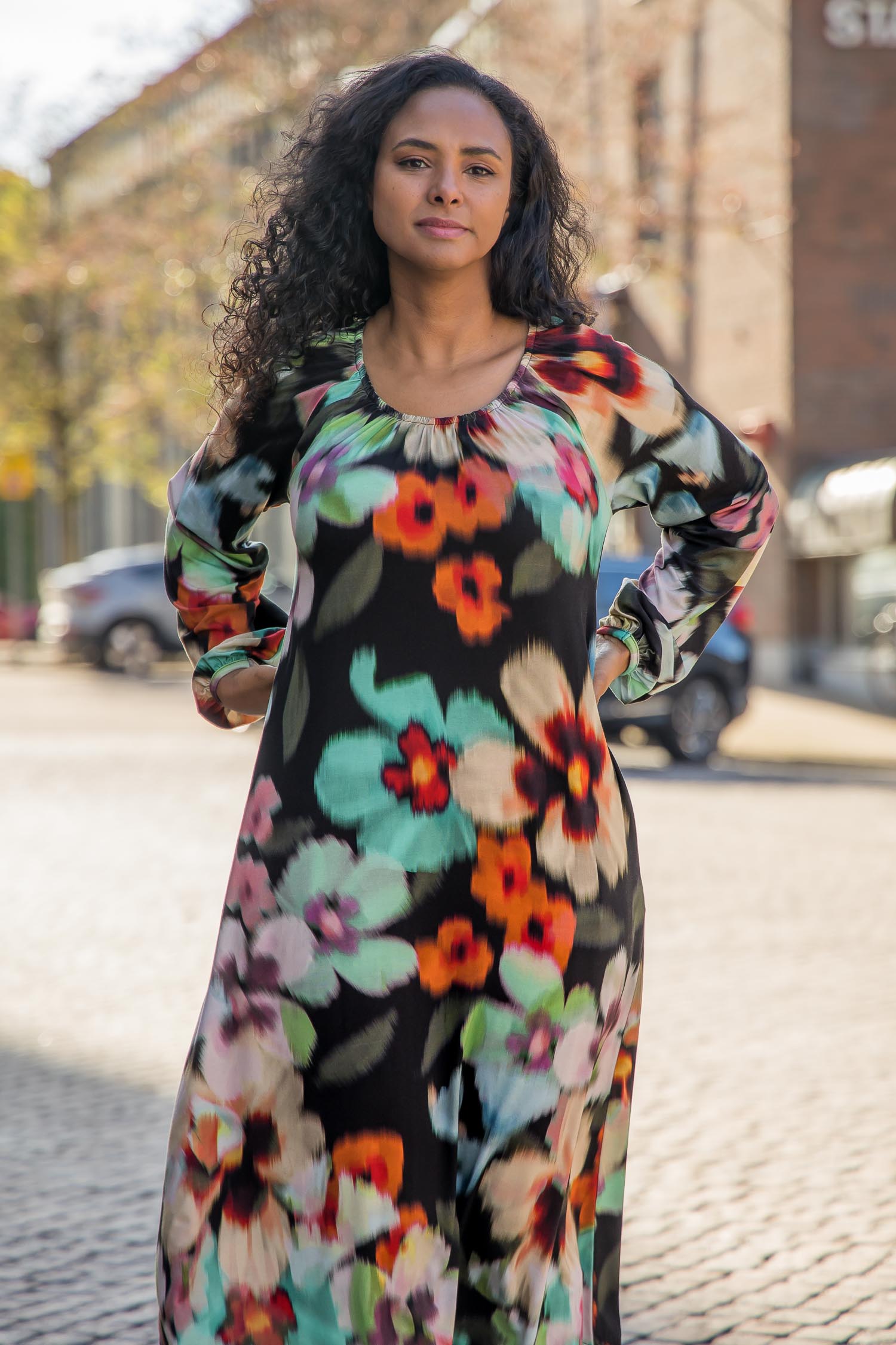 Detta klänningsmönster har en svart botten som ger en elegant grund, med livfulla inslag av turkost, orange, ljusbeige och mjuka rosa toner. De klara och varma färgerna gör det perfekt för en klänning som harmoniserar med din färgpalett.