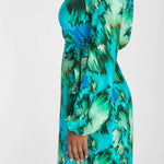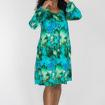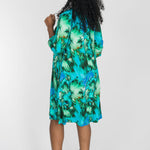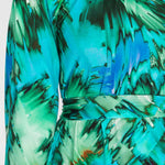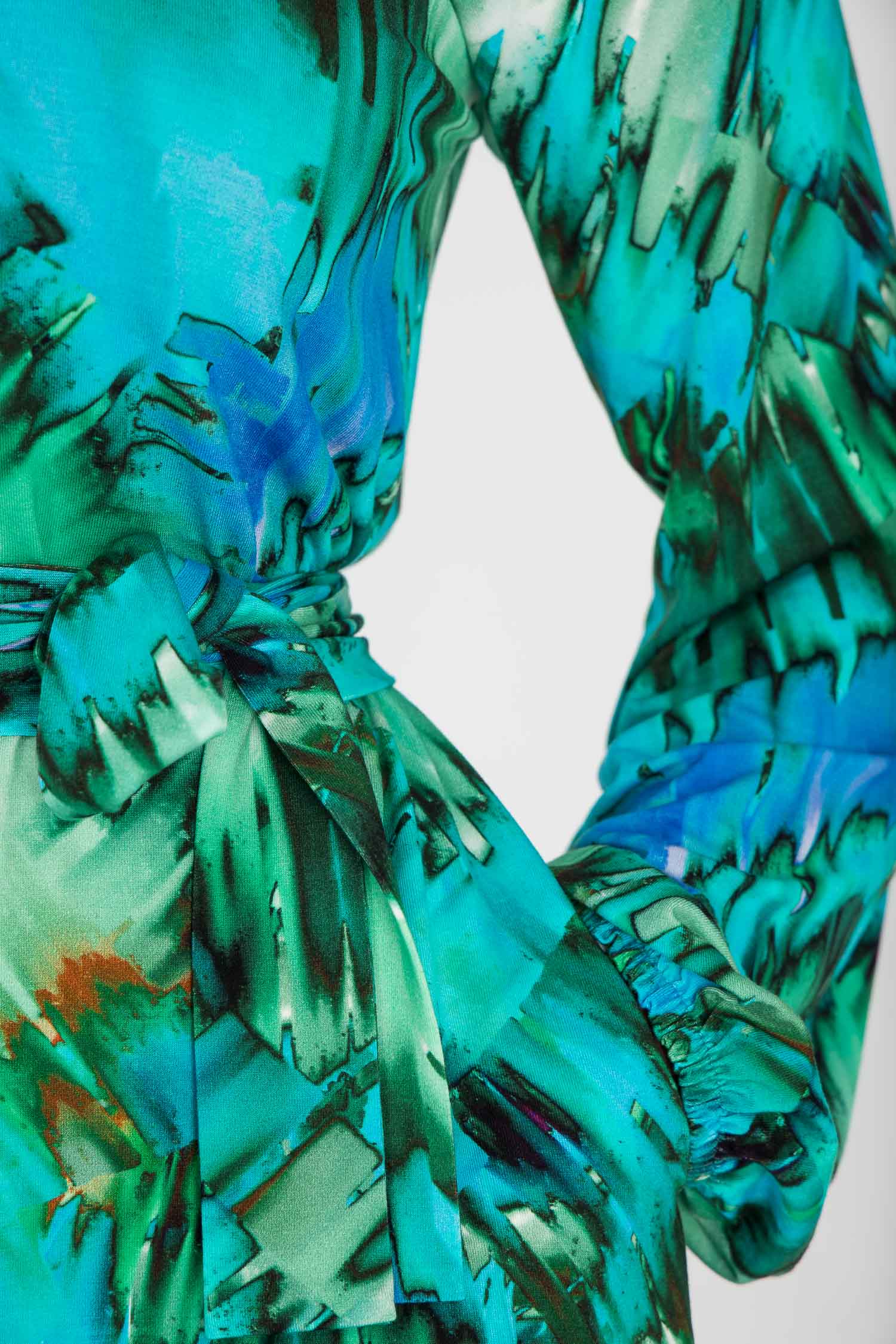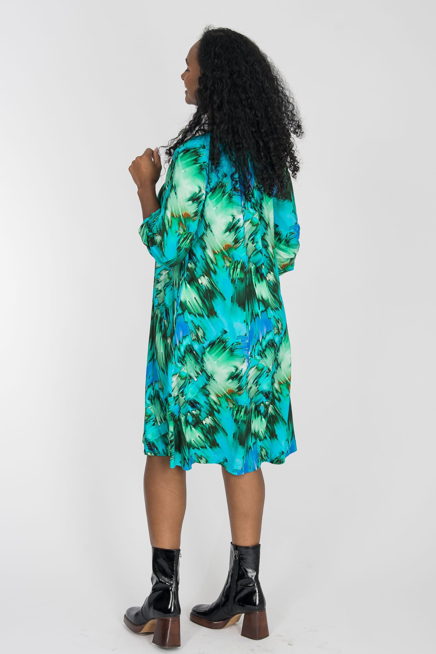 Mönstret rör sig i nyanser av turkos, grönt, blått och mjuka inslag av brunt – en färgkombination som är både pigg och harmonisk på samma gång.