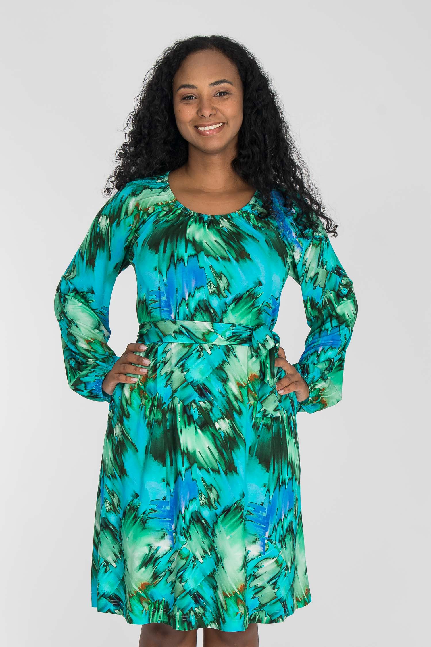 A-lined belted är vår A-linjeformade klänning i mjuk, stretchig trikå med ett tungt fall. Modellen har en ledig passform, fickor i sidorna och en rundad halsringning med rynk. De långa raglanärmarna är vida och avslutas med rynk vid handleden. Till klänningen följer ett löst knytband – perfekt om du vill markera midjan, men lika fin är den helt utan.