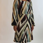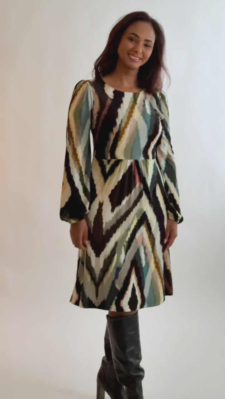 Tyget har ett grafiskt mönster i oliv, beige och svarta toner med inslag av rost och ljusblått – en färgskala som känns elegant året runt. Everyday dress är sydd i mjuk och stretchig trikå av Vortex-viskos och elastan, en premiumtrikå med tungt fall som följer kroppen på ett smickrande sätt och håller formen tvätt efter tvätt.