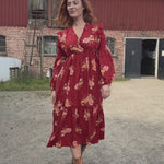 Kjolen är vid och avslutas med en bred volang nertill som ger klänningen ett vackert fall. Livet och kjolen är fodrade i tunn bomull för skön komfort och praktiska fickor i sidorna.