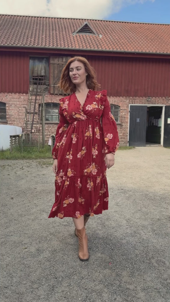 Här är en ny favorit i ekologisk bomull – en vadlång klänning i broderat och mönstrat tyg som ger en lyxig struktur och ett levande uttryck. Den V-ringade halsringningen går omlott och ramas in av små volanger, medan en bred volang löper runt axlarna både fram och bak för en romantisk känsla.