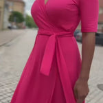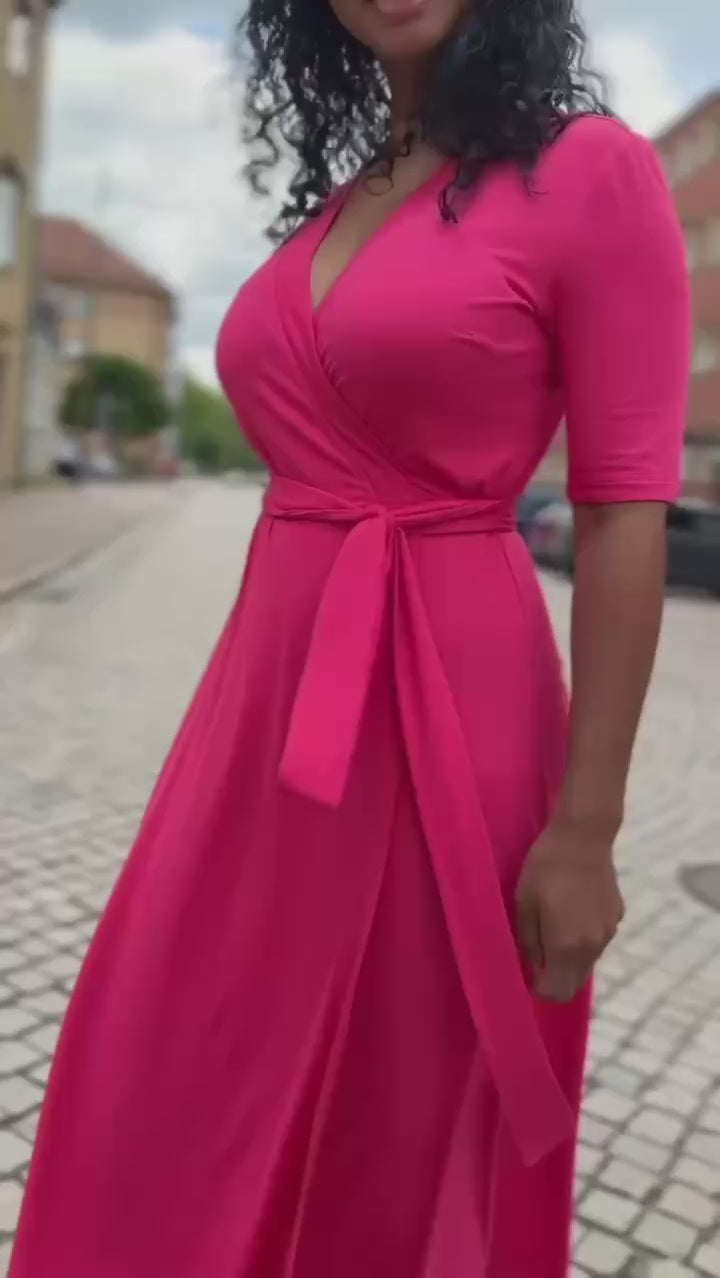 Omlottklänningar har en särskild plats i våra hjärtan, då de kombinerar smickrande siluetter med överlägsen komfort. Här är vår vadlånga modell, sydd i stretchig trikå med knyt i midjan och vidd i kjolen. Bestie wrap dress återkommer i vår kollektion och är en av våra mest omtyckta klänningar.