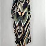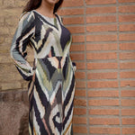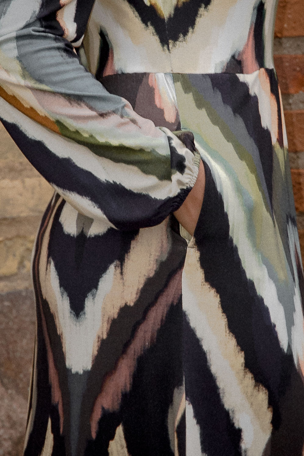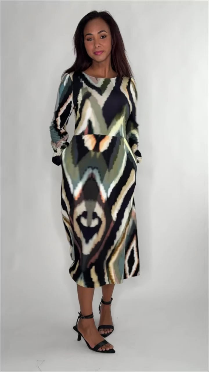Tyget har ett grafiskt mönster i oliv, beige och svarta toner med inslag av rost och ljusblått – en färgskala som känns elegant året runt. Everyday dress är sydd i mjuk och stretchig trikå av Vortex-viskos och elastan, en premiumtrikå med tungt fall som följer kroppen på ett smickrande sätt och håller formen tvätt efter tvätt.