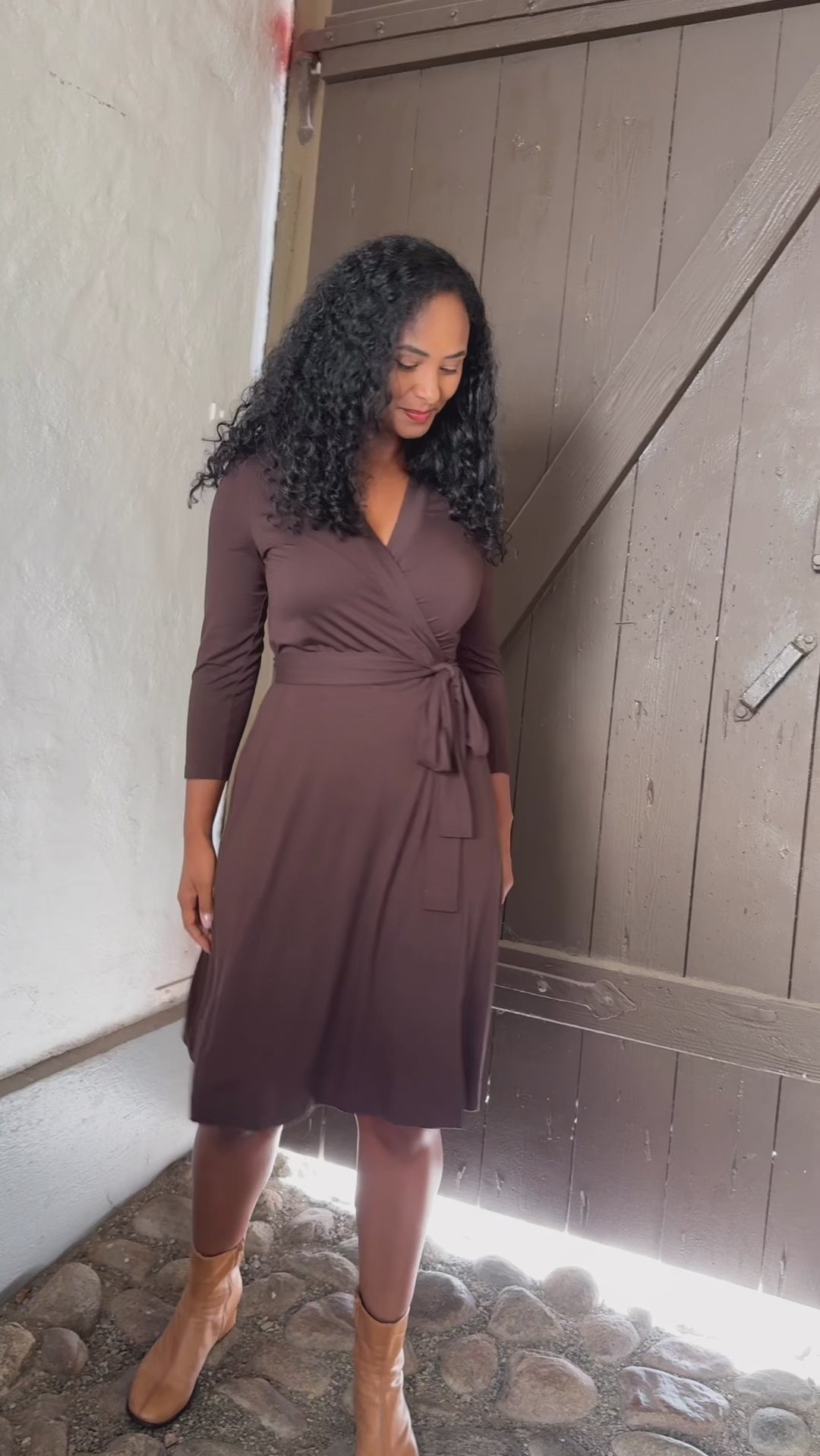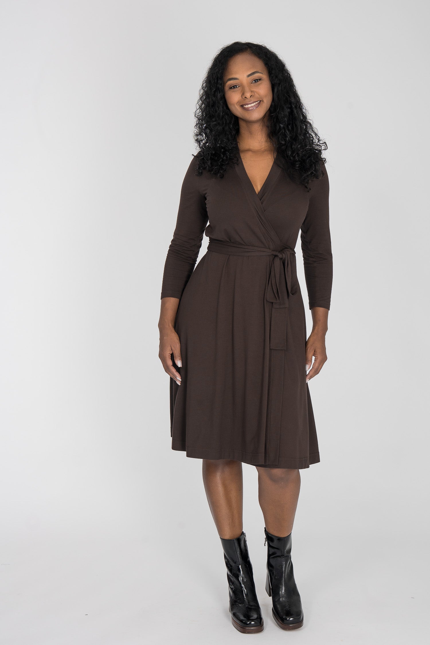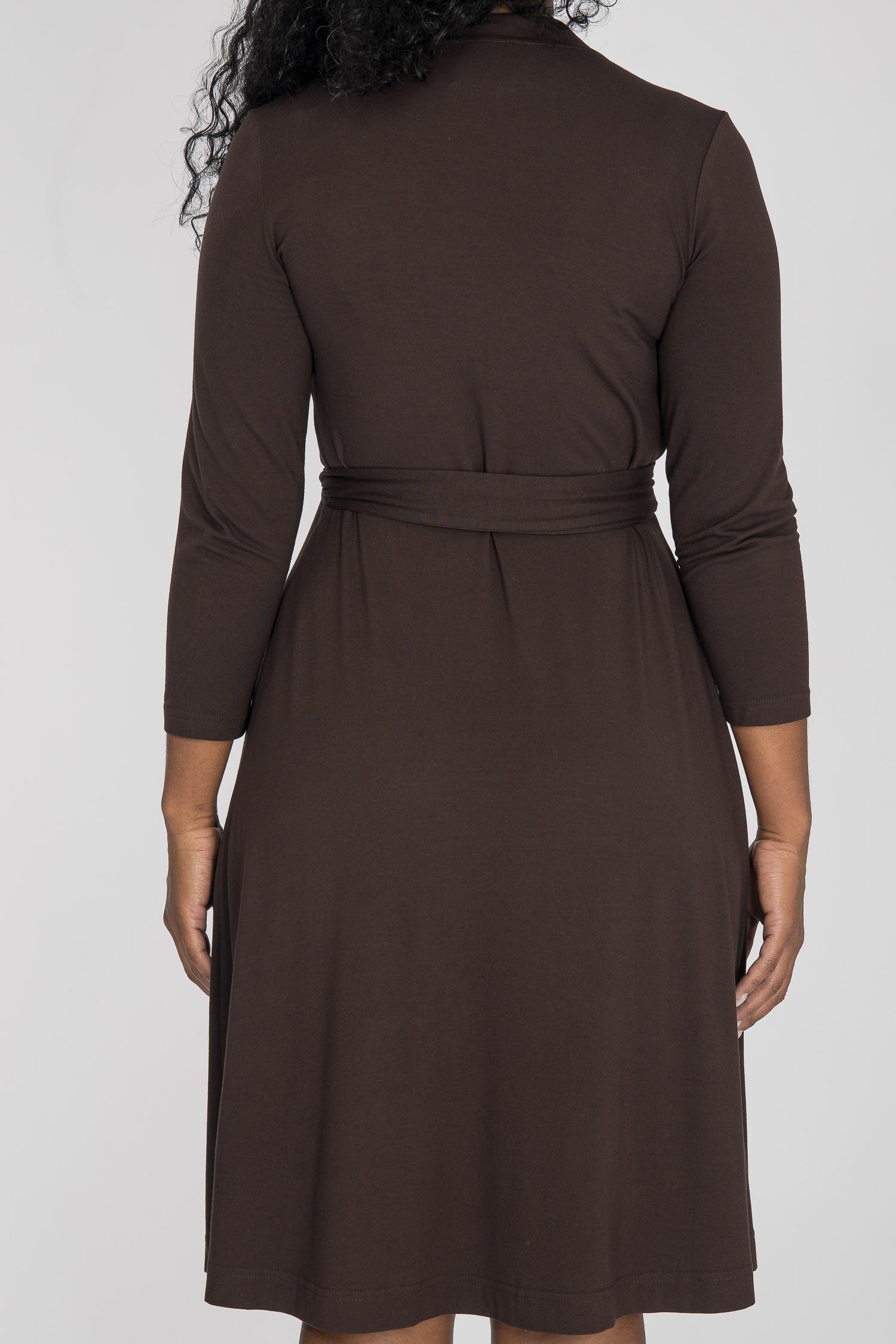 Knälång, brun omlottklänning i trikå