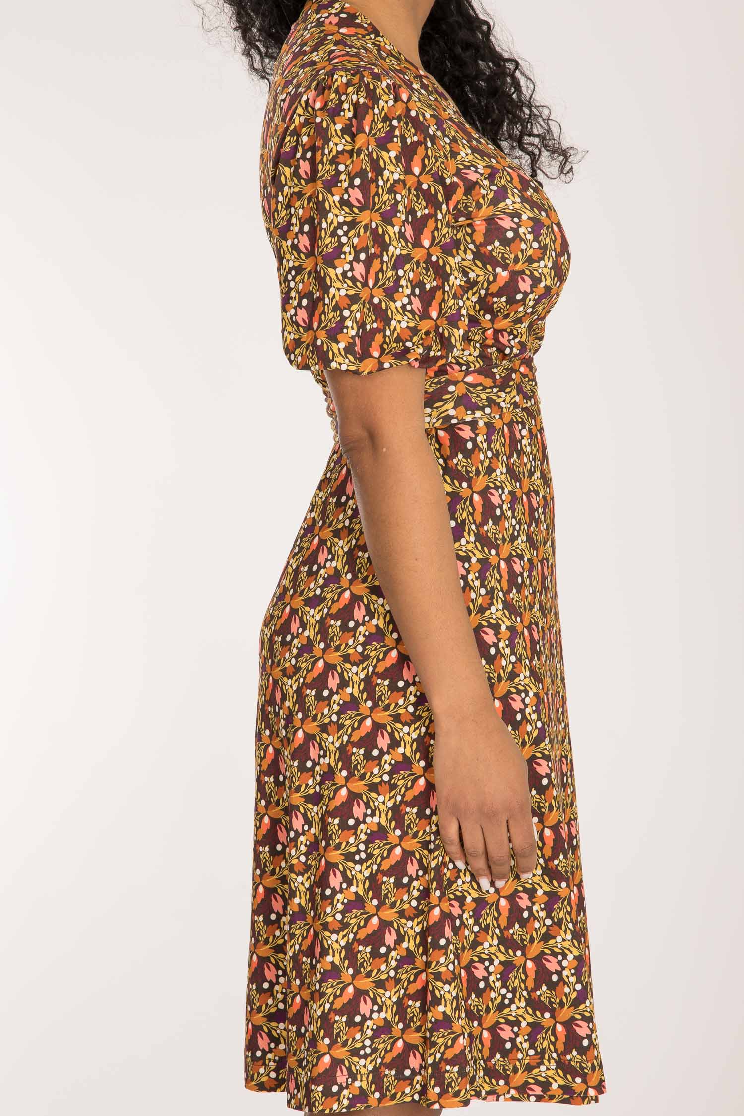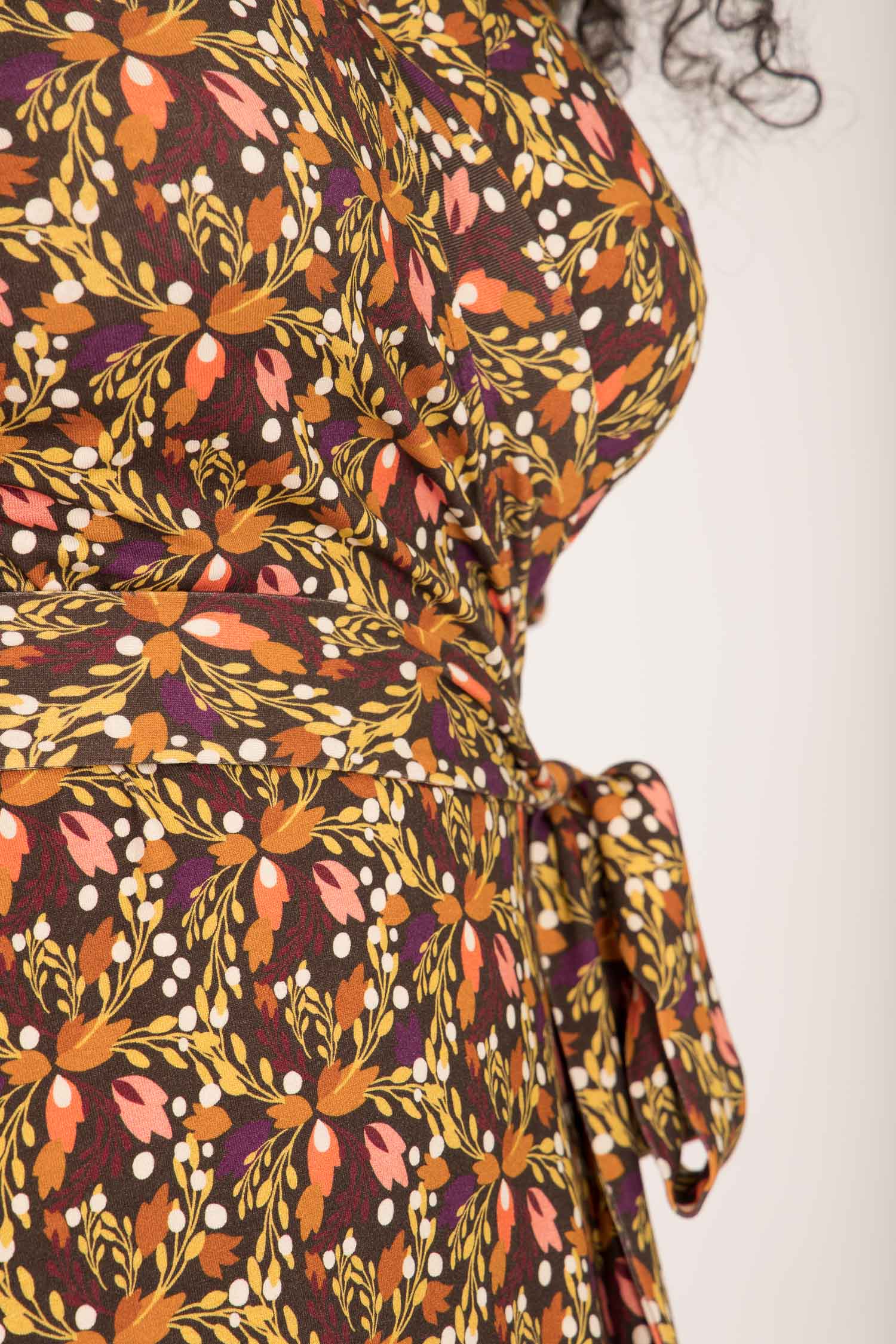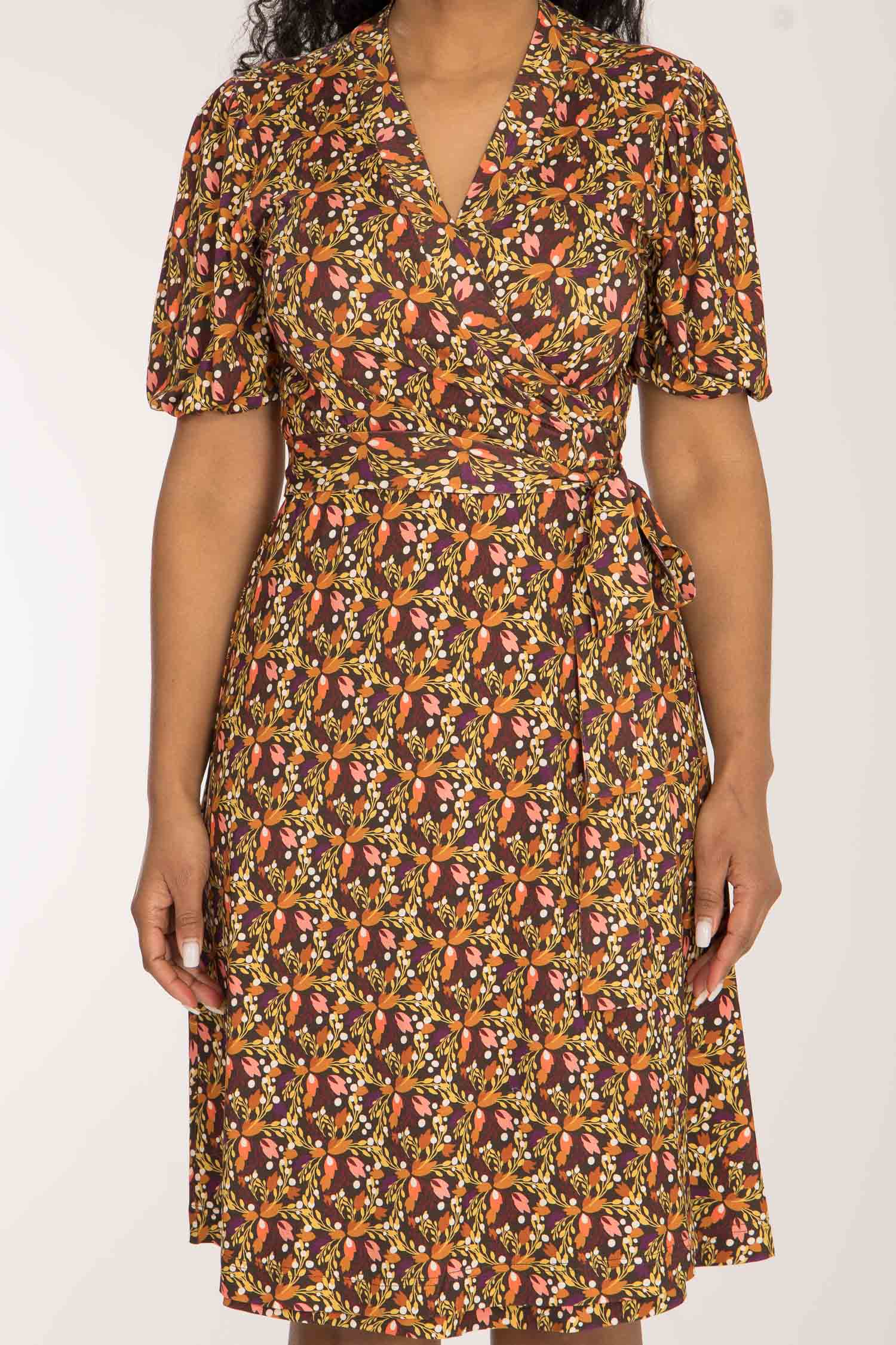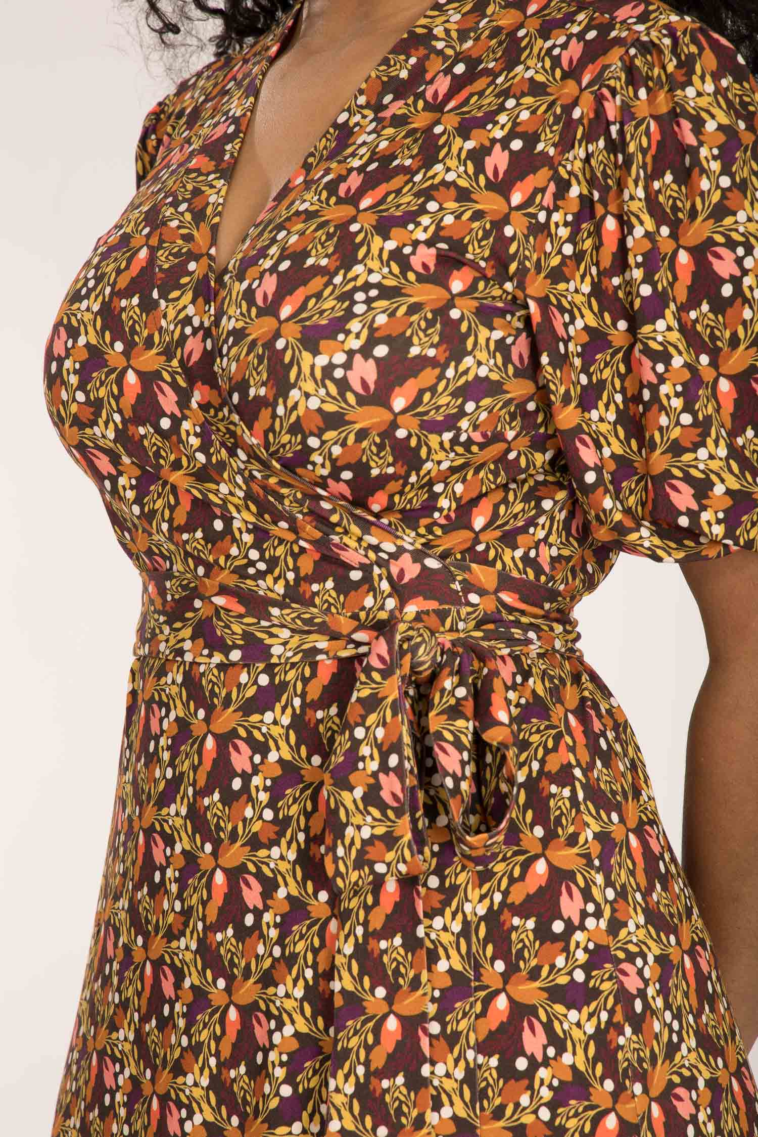 Den här omlottklänningen har en brun botten med ett vackert blommönster i rosa, orange, plommon och gult. Den är generöst skuren med mycket tyg som sveper runt kroppen och sluter fint vid nacken. Den rundskurna kjolen ger härlig vidd och ett elegant fall. De korta puffärmarna ger en feminin och somrig touch som gör klänningen perfekt för både vardag och fest.