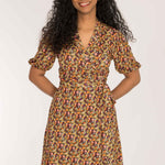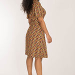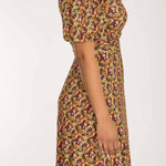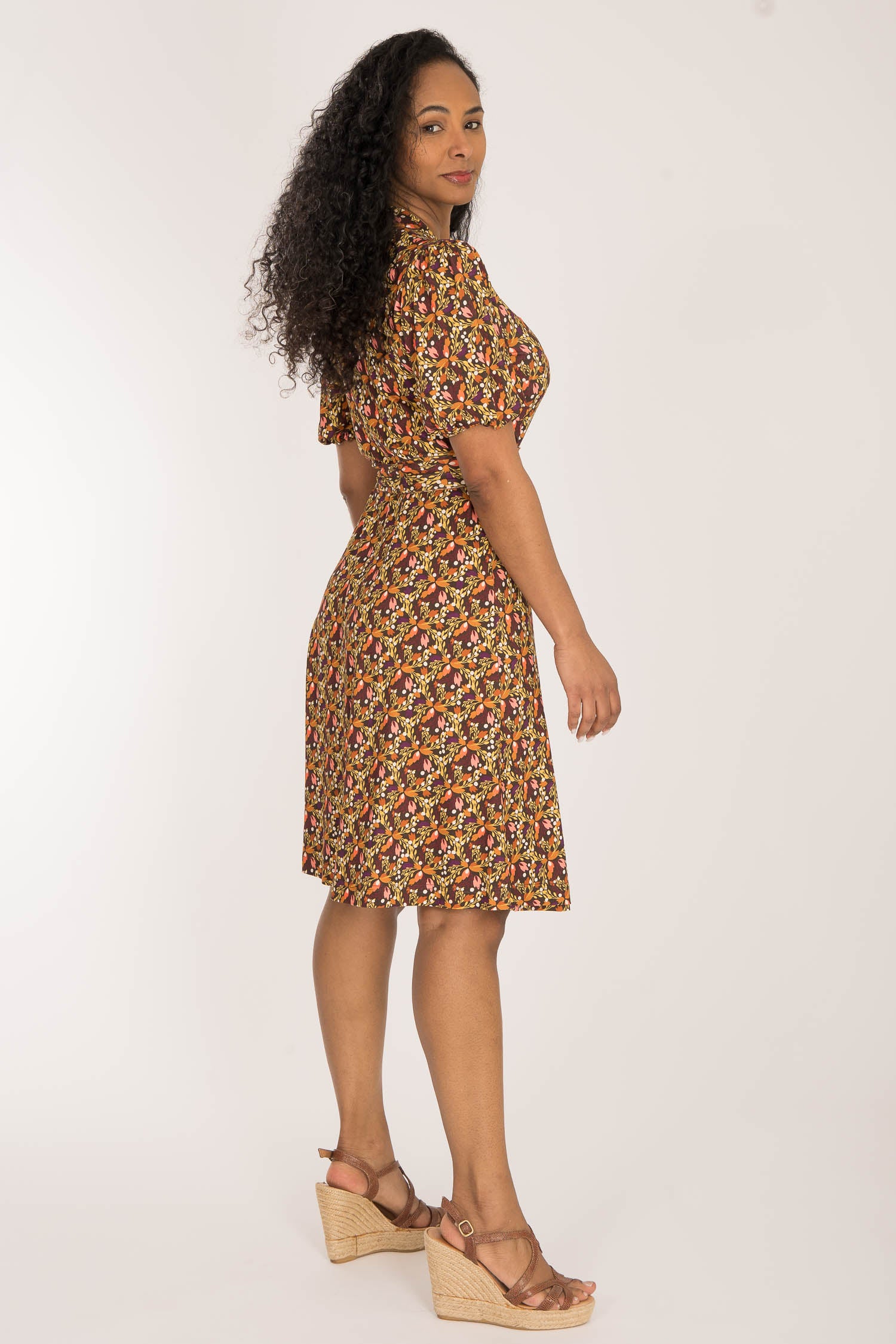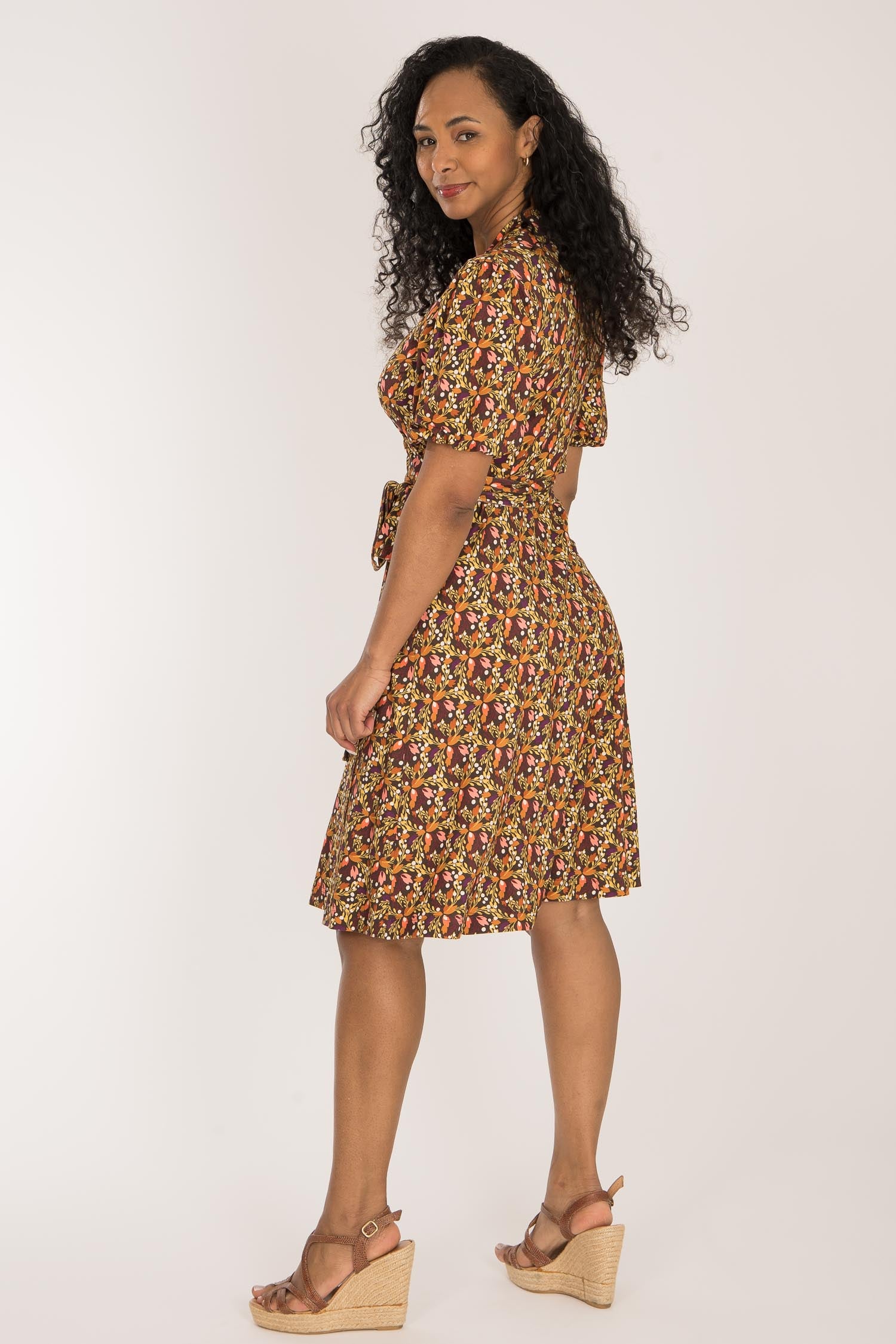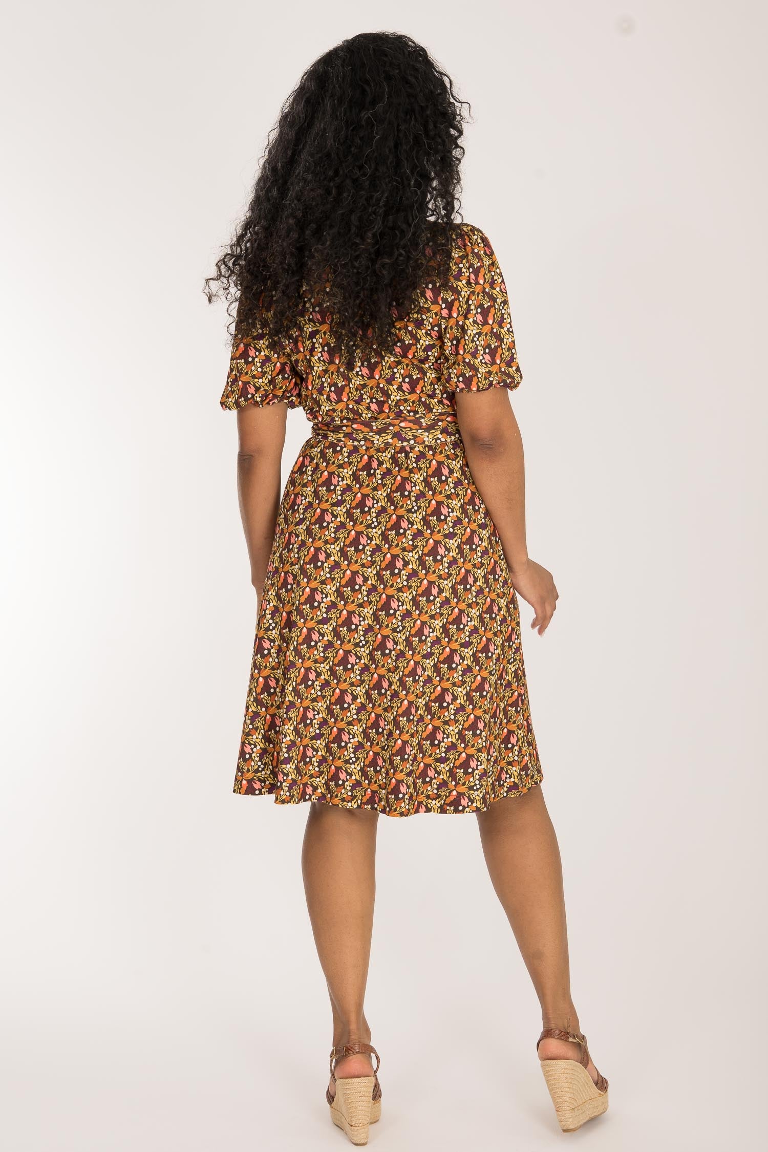 Den här omlottklänningen har en brun botten med ett vackert blommönster i rosa, orange, plommon och gult. Den är generöst skuren med mycket tyg som sveper runt kroppen och sluter fint vid nacken. Den rundskurna kjolen ger härlig vidd och ett elegant fall. De korta puffärmarna ger en feminin och somrig touch som gör klänningen perfekt för både vardag och fest.