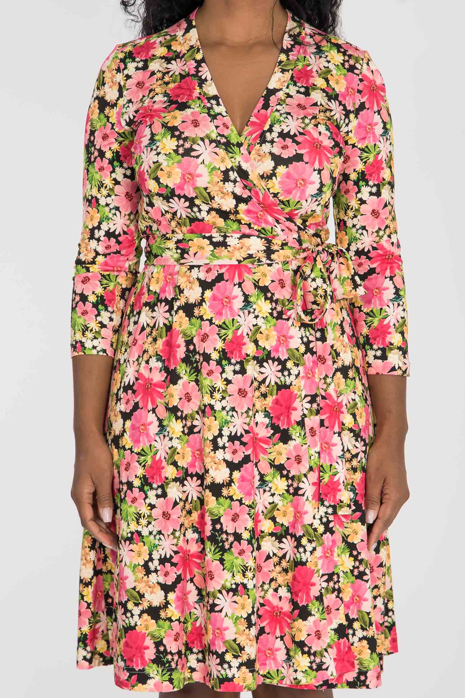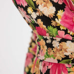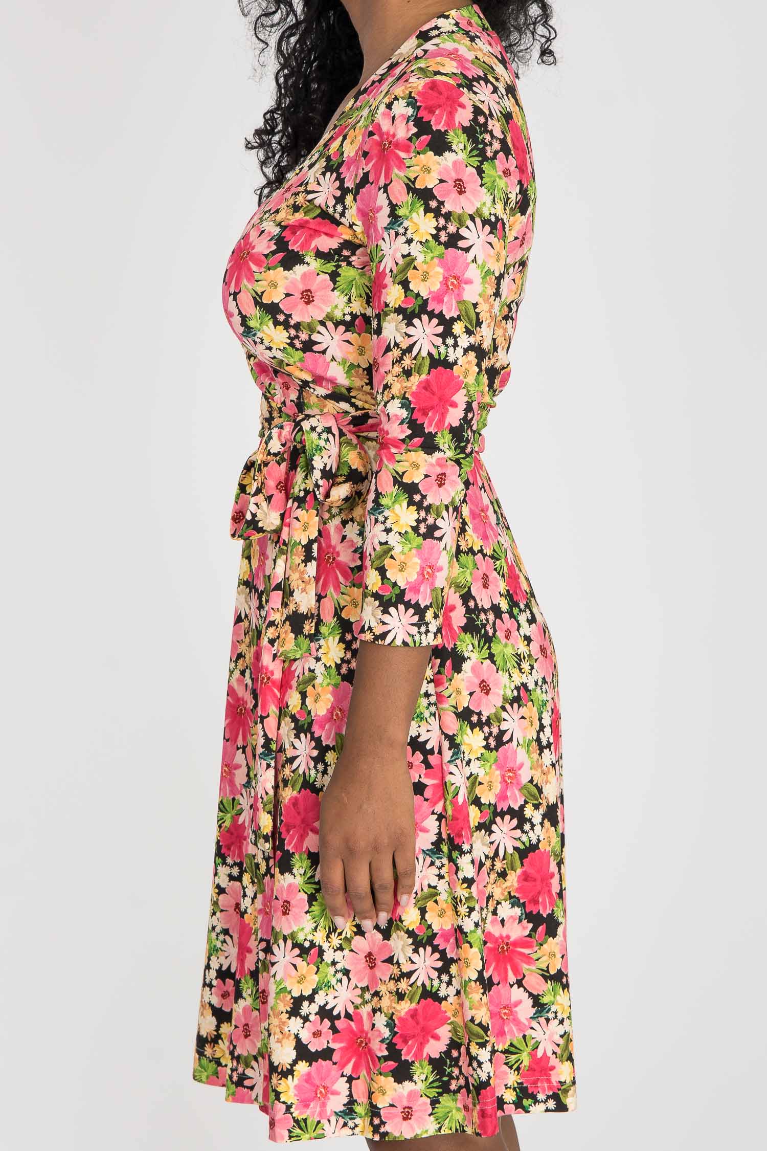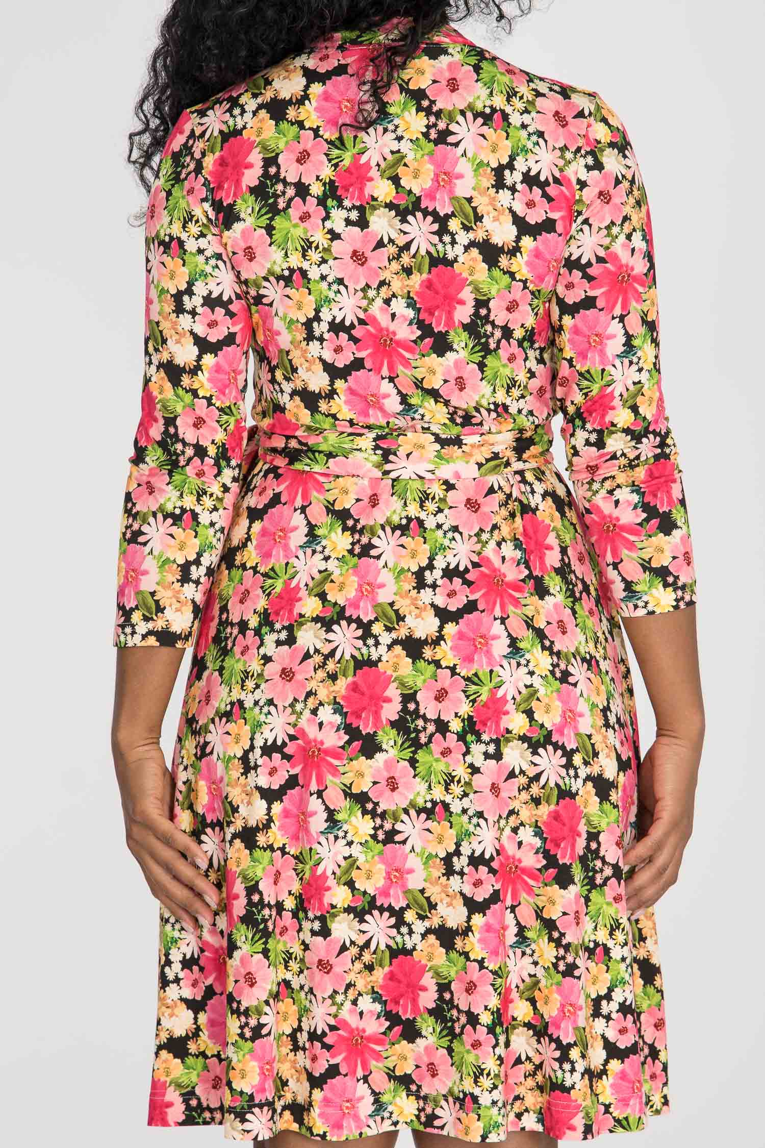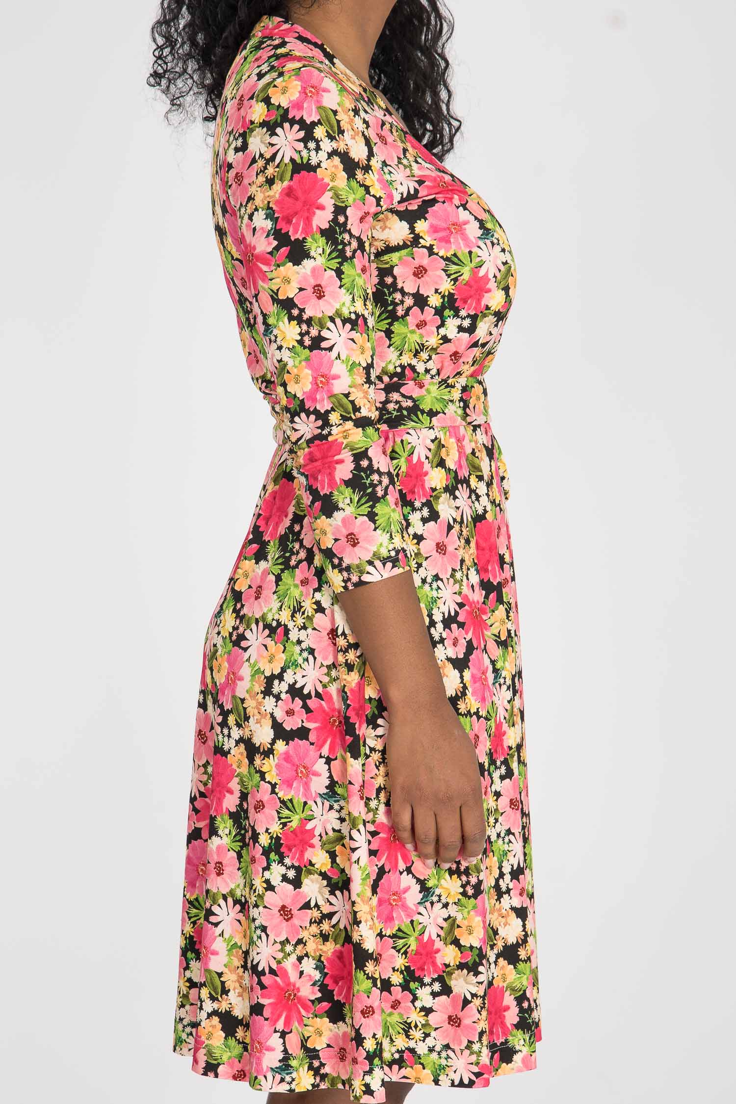 Mönstret är fullt av färgstarka blommor i rosa, gult och grönt på mörk botten – en klänning som piggar upp garderoben och funkar lika bra till vardags som när du vill klä upp dig lite extra.