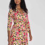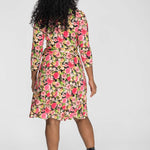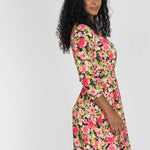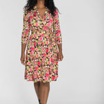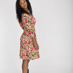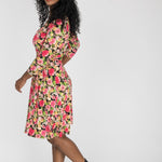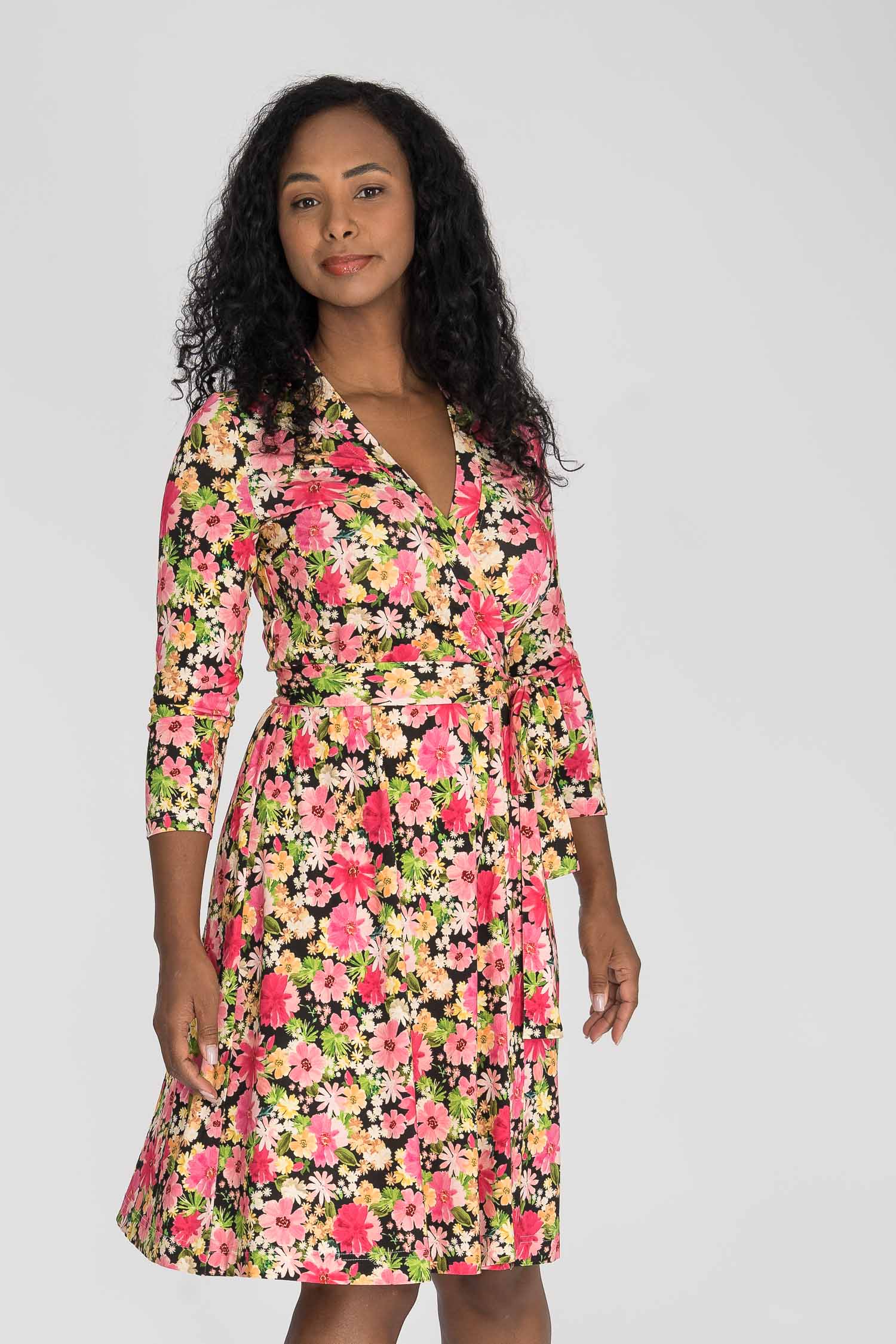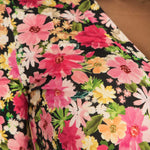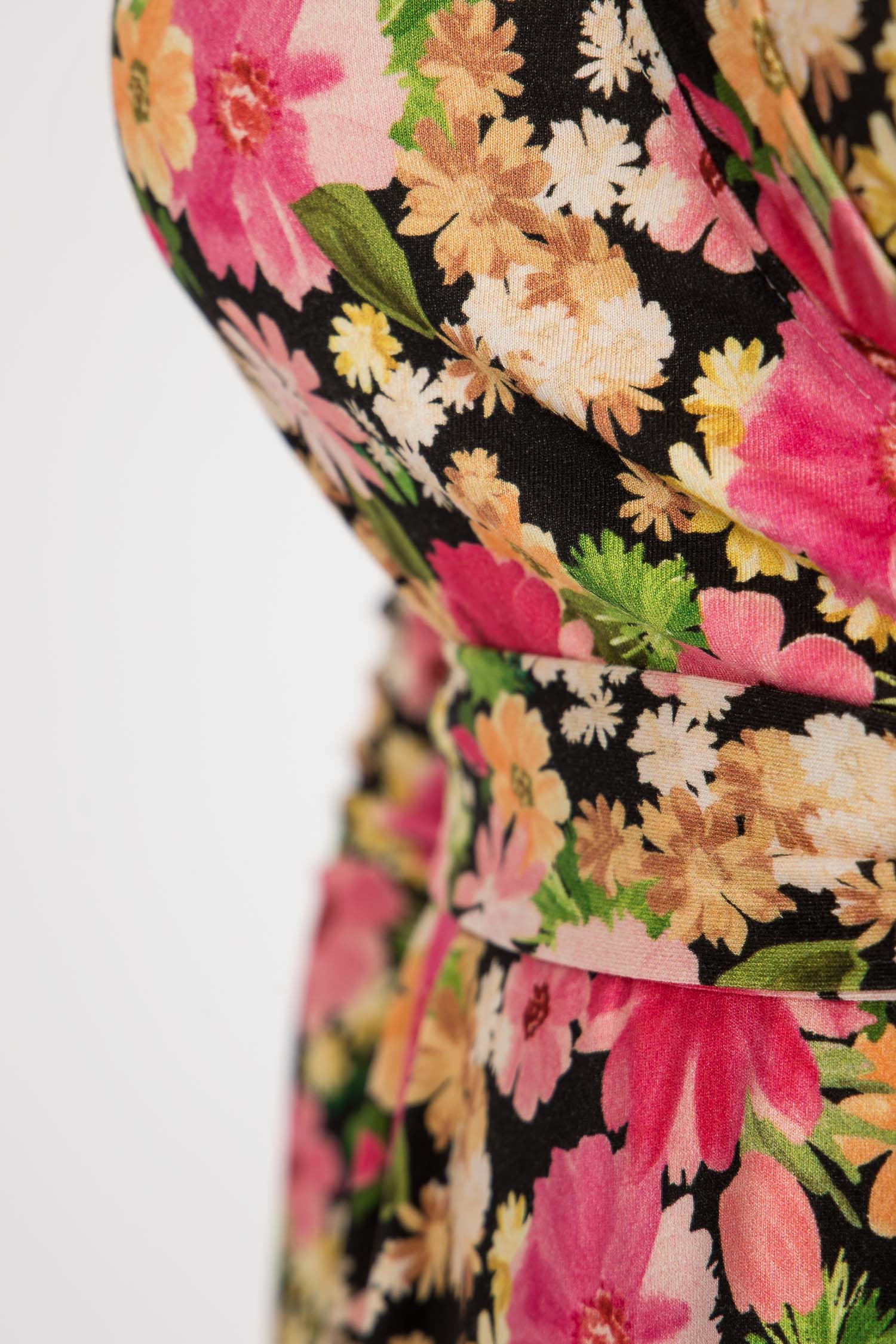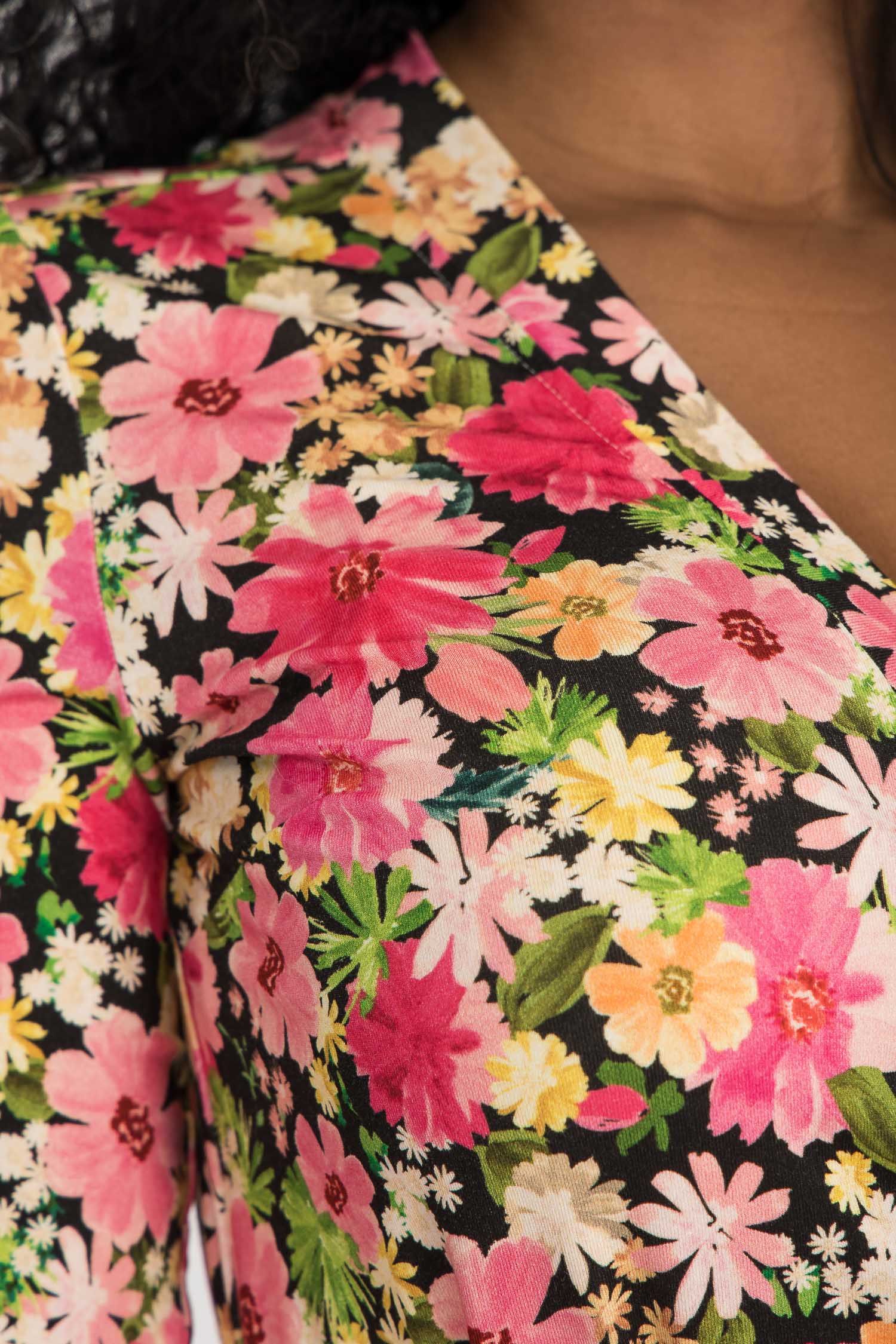 Mönstret är fullt av färgstarka blommor i rosa, gult och grönt på mörk botten – en klänning som piggar upp garderoben och funkar lika bra till vardags som när du vill klä upp dig lite extra.