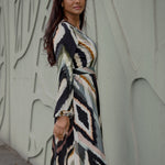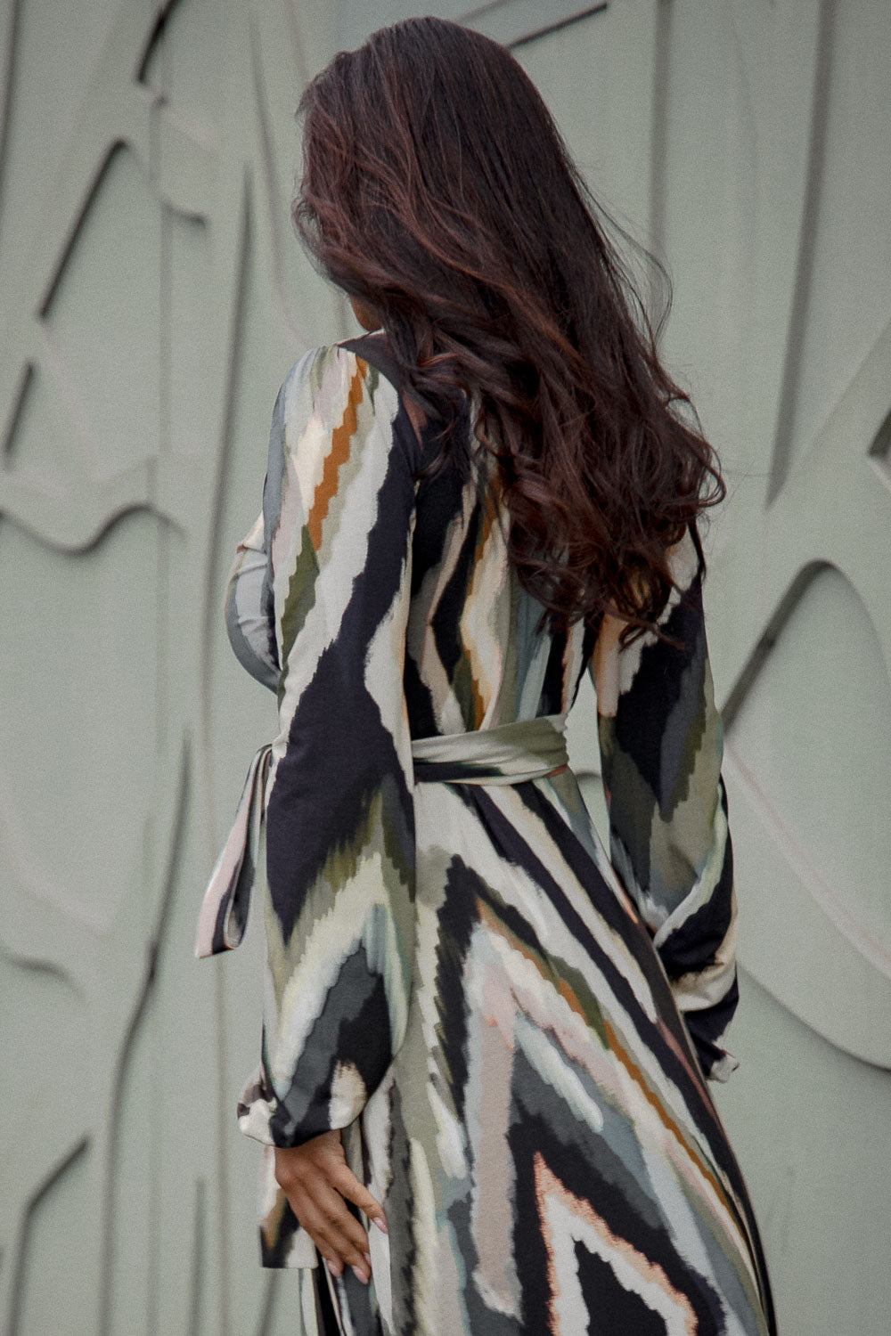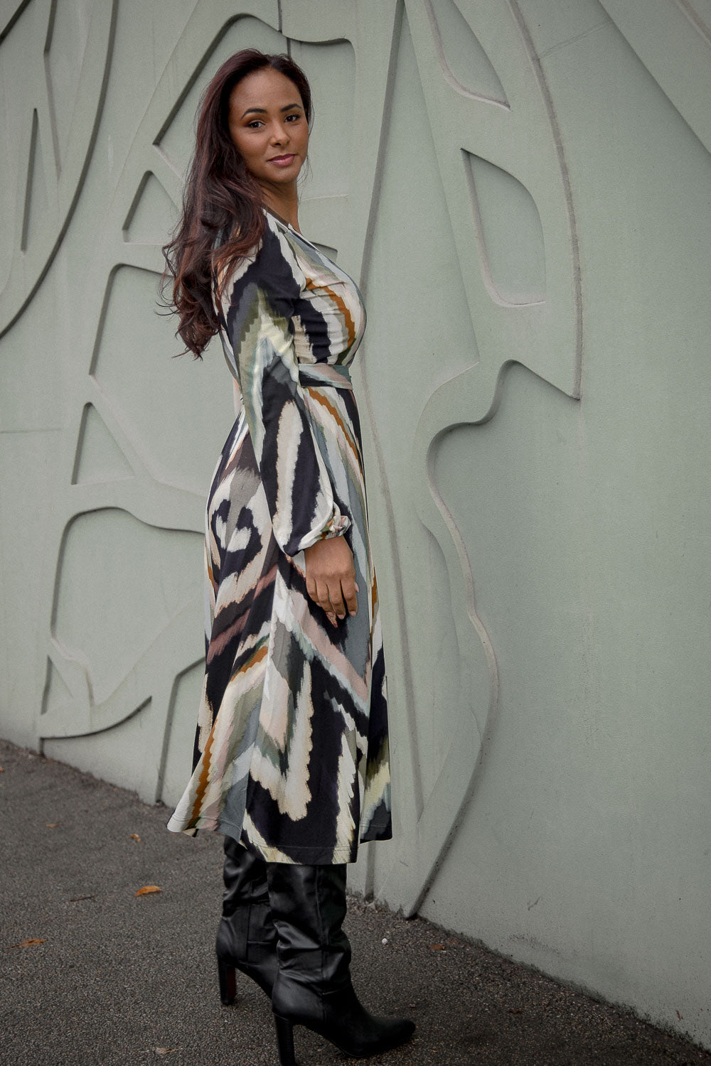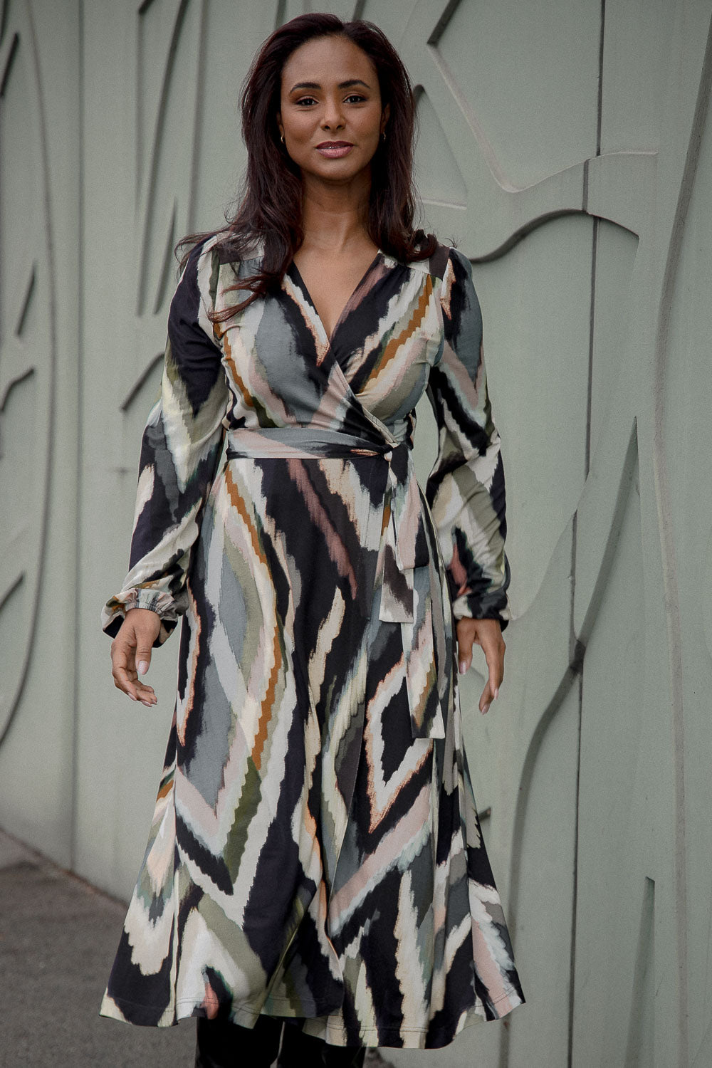 Klänningen finns i två längder: knälång och vadlång modell – en mönstrad omlottklänning i stretchig viskos som du kommer vilja bära om och om igen.