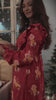 Mönstret har en varm röd bas med ett mjukt och jordnära uttryck. De blommiga detaljerna går i varma nyanser av aprikos, rosé och dämpat gult, vilket skapar en harmonisk och sammanhållen helhet. Färgskalan känns romantisk, varm och lätt dämpad, med ett tydligt höstligt intryck som upplevs mjukt och behagligt mot huden.