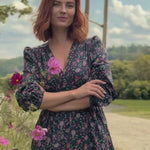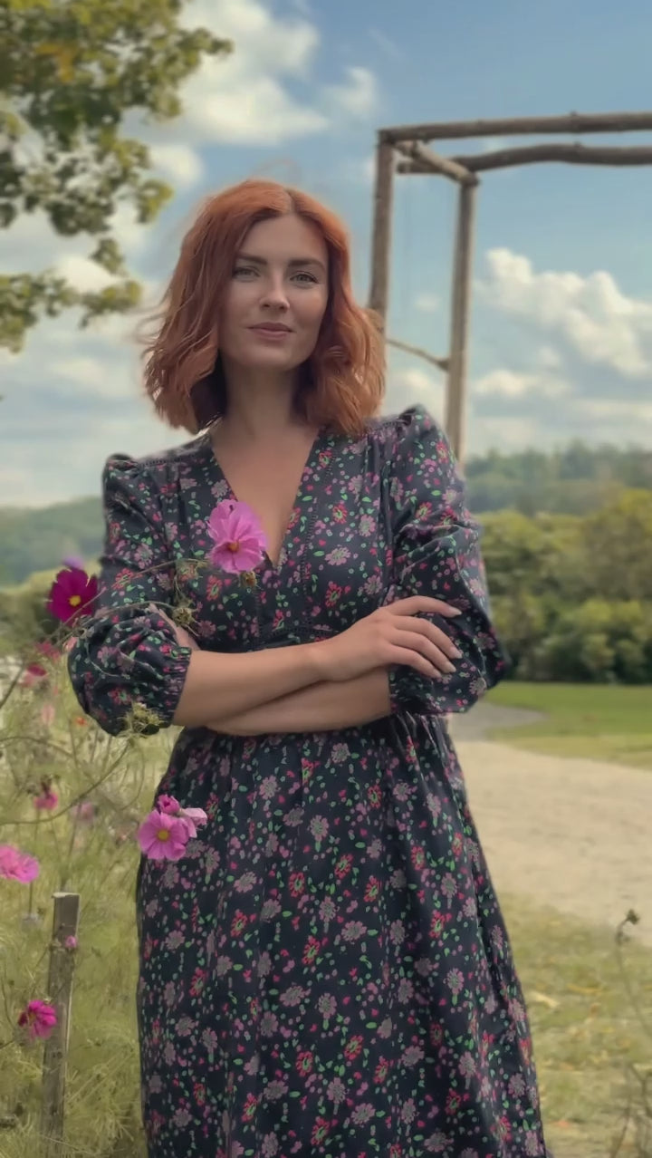 Här är en ny klänningsmodell i bomullspoplin – en vadlång V-ringad klänning med feminina detaljer och en bekväm passform. Det blommiga mönstret på mörkblå botten ger ett livfullt uttryck, medan dekorativa spetskanter i hålmönstrad bomull markerar axlarna, ramar in V-ringningen, midjebandet fram och fållen nertill.