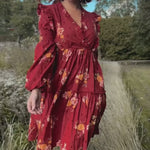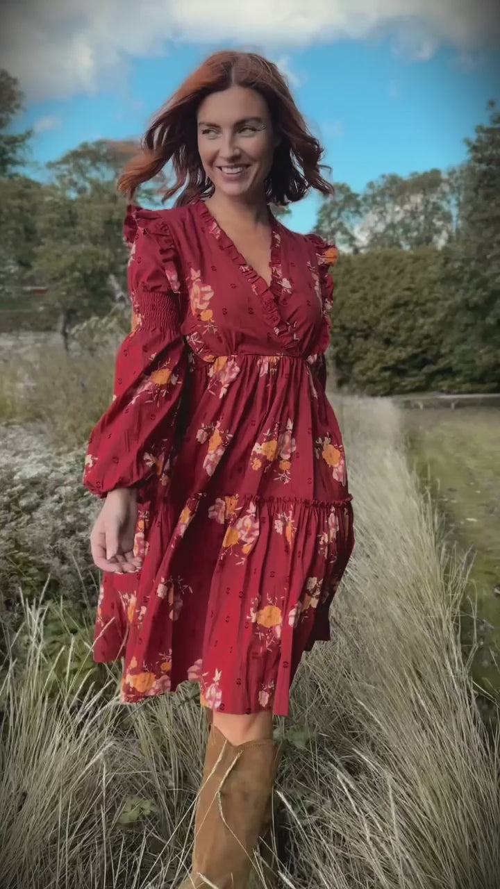 Kjolen är vid och avslutas med en bred volang nertill som ger klänningen ett vackert fall. Livet och kjolen är fodrade i tunn bomull för skön komfort och praktiska fickor i sidorna.