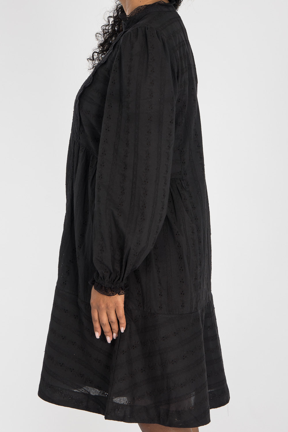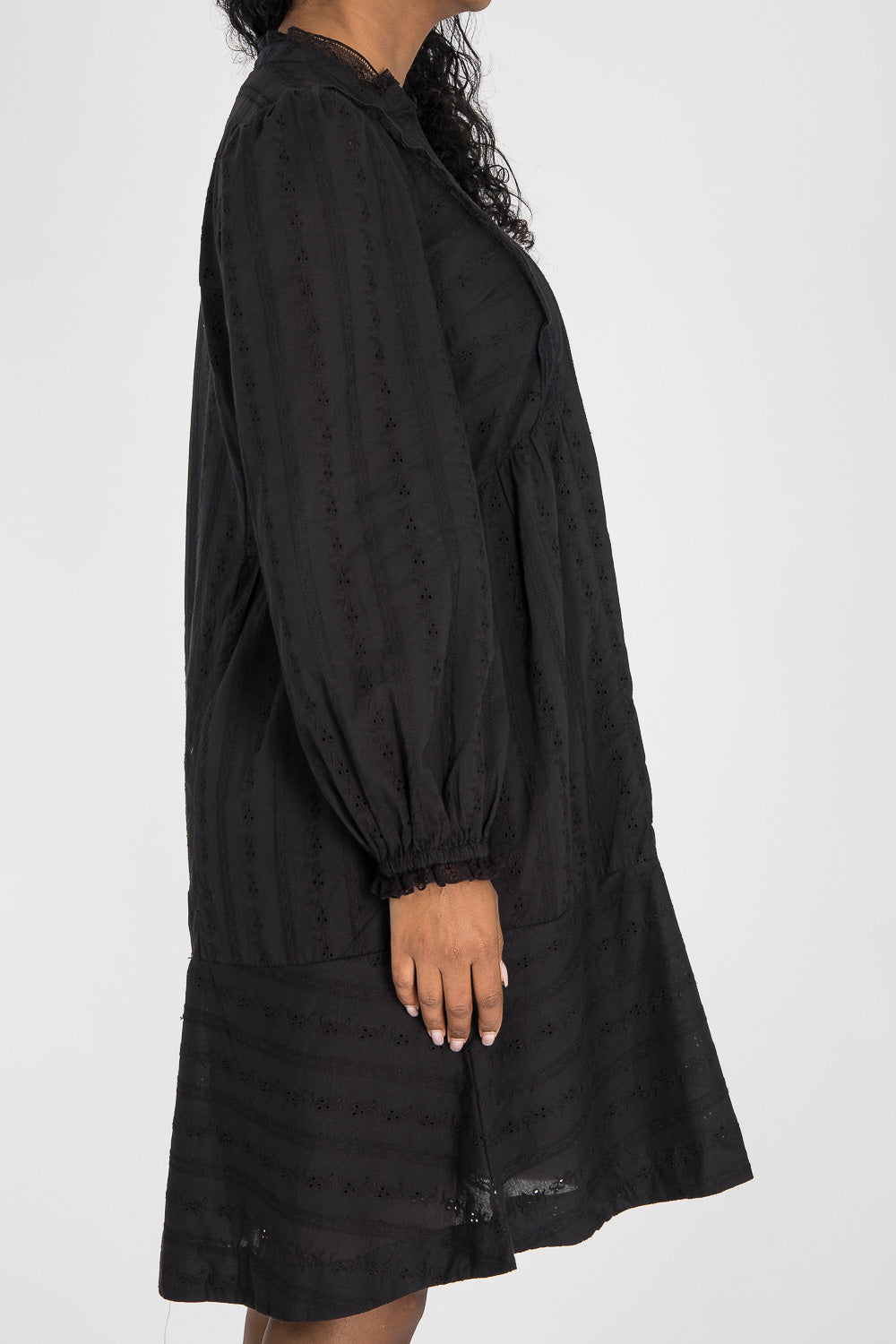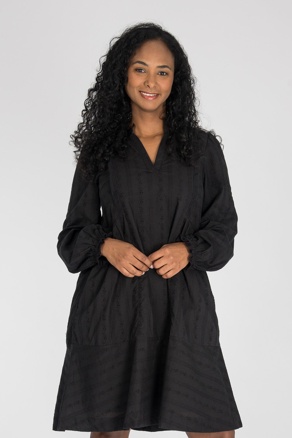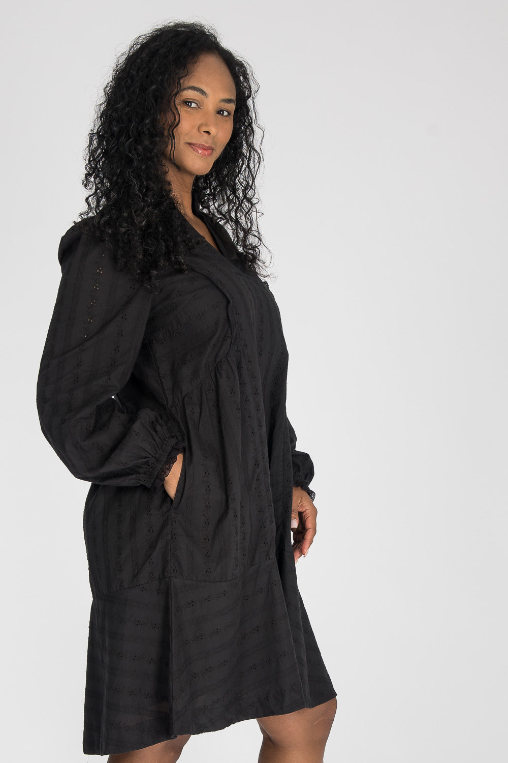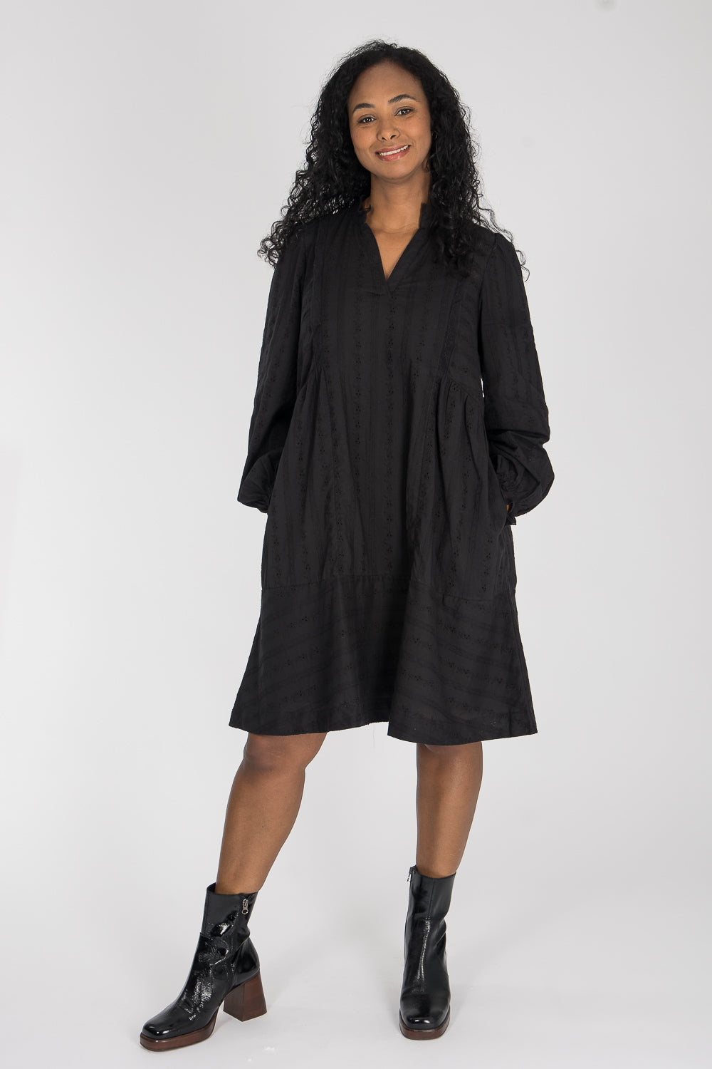 Här är en ny klänningsmodell som vi sytt i bomullsspets – en A-linjeformad klänning med generös vidd. Det svarta tyget, en broderie anglaise med broderat mönster ger ett mjukt uttryck samtidigt som det lyfter fram klänningens form.