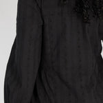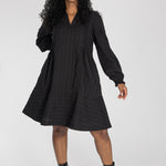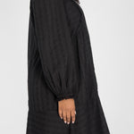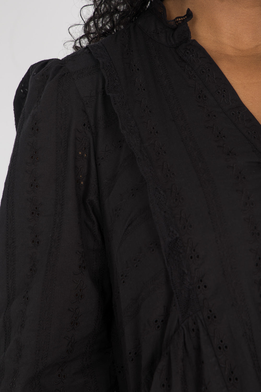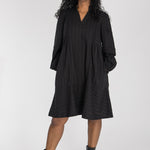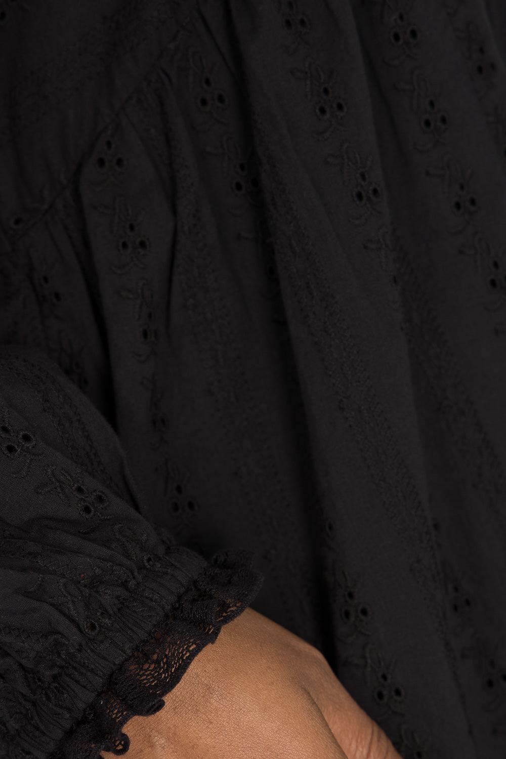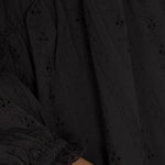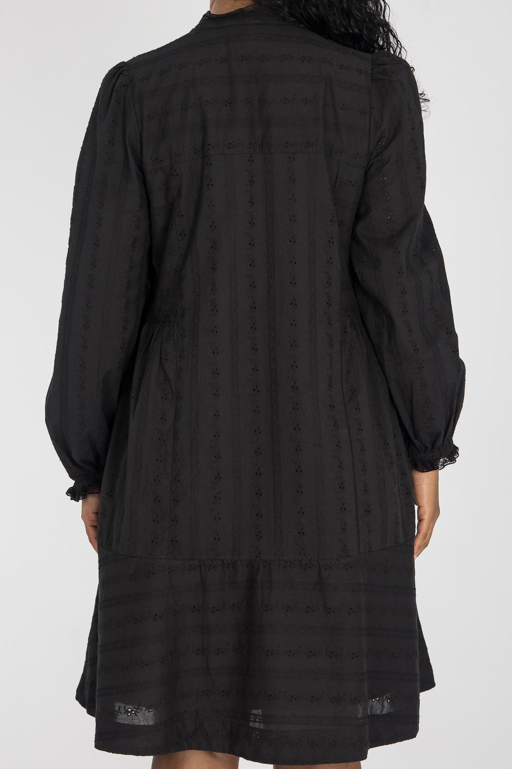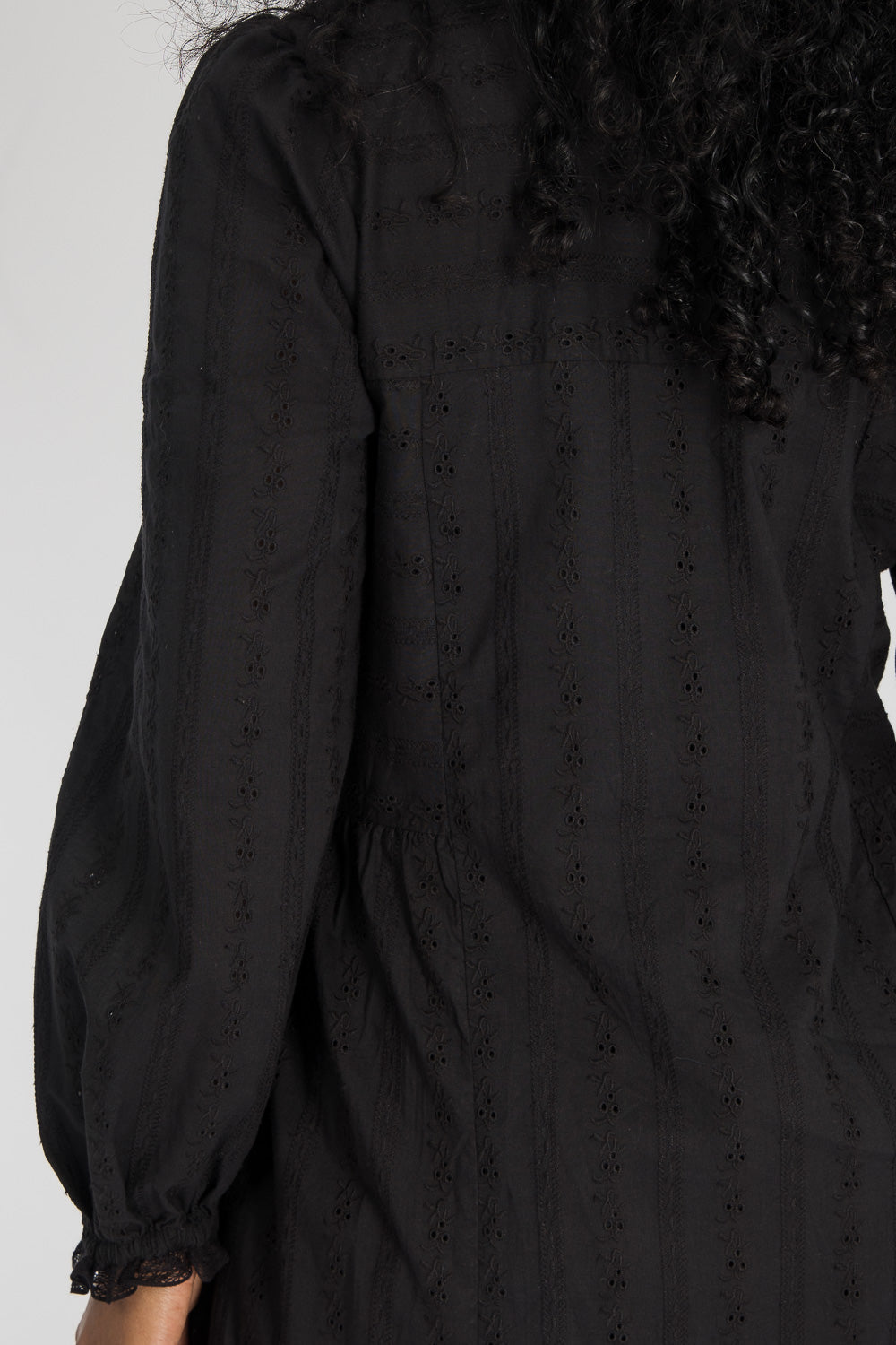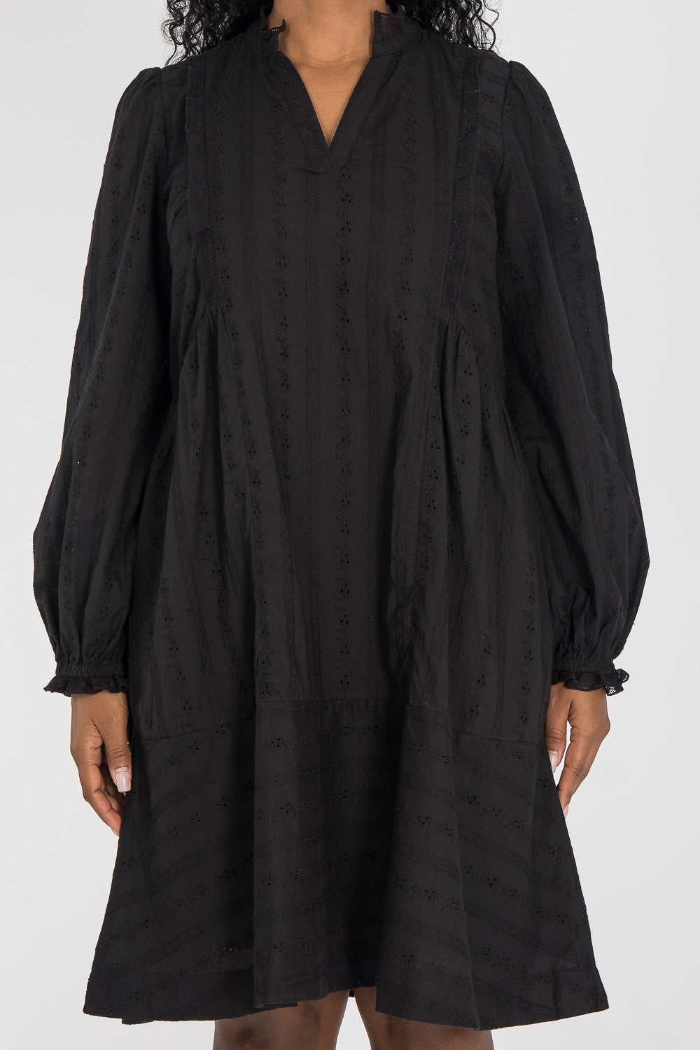 Här är en ny klänningsmodell som vi sytt i bomullsspets – en A-linjeformad klänning med generös vidd. Det svarta tyget, en broderie anglaise med broderat mönster ger ett mjukt uttryck samtidigt som det lyfter fram klänningens form.
