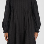 Klänningen har en V-ringad öppning med victoriansk krage och fina bomullsspetsvolanger som ramar in halsringning, bröst och ärmslut på ett romantiskt sätt. Långa ärmar med en lätt puff och resår nertill och fickor i sidorna. Den är fodrad med ett tunt bomullstyg i livet och kjolen, medan ärmarna är ofodrade..