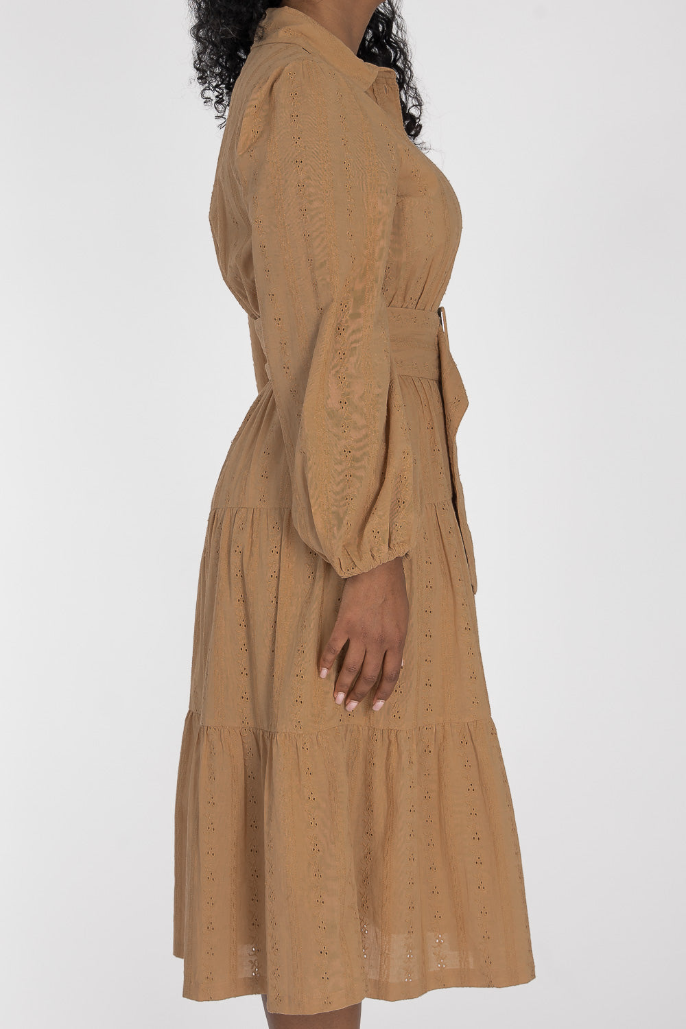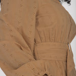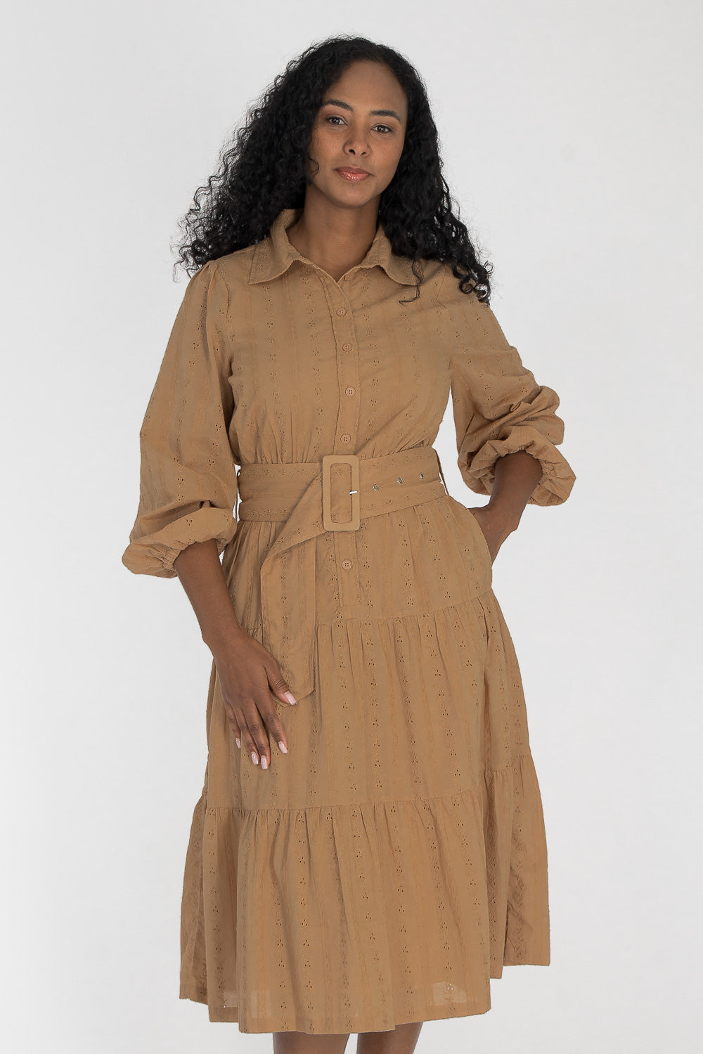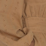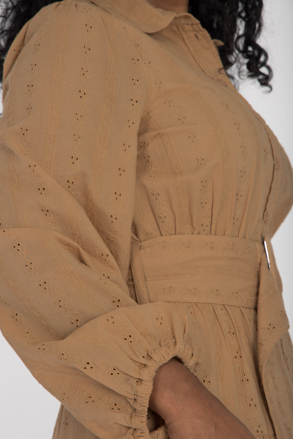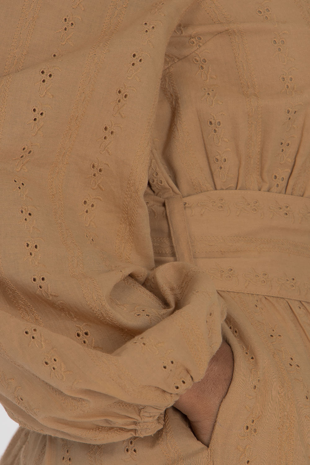Säg hej till vår nya klänningsmodell sydd i broderie anglaise, en skjortklänning där klassiska detaljer möter en feminin silhuett med bohemisk charm. Färgen är mjuk som ökensand och framhäver det broderade bomullstygets vackra struktur.