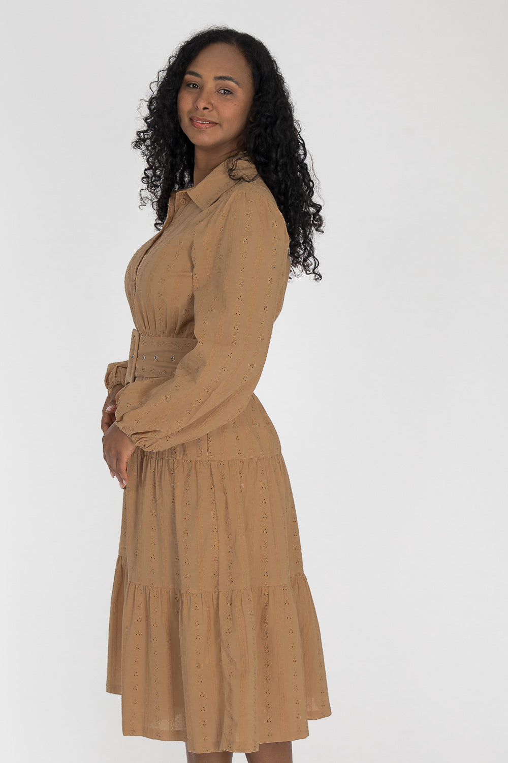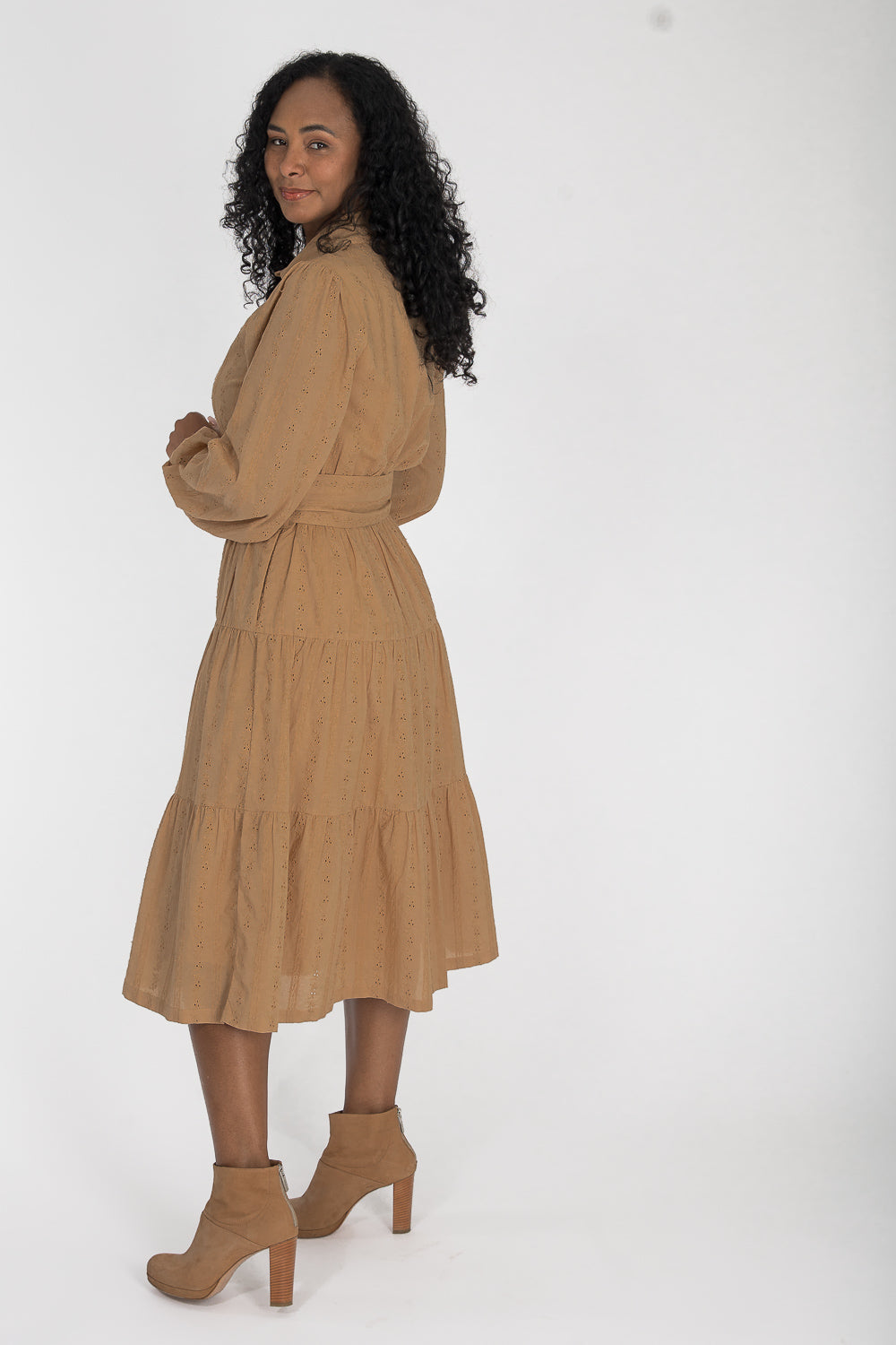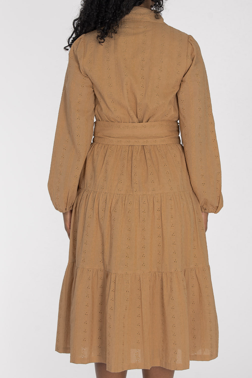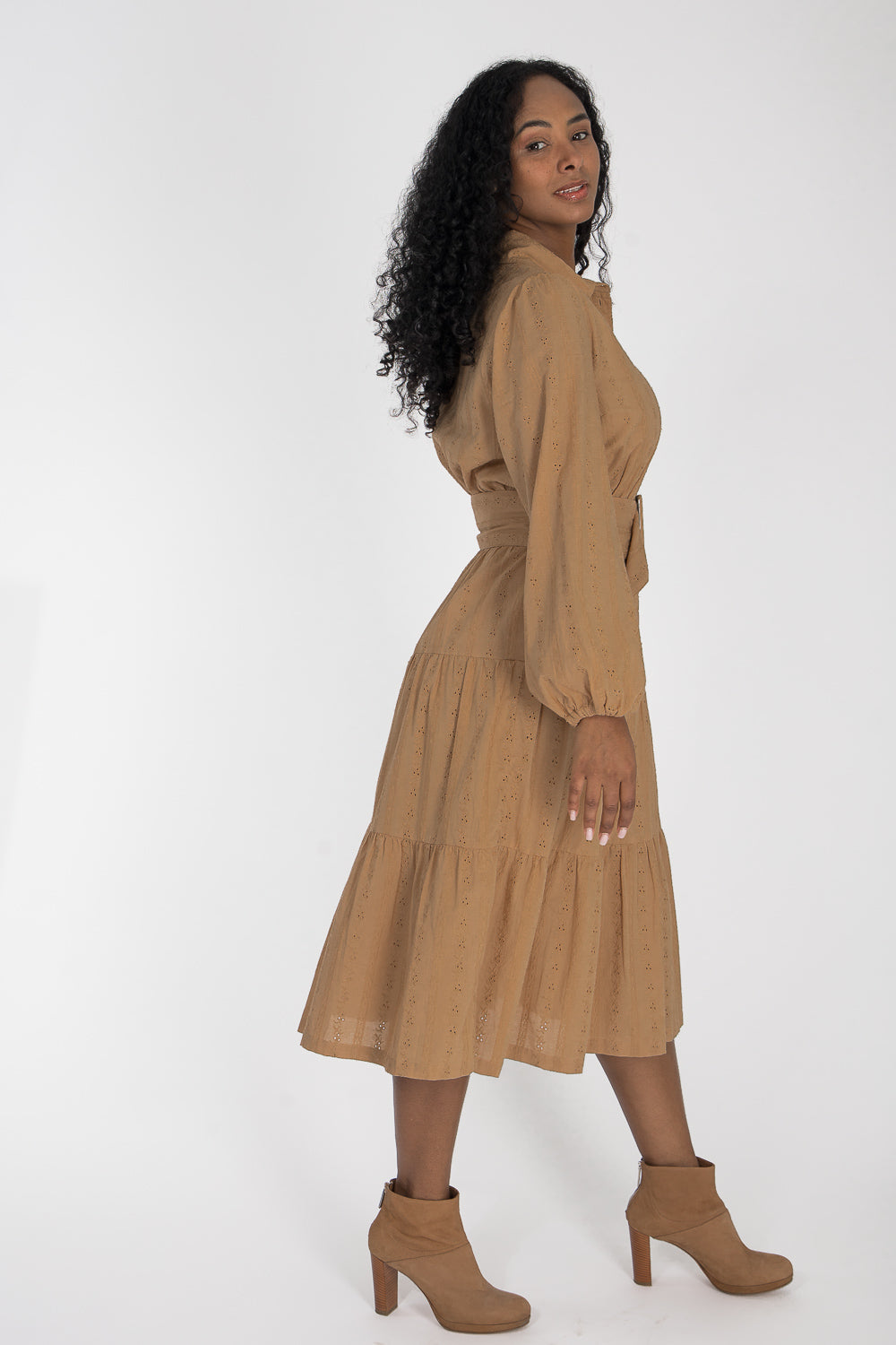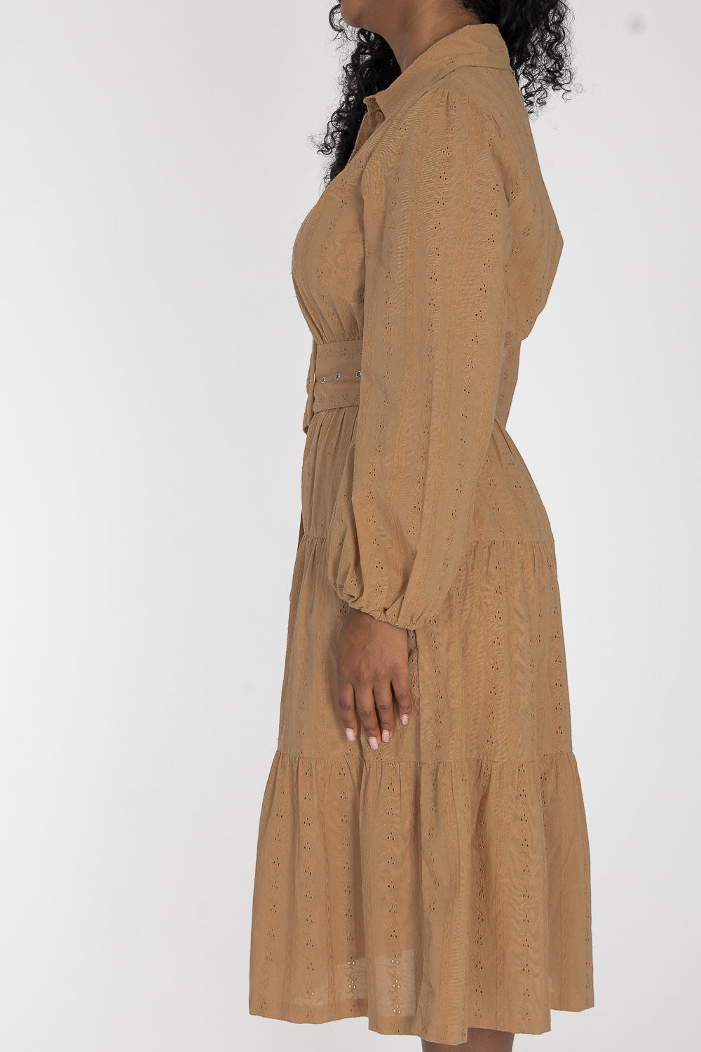 Säg hej till vår nya klänningsmodell sydd i broderie anglaise, en skjortklänning där klassiska detaljer möter en feminin silhuett med bohemisk charm. Färgen är mjuk som ökensand och framhäver det broderade bomullstygets vackra struktur.