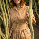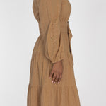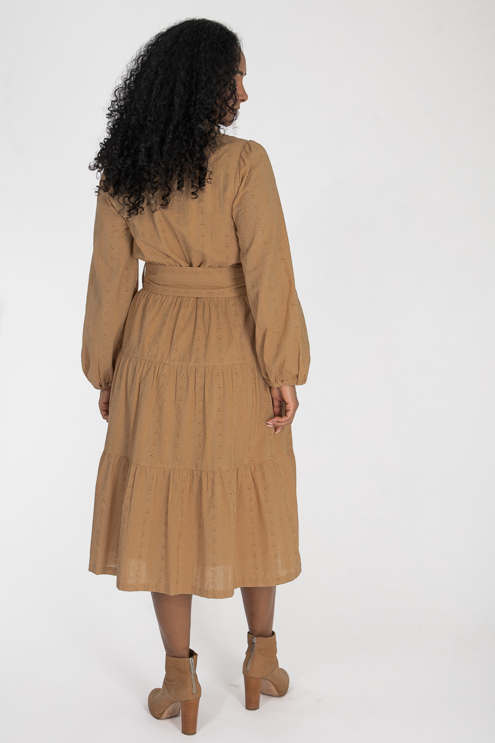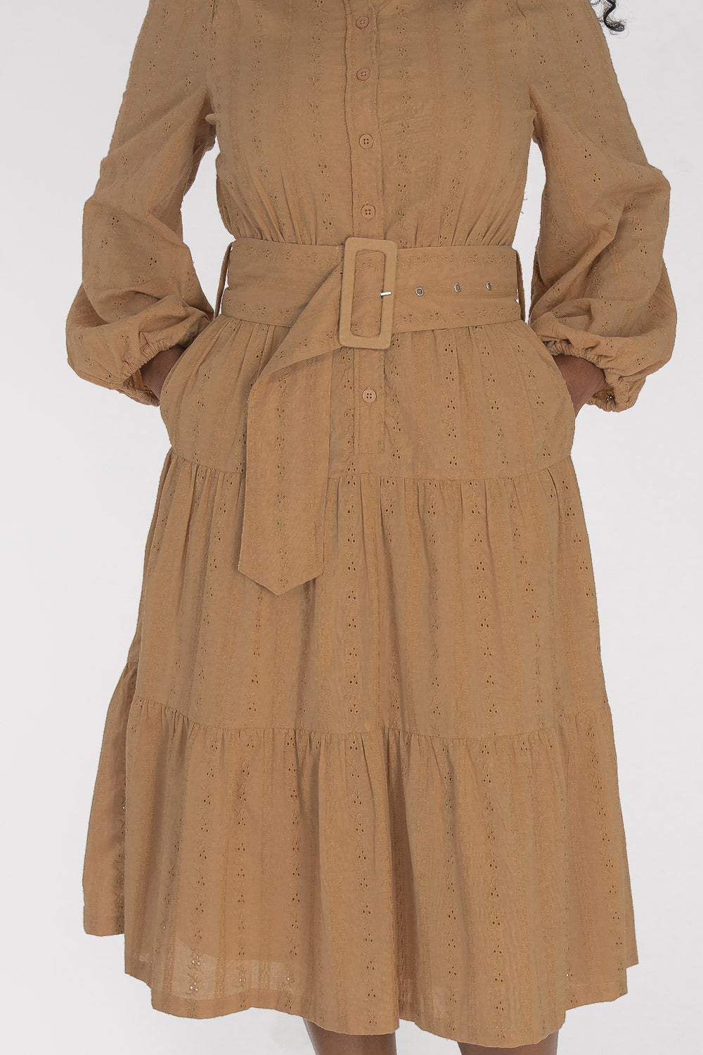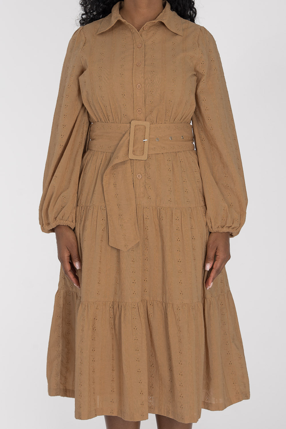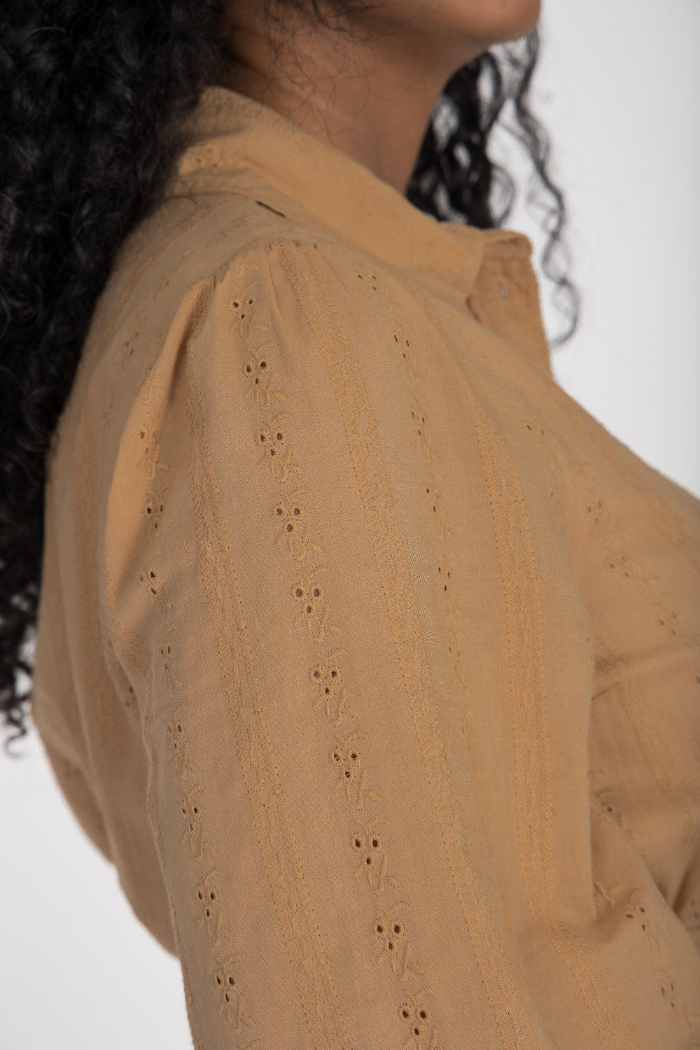 Säg hej till vår nya klänningsmodell sydd i broderie anglaise, en skjortklänning där klassiska detaljer möter en feminin silhuett med bohemisk charm. Färgen är mjuk som ökensand och framhäver det broderade bomullstygets vackra struktur.