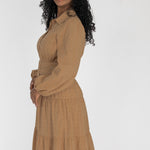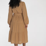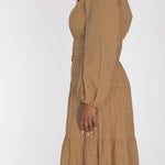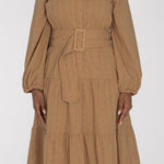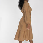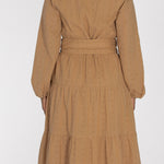 Klänningen har knäppning framtill och en klassisk skjortkrage, markerad midja med linning och en vadlång volangkjol. Ärmarna har en lätt puff med elastisk nederkant, så att de enkelt kan bäras långa eller uppdragna till armbågen. Ett brett tygskärp i samma material följer med för att framhäva midjan. Fickor i sidorna och en tunn bomullsfodring i liv och kjol gör klänningen både praktisk och bekväm.