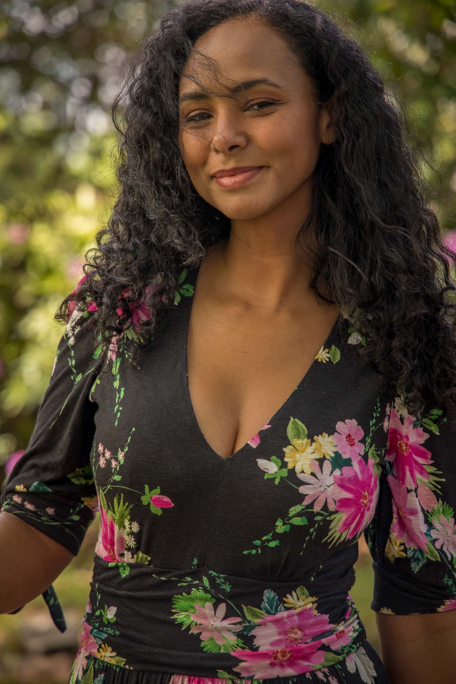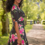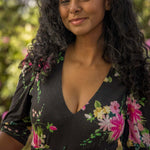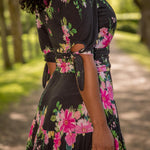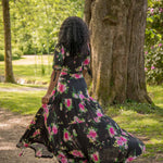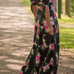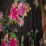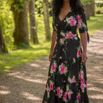 Flowy maxi är klänningen som tar plats med självklar elegans. Nu i ett nytt blommigt mönster i rosa, vitt och grönt mot svart botten – lika vacker till vardagsfin som till sommarens alla fester och bröllop.