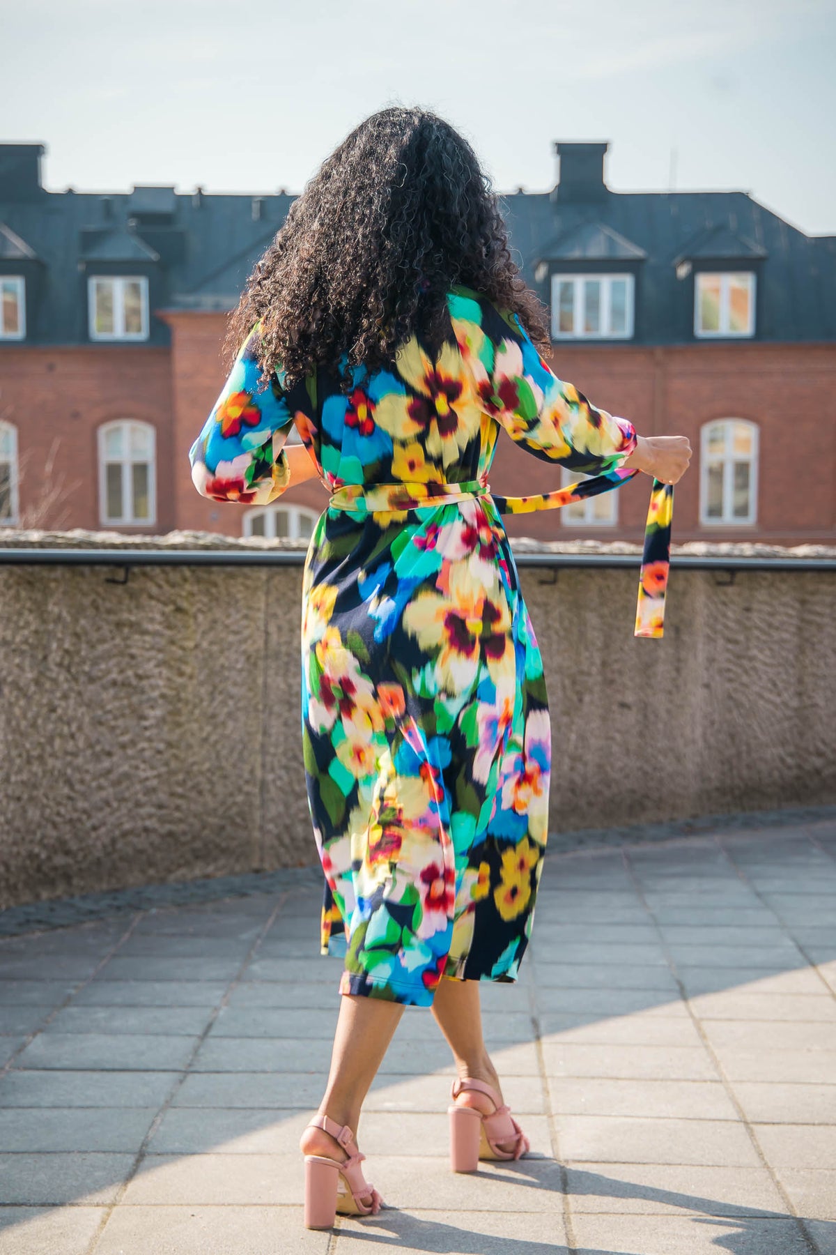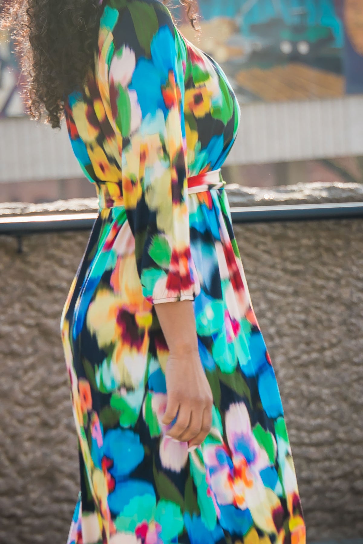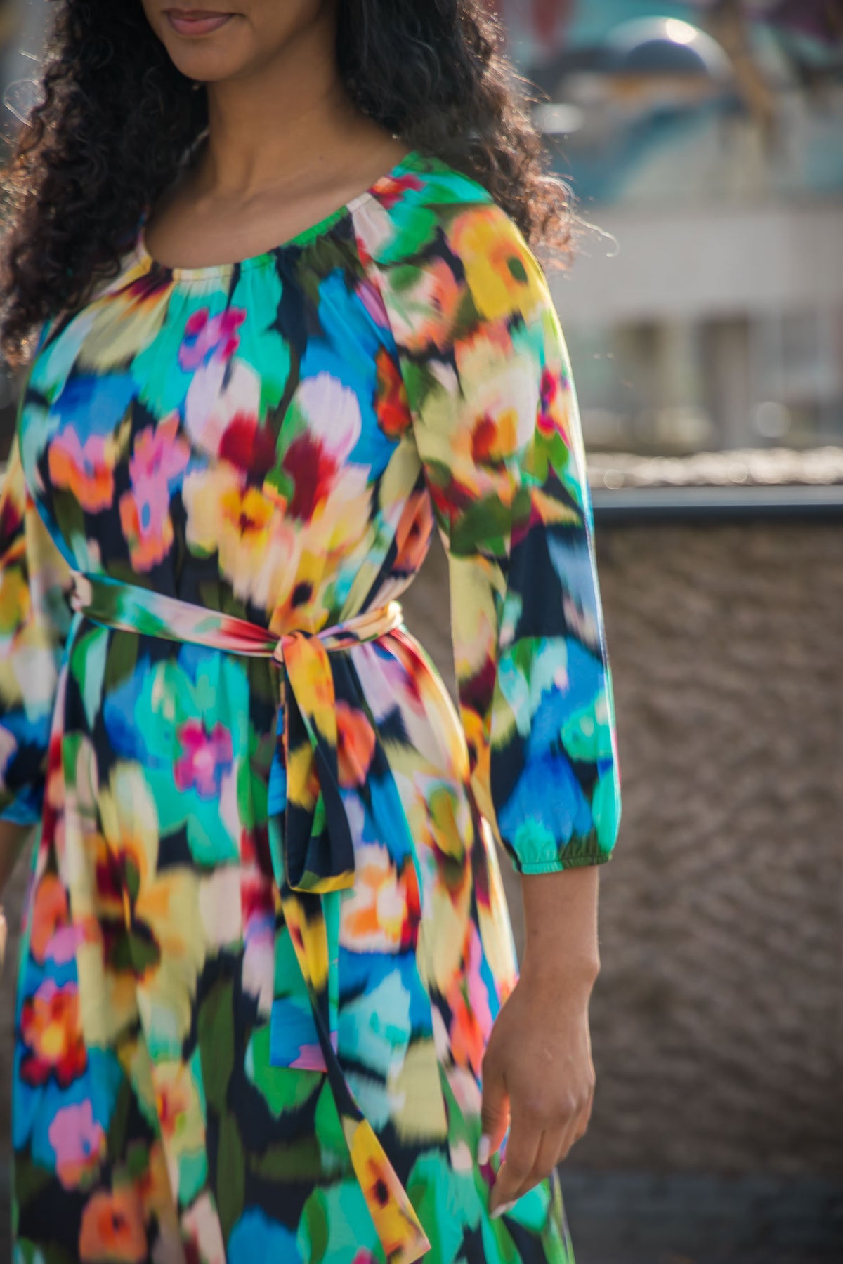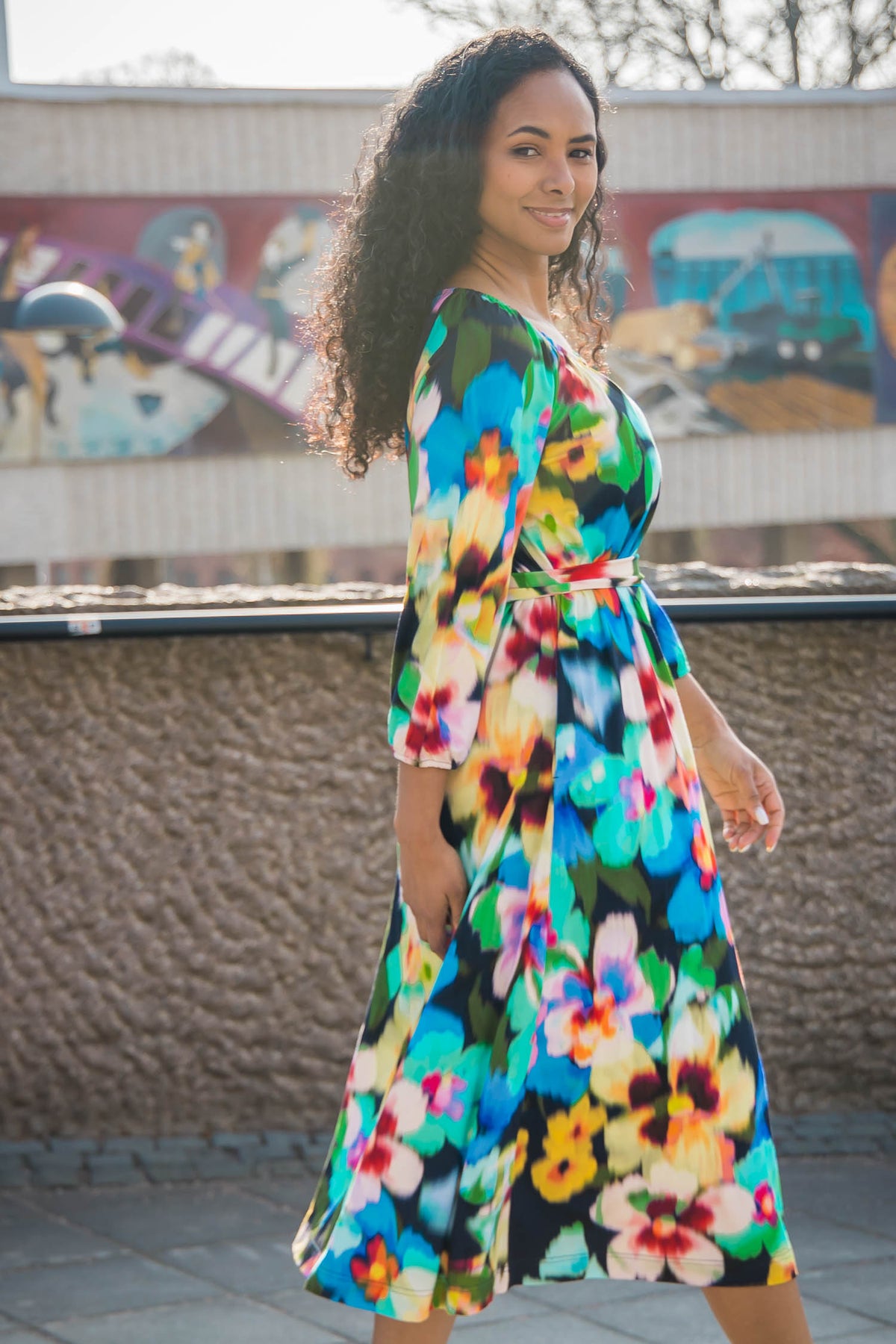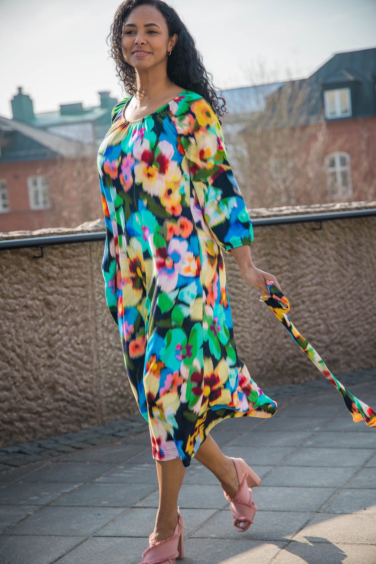 Låt färgerna tala med vår A-linjeformade klänning, A-lined belted. Den är sydd i mjuk och stretchig trikå med ett vackert tungt fall och har ett blurred florals-mönster i klara nyanser mot en mörkblå botten. En perfekt mix av livfull elegans och avslappnad komfort.