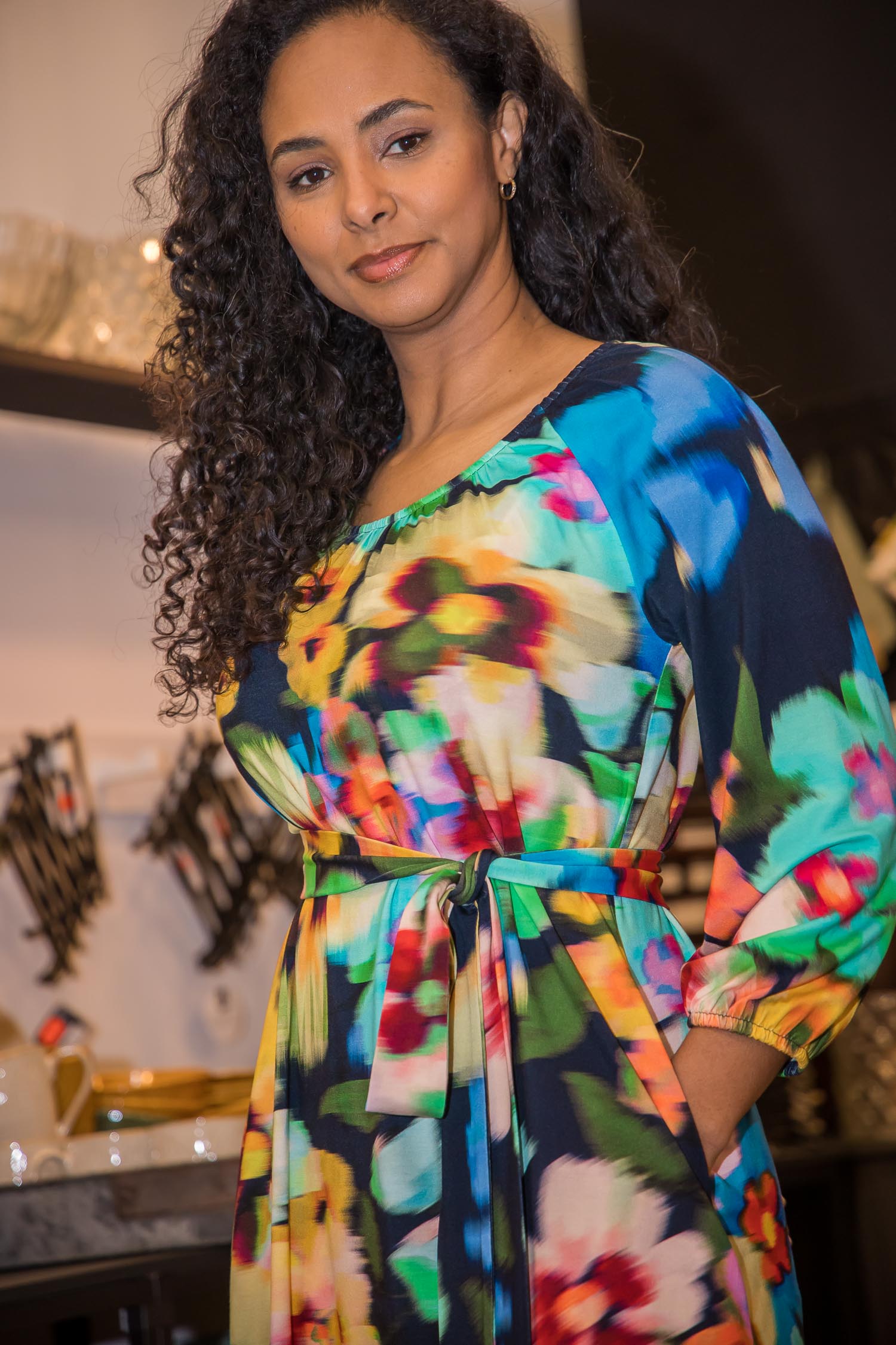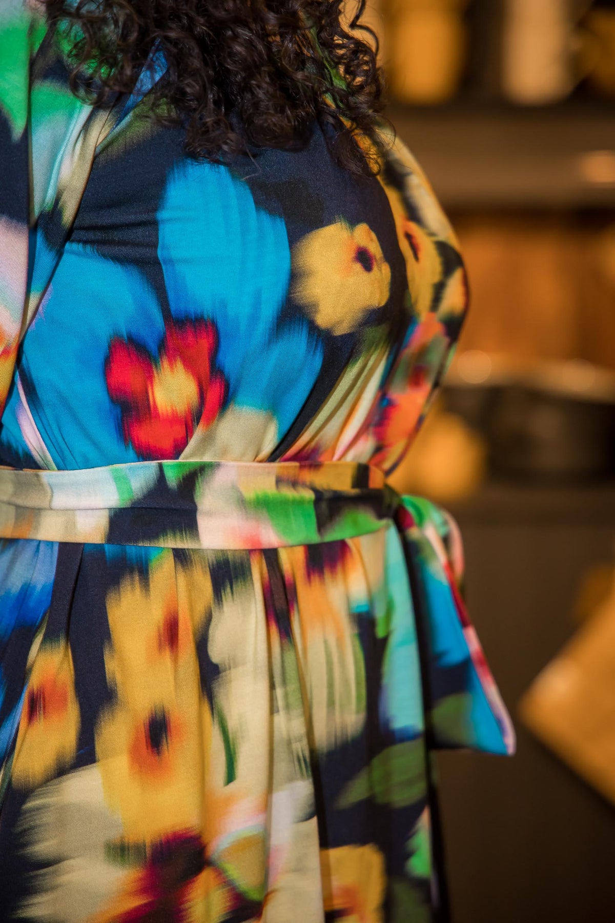 Låt färgerna tala med vår A-linjeformade klänning, A-lined belted. Den är sydd i mjuk och stretchig trikå med ett vackert tungt fall och har ett blurred florals-mönster i klara nyanser mot en mörkblå botten. En perfekt mix av livfull elegans och avslappnad komfort.
