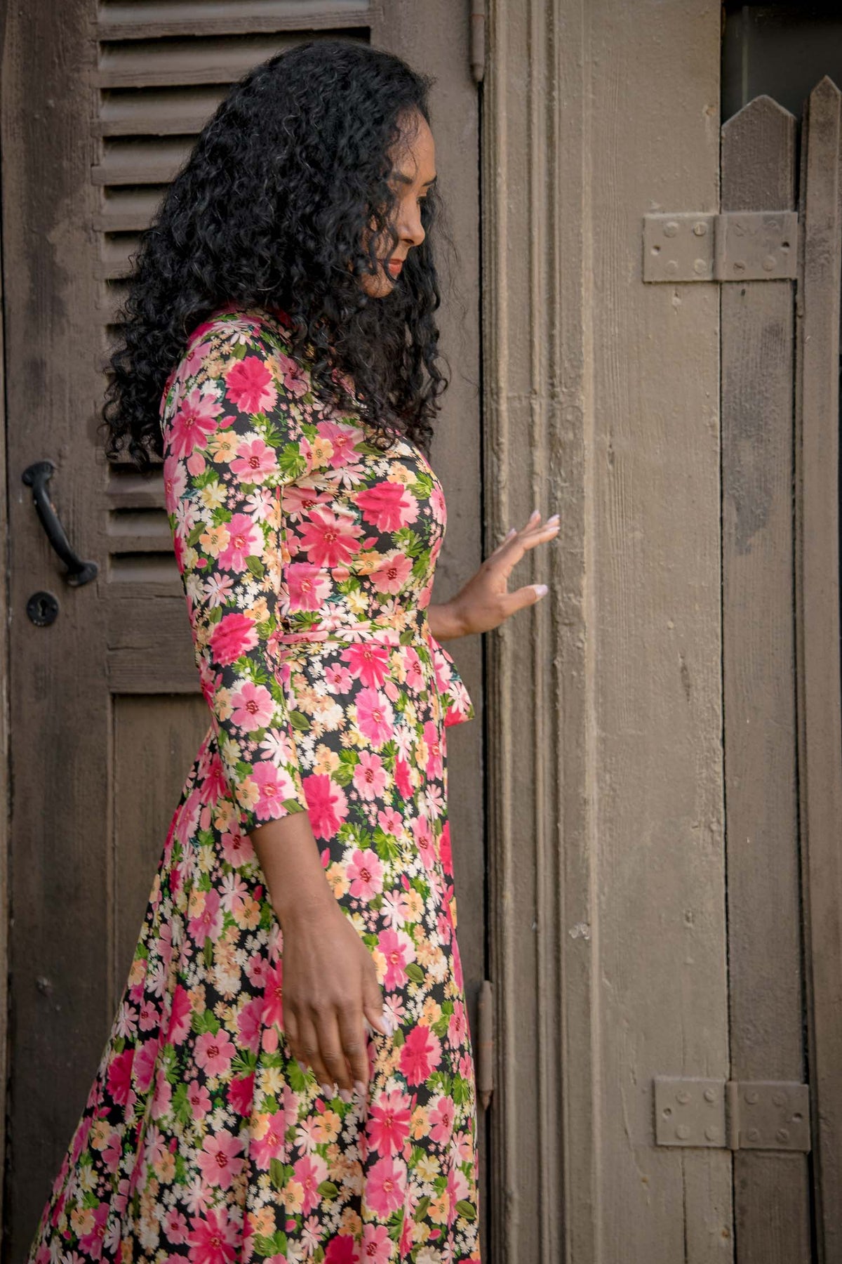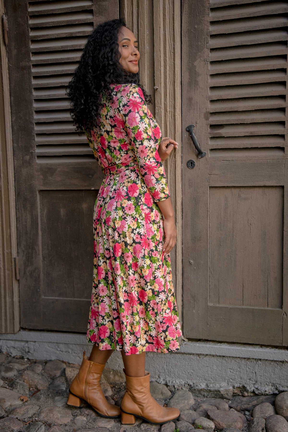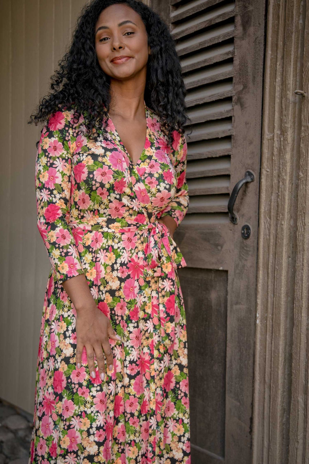 Mönstret är fullt av färgstarka blommor i rosa, gult och grönt på mörk botten – en klänning som piggar upp garderoben och funkar lika bra till vardags som när du vill klä upp dig lite extra.