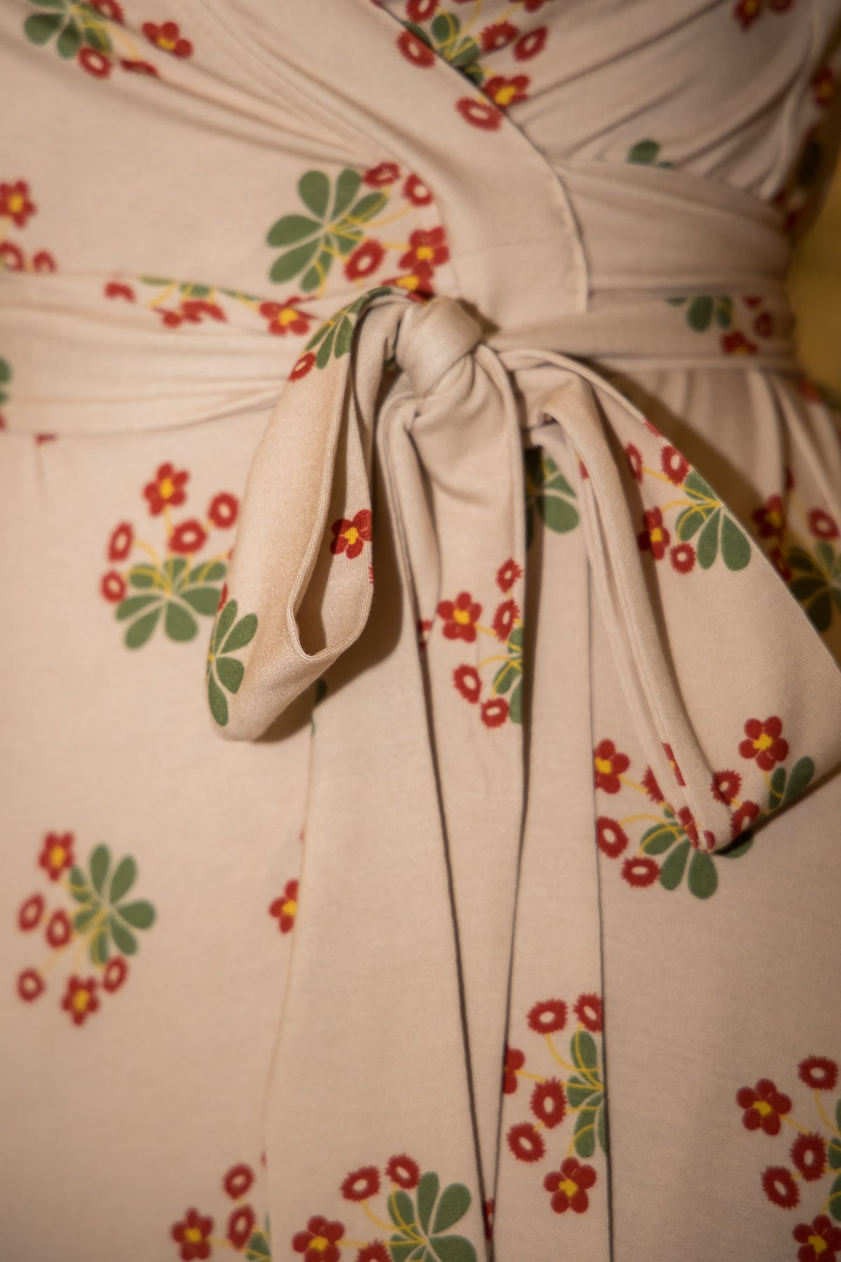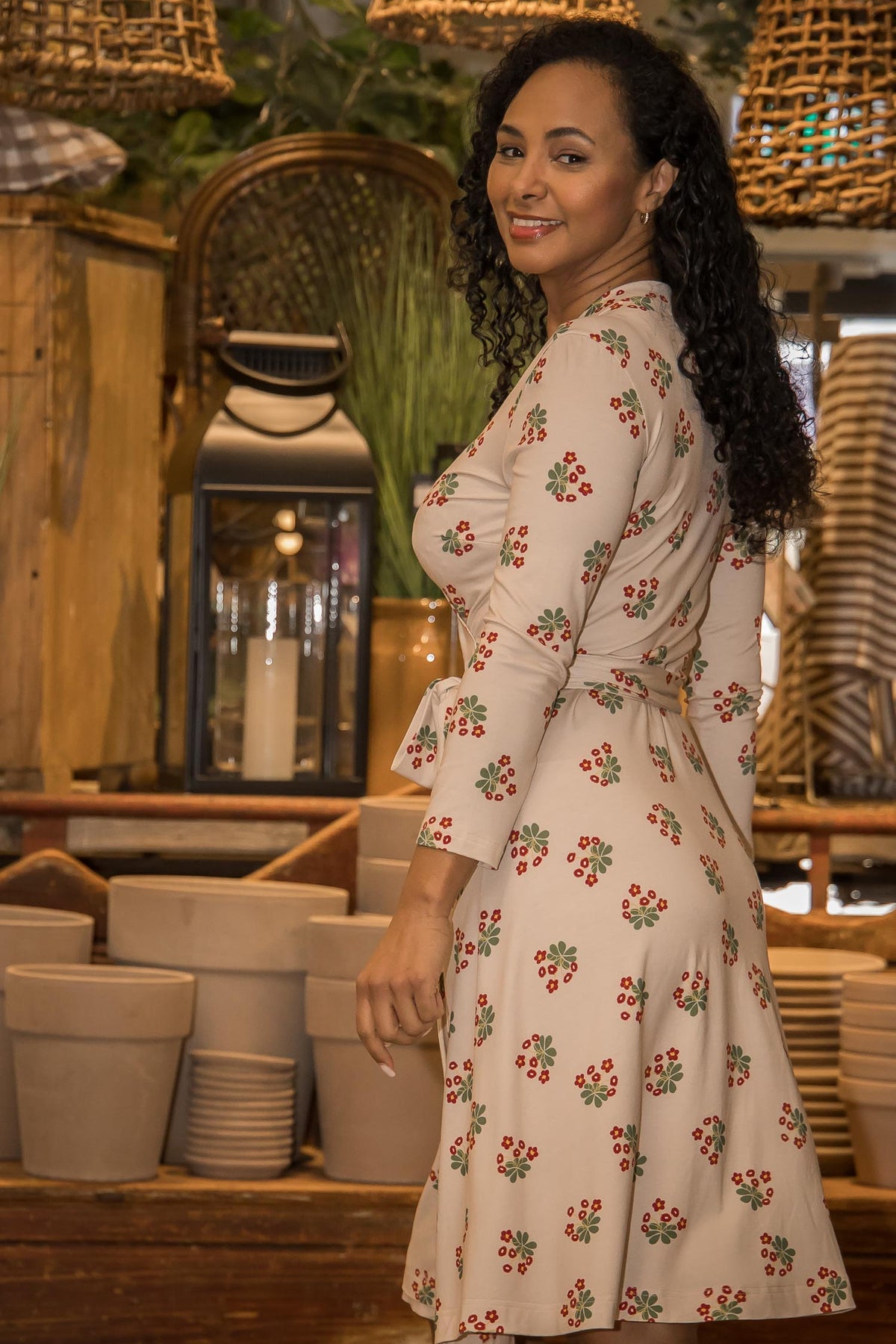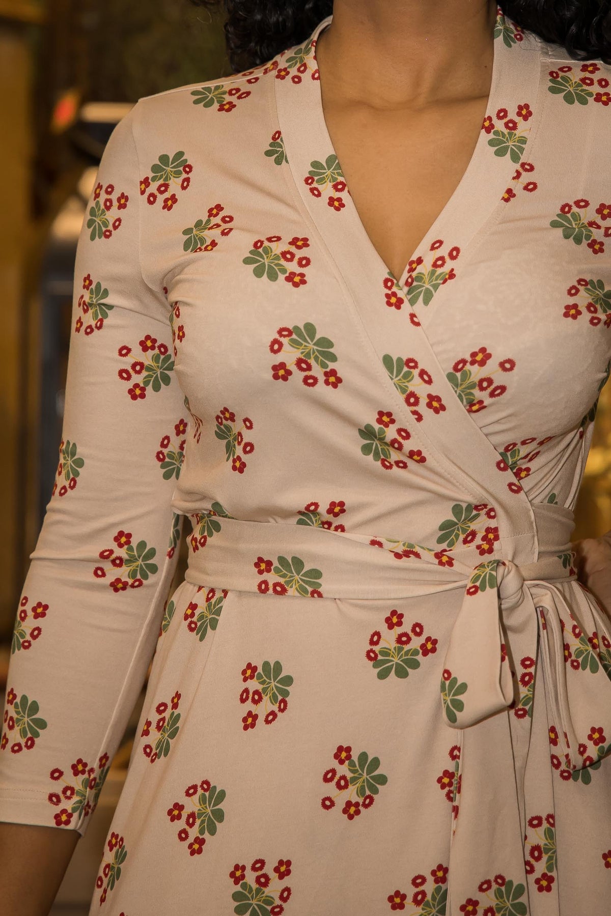 Tyget på denna omlottklänning har en beige botten med ett vackert blommönster i mörkt rött och grönt. Den har generöst med tyg och omlottar mycket runt kroppen och sluter fint vid nacken. Kjolen är rundskuren med härlig vidd och ett vackert fall.