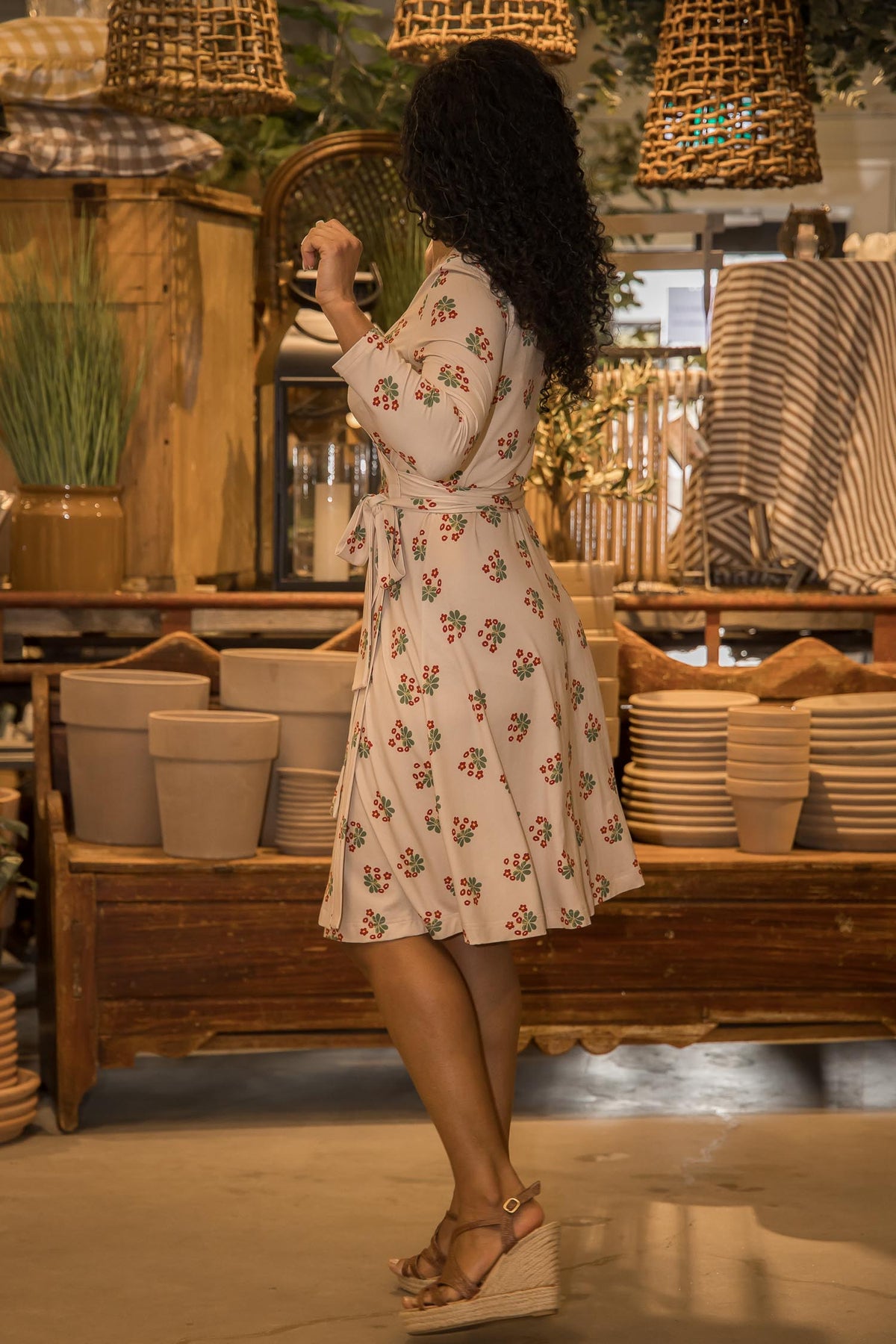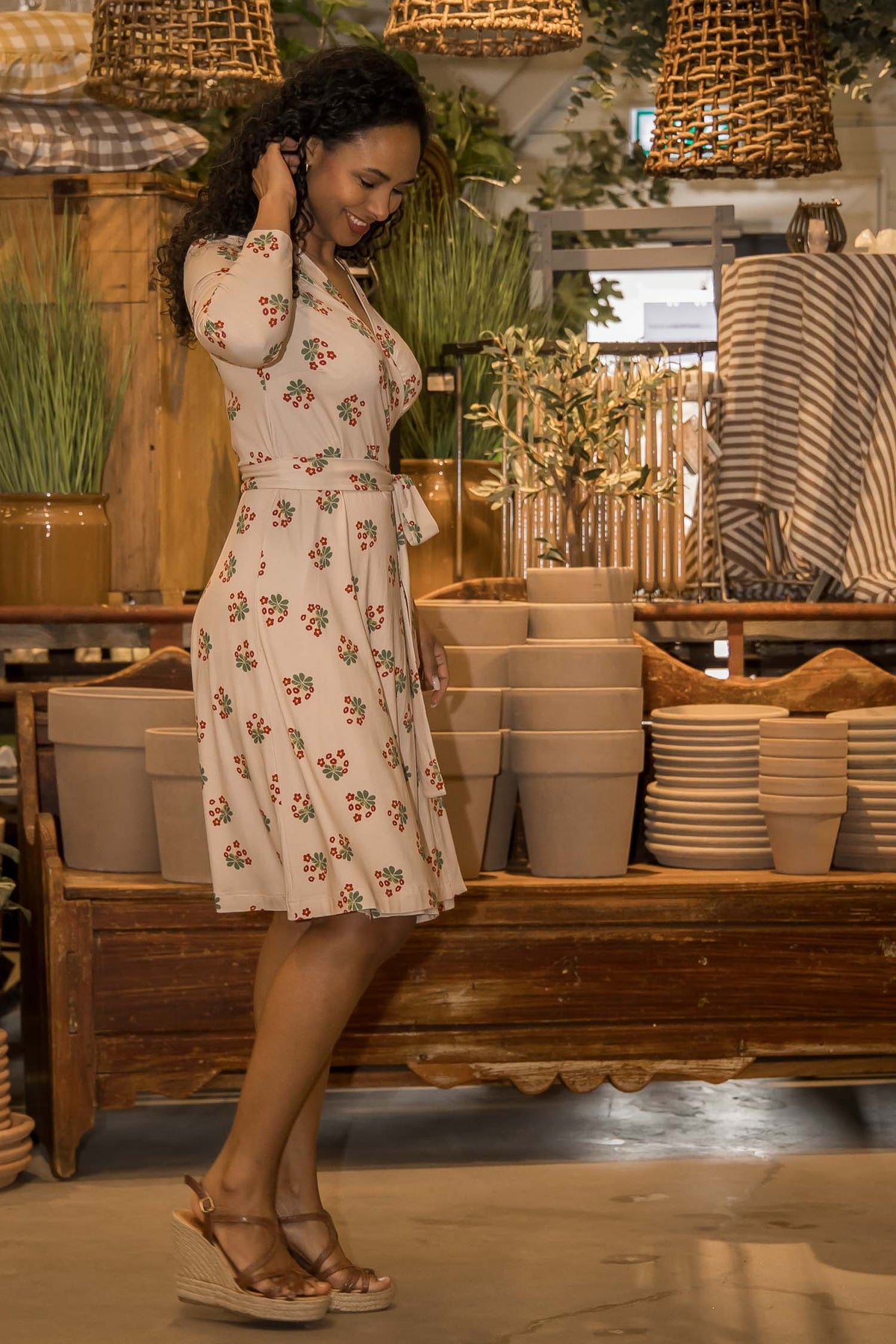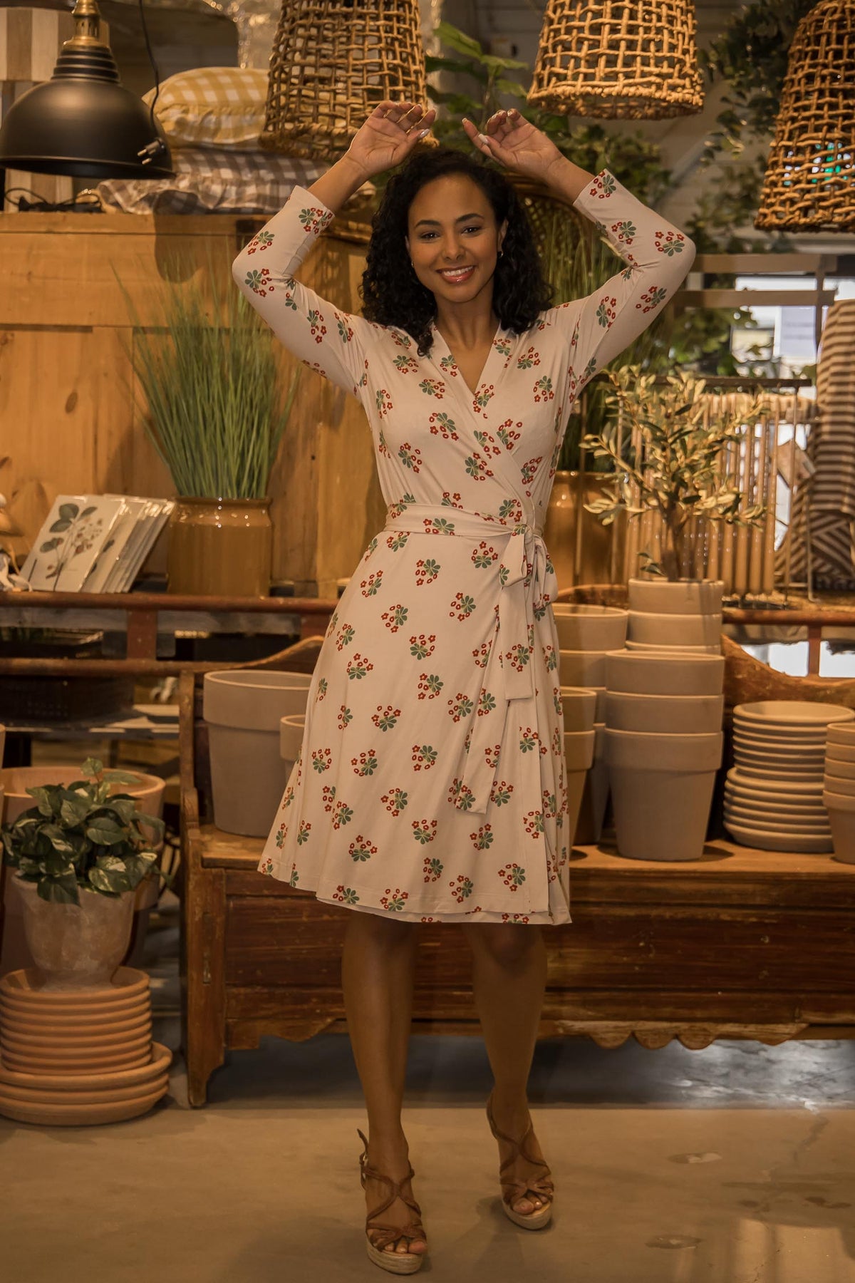 Tyget på denna omlottklänning har en beige botten med ett vackert blommönster i mörkt rött och grönt. Den har generöst med tyg och omlottar mycket runt kroppen och sluter fint vid nacken. Kjolen är rundskuren med härlig vidd och ett vackert fall.