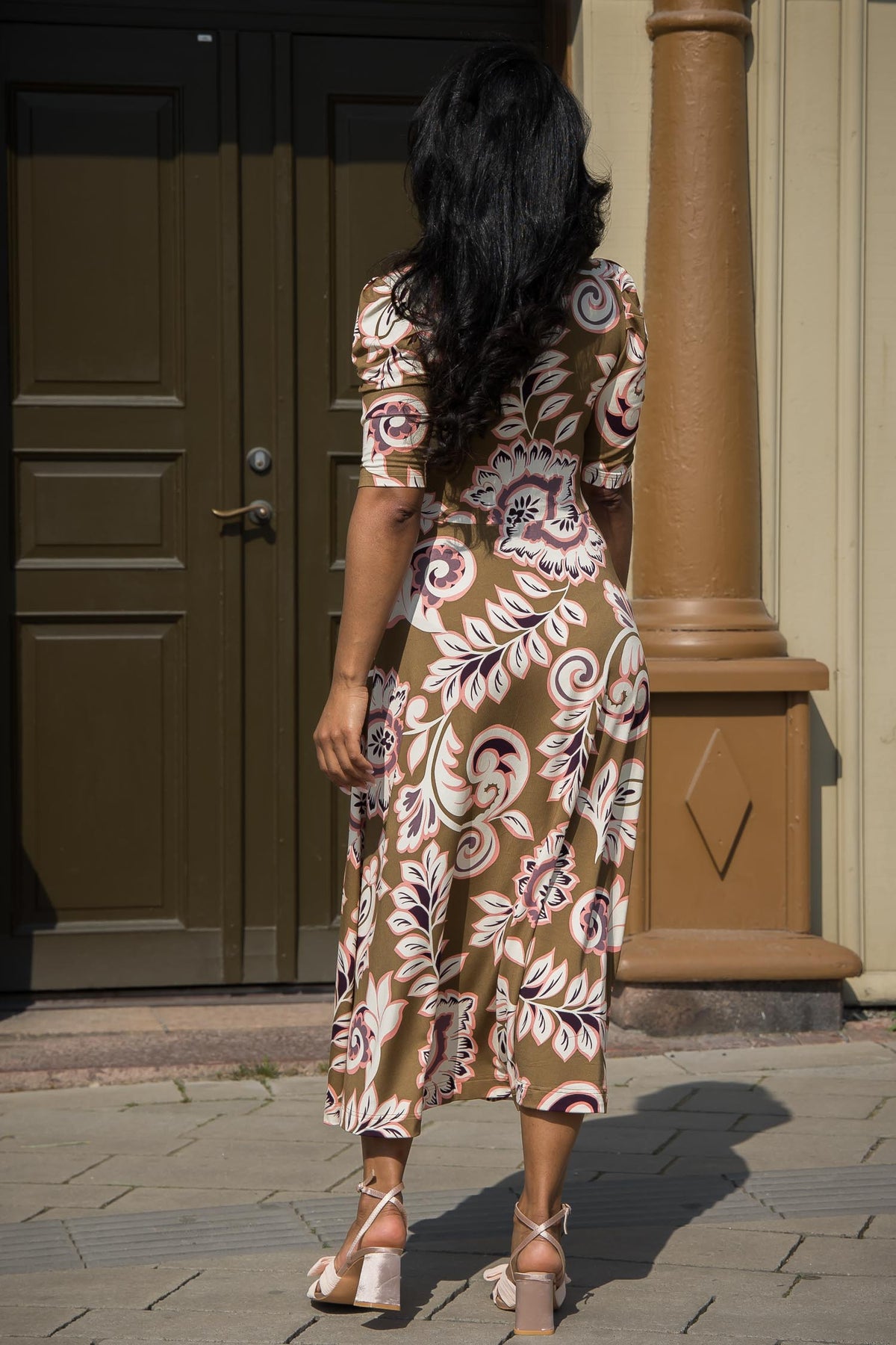 Klänningen har kort puffärm och är sydd i ett nytt mönster med varm olivgrön botten och stora blommor i rosa, offwhite och mauve. En bekväm och stilren modell som fungerar lika bra till vardag som till mer uppklädda tillfällen. Finns även i knälång längd.