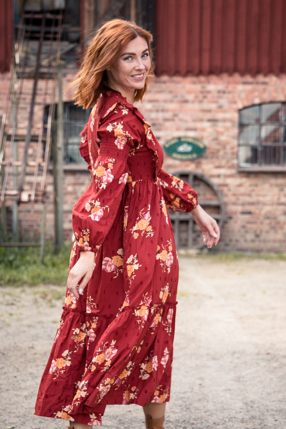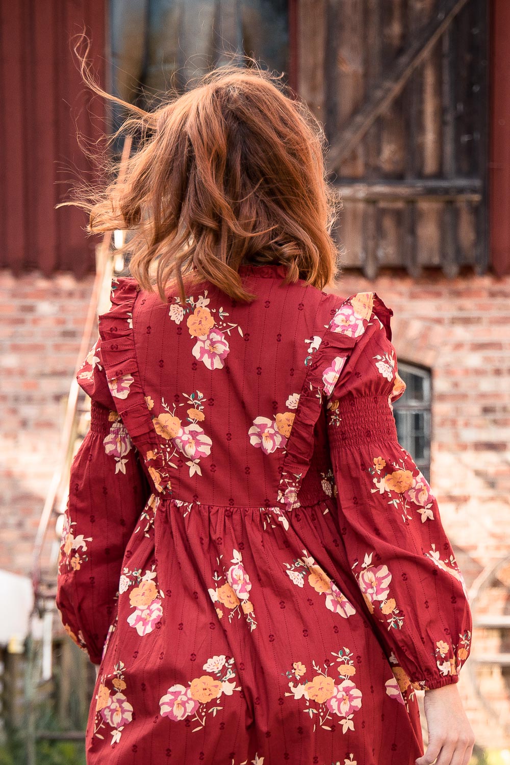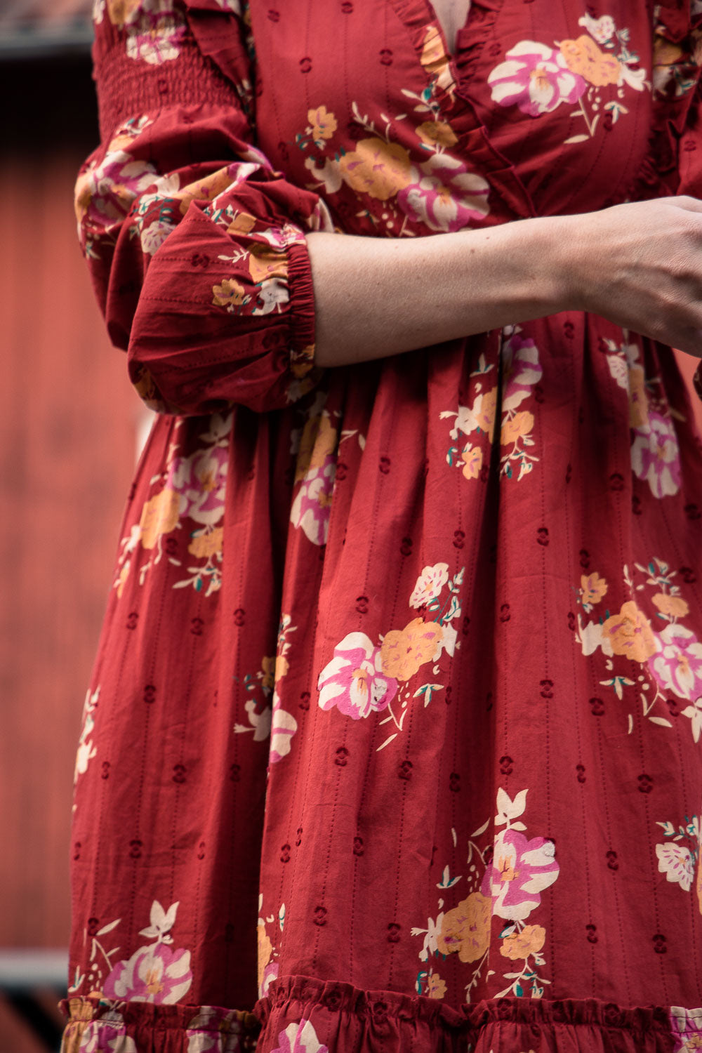 Klänningen är avskuren högt i midjan med en elastisk passform som gör den lätt och bekväm att bära. Smockdetaljer i sidorna upptill och på överärmen ger extra form och följsamhet. Ärmarna är långa och puffiga med resår i nederkanten, vilket gör att de kan bäras både långa eller uppdragna.