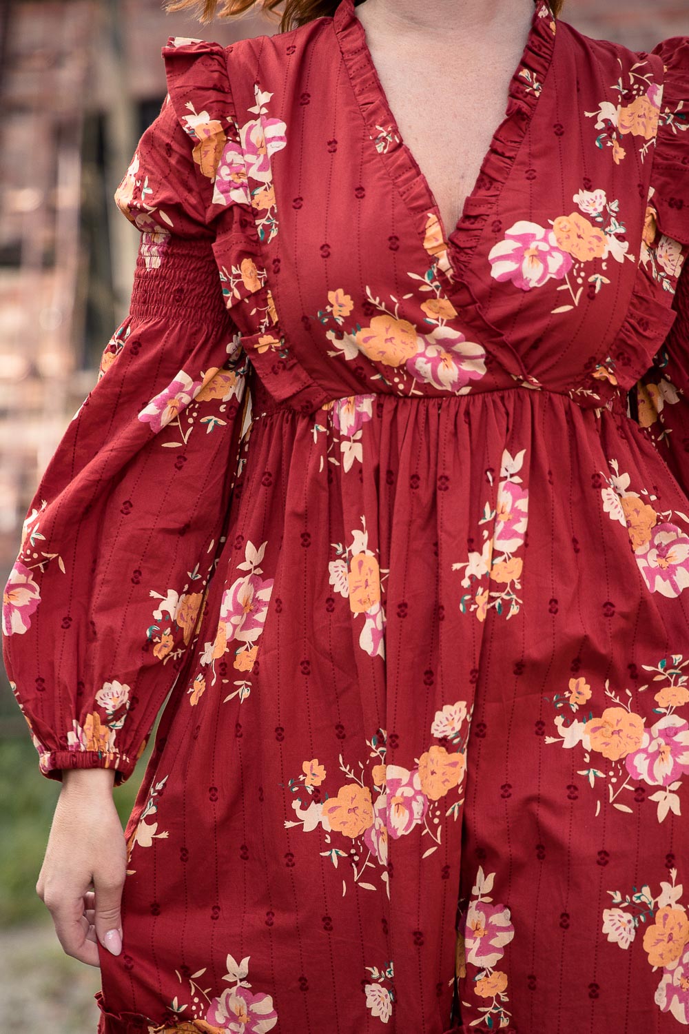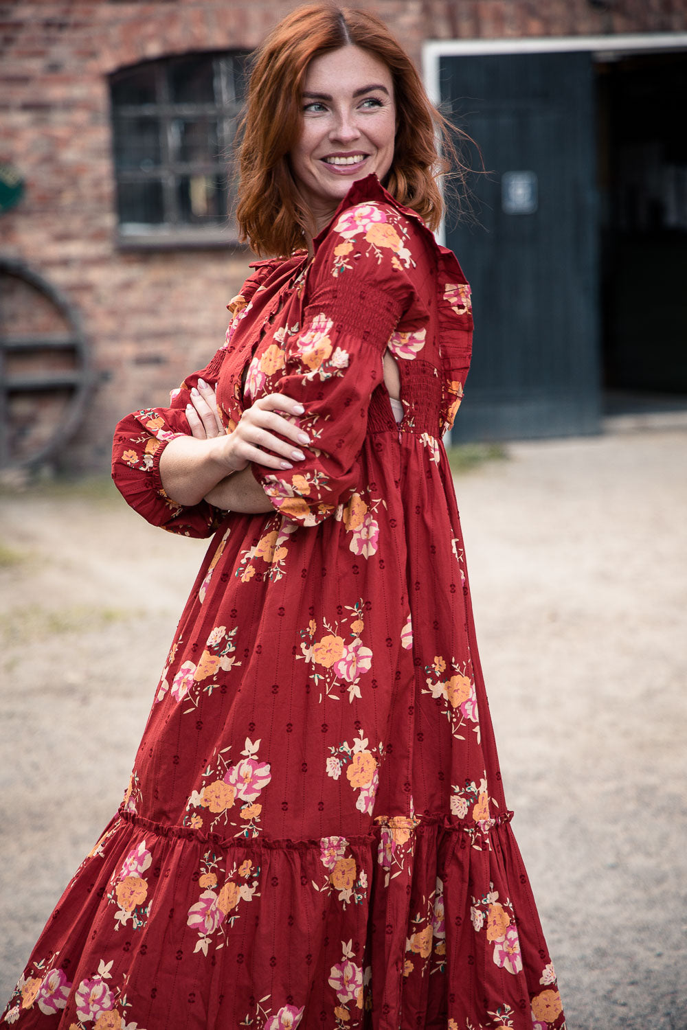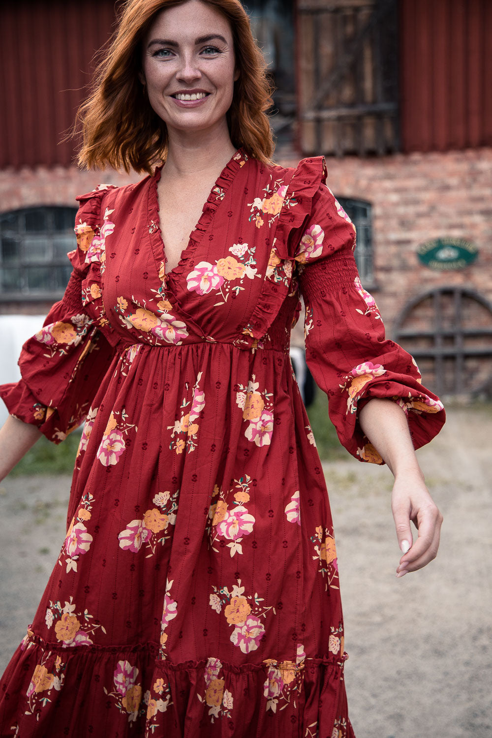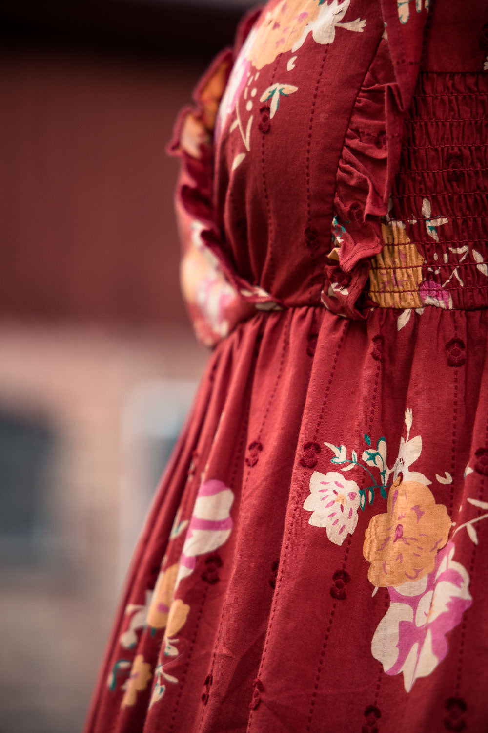 Klänningen är avskuren högt i midjan med en elastisk passform som gör den lätt och bekväm att bära. Smockdetaljer i sidorna upptill och på överärmen ger extra form och följsamhet. Ärmarna är långa och puffiga med resår i nederkanten, vilket gör att de kan bäras både långa eller uppdragna.