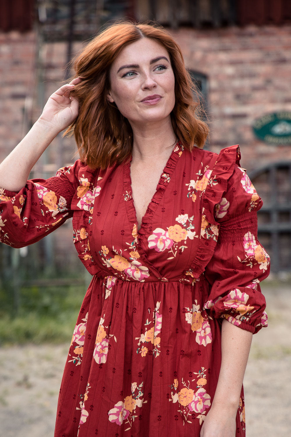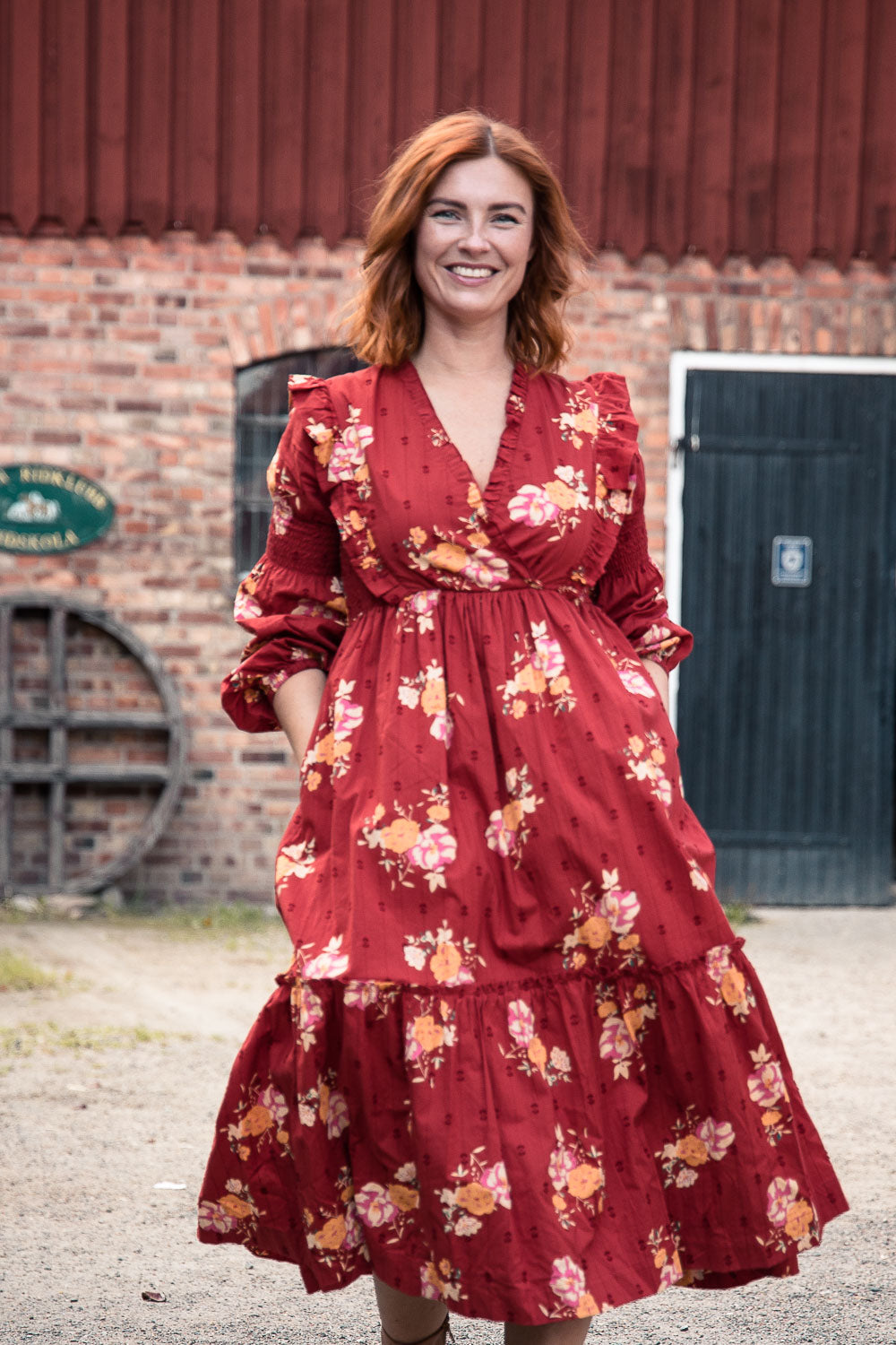 Kjolen är vid och avslutas med en bred volang nertill som ger klänningen ett vackert fall. Livet och kjolen är fodrade i tunn bomull för skön komfort och praktiska fickor i sidorna.