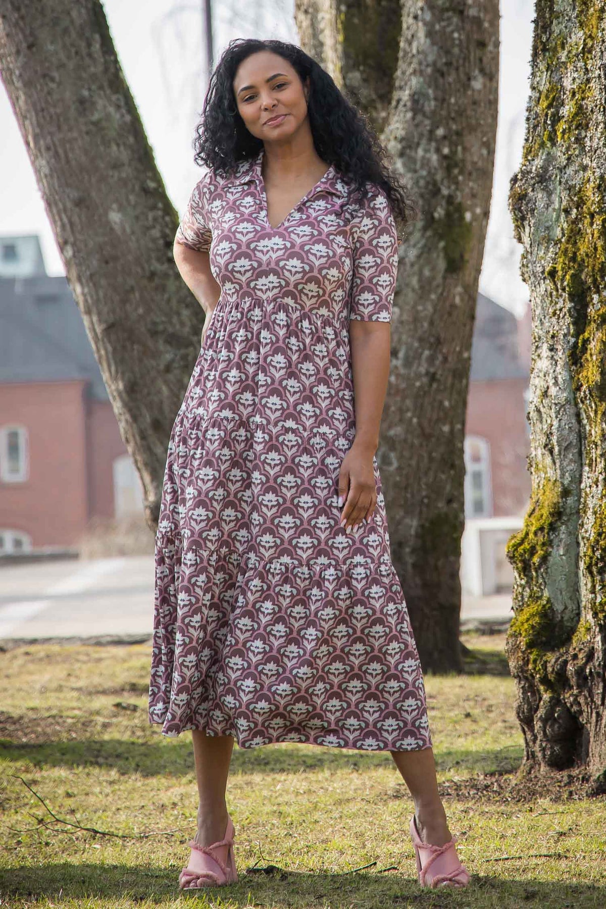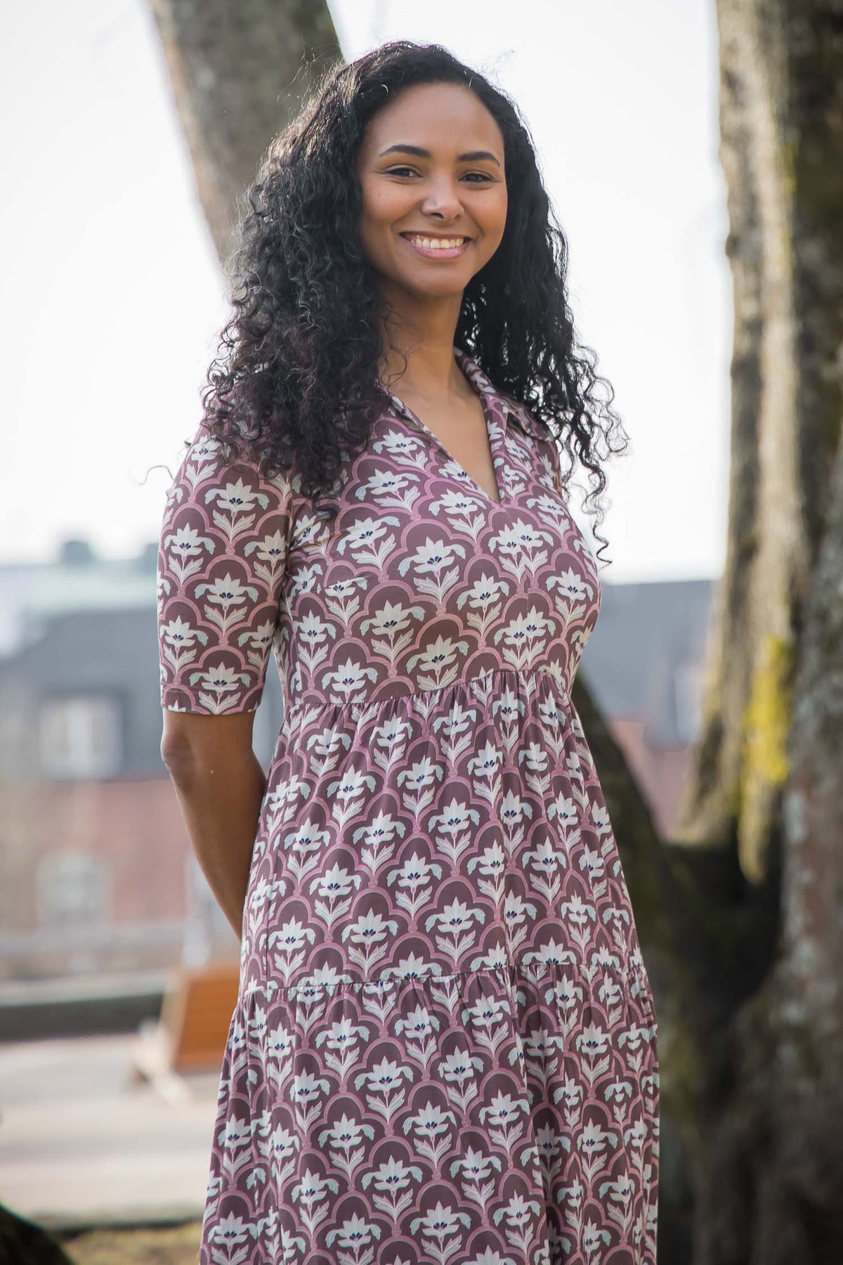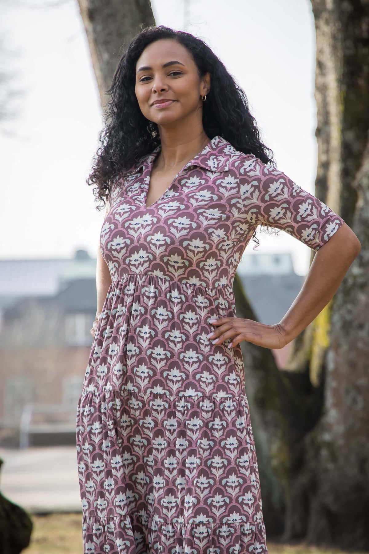 Den avslappnade skärningen strax under bysten gör att den faller fint, och kjolen med sina diskreta volanger ger precis lagom mycket vidd. Kragen och den öppna halsringningen ger en feminin touch som gör klänningen lika självklar till vardag som till fest. Det ornamentalt blommönstrade tyget sätter pricken över i:et – och räkna med komplimanger!