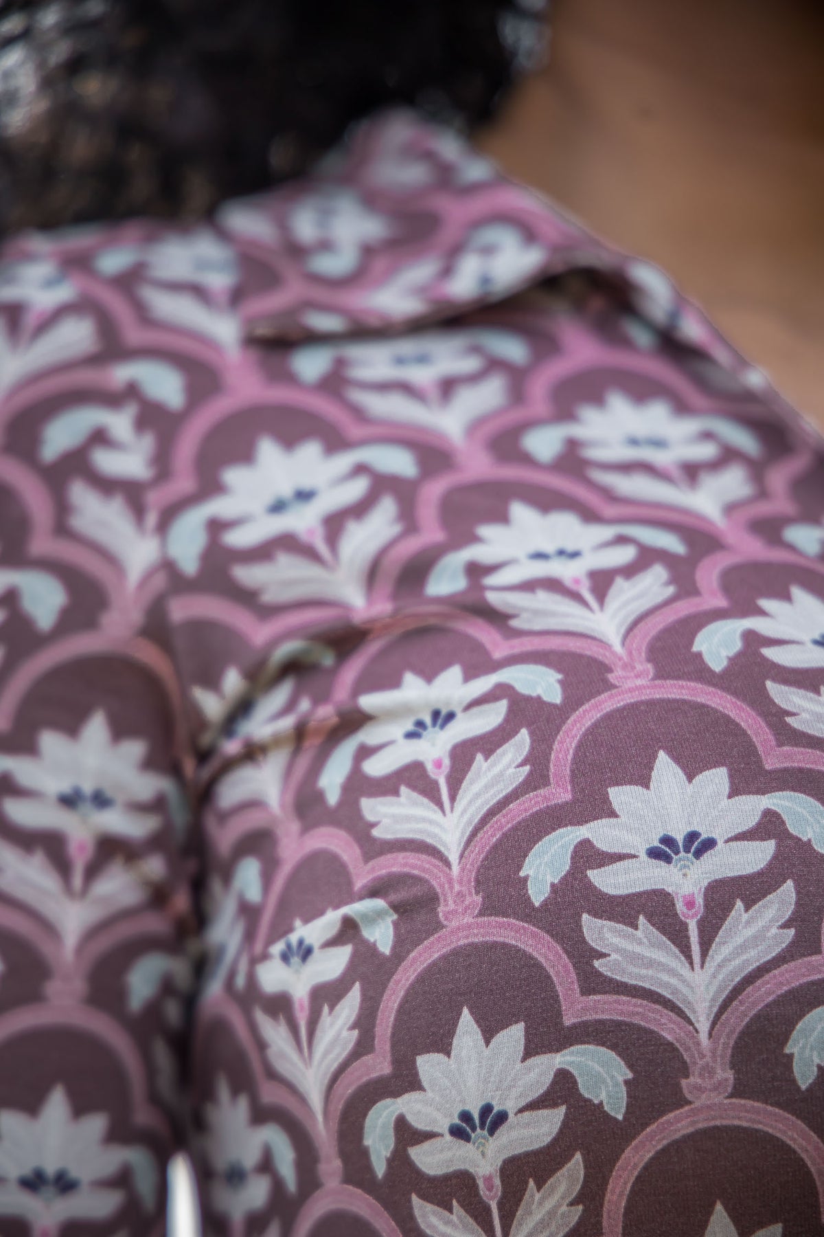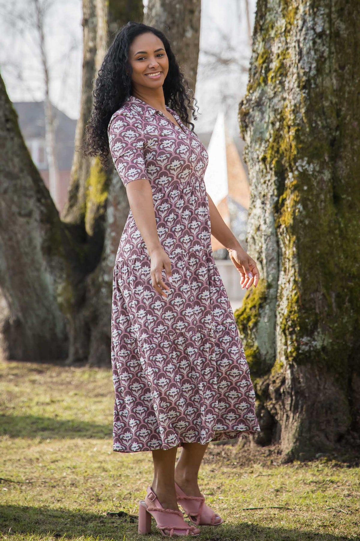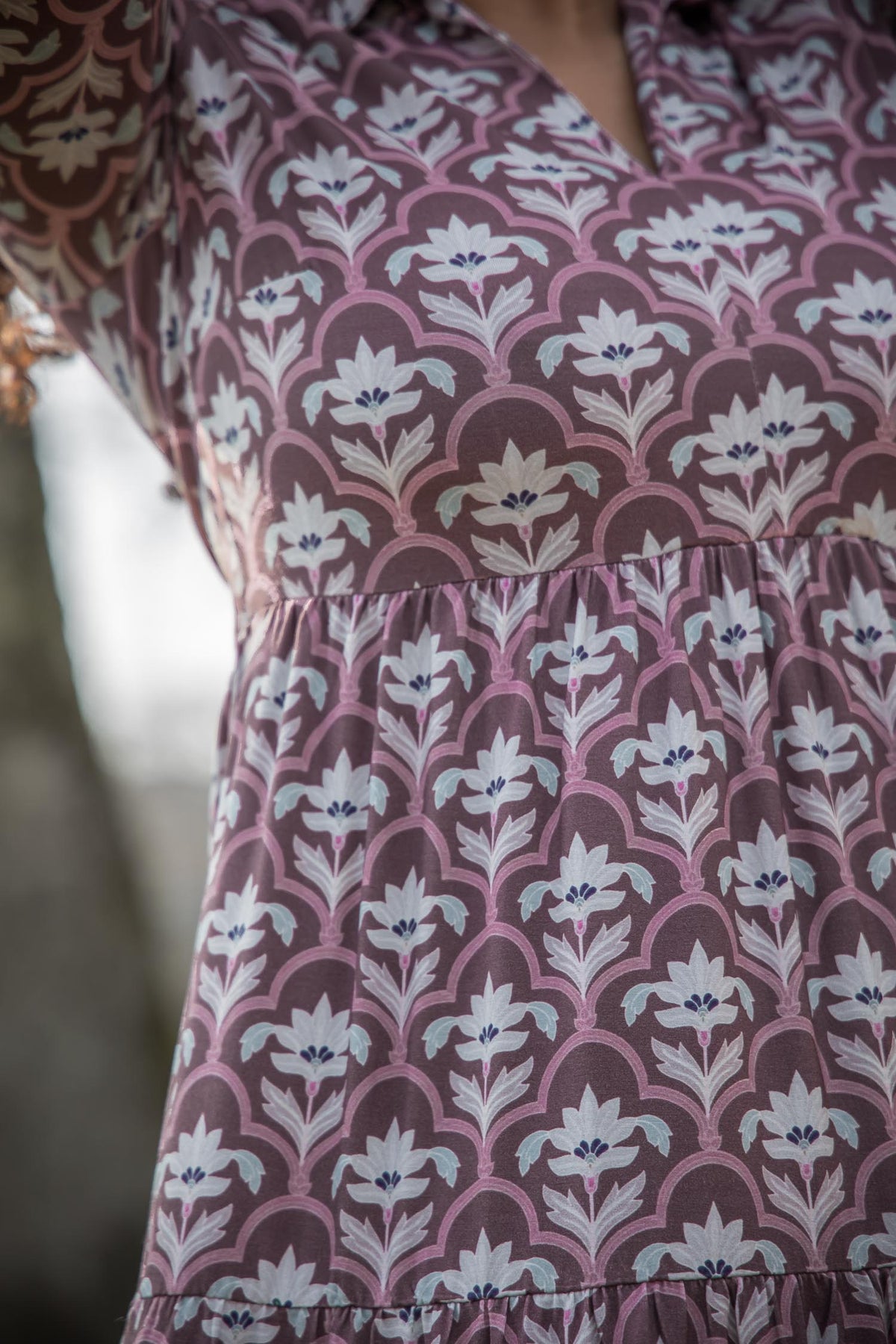 Den avslappnade skärningen strax under bysten gör att den faller fint, och kjolen med sina diskreta volanger ger precis lagom mycket vidd. Kragen och den öppna halsringningen ger en feminin touch som gör klänningen lika självklar till vardag som till fest. Det ornamentalt blommönstrade tyget sätter pricken över i:et – och räkna med komplimanger!