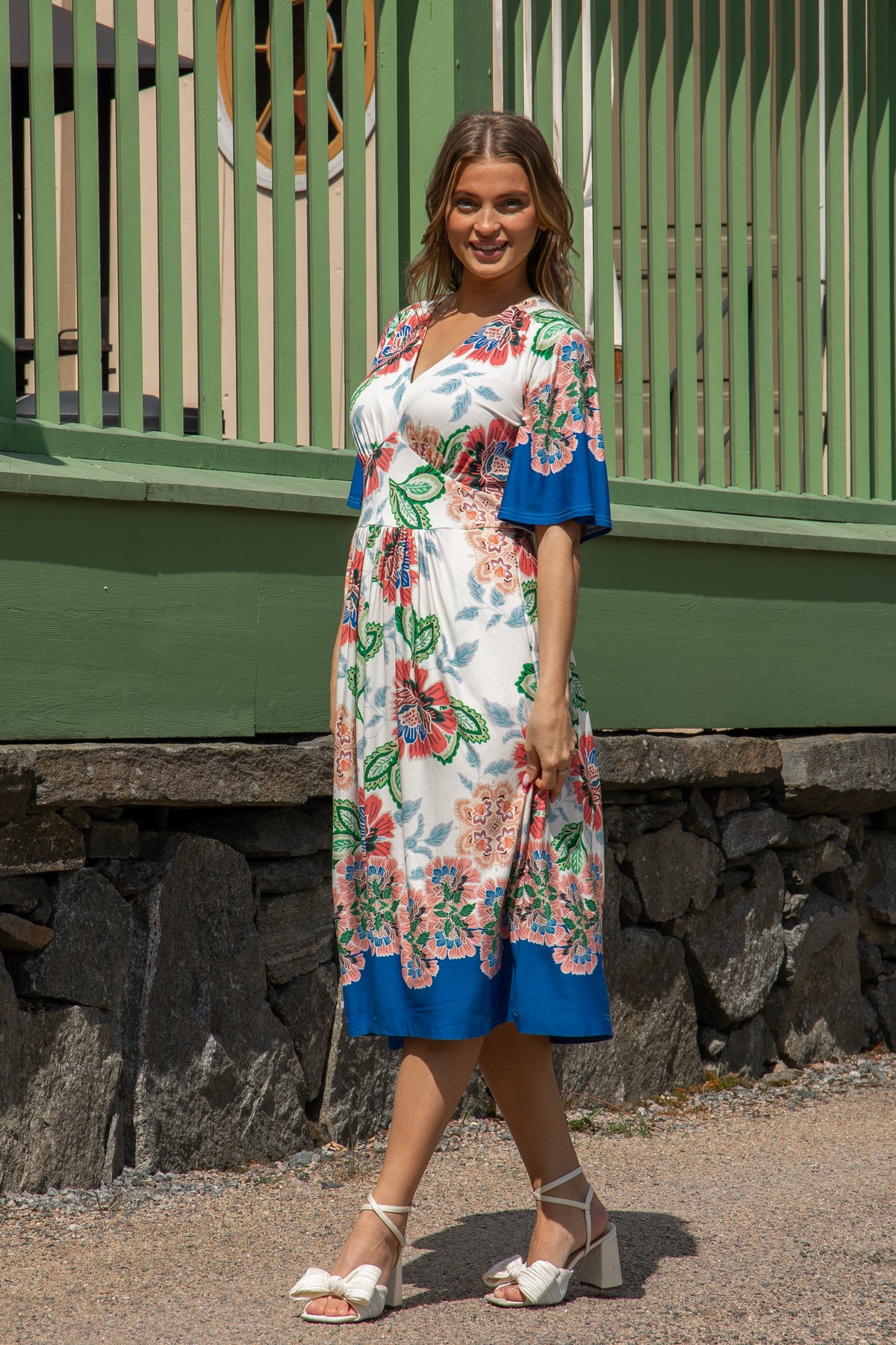 Nina jersey dress är något extra! Denna blommönstrade trikåklänning kombinerar komfort och stil på bästa sätt. Klockade ärmar och V-ringning med rynkdetaljer vid axeln ger en feminin och elegant touch. Figurnära upptill med formande midja och vid kjol som smickrar figuren.