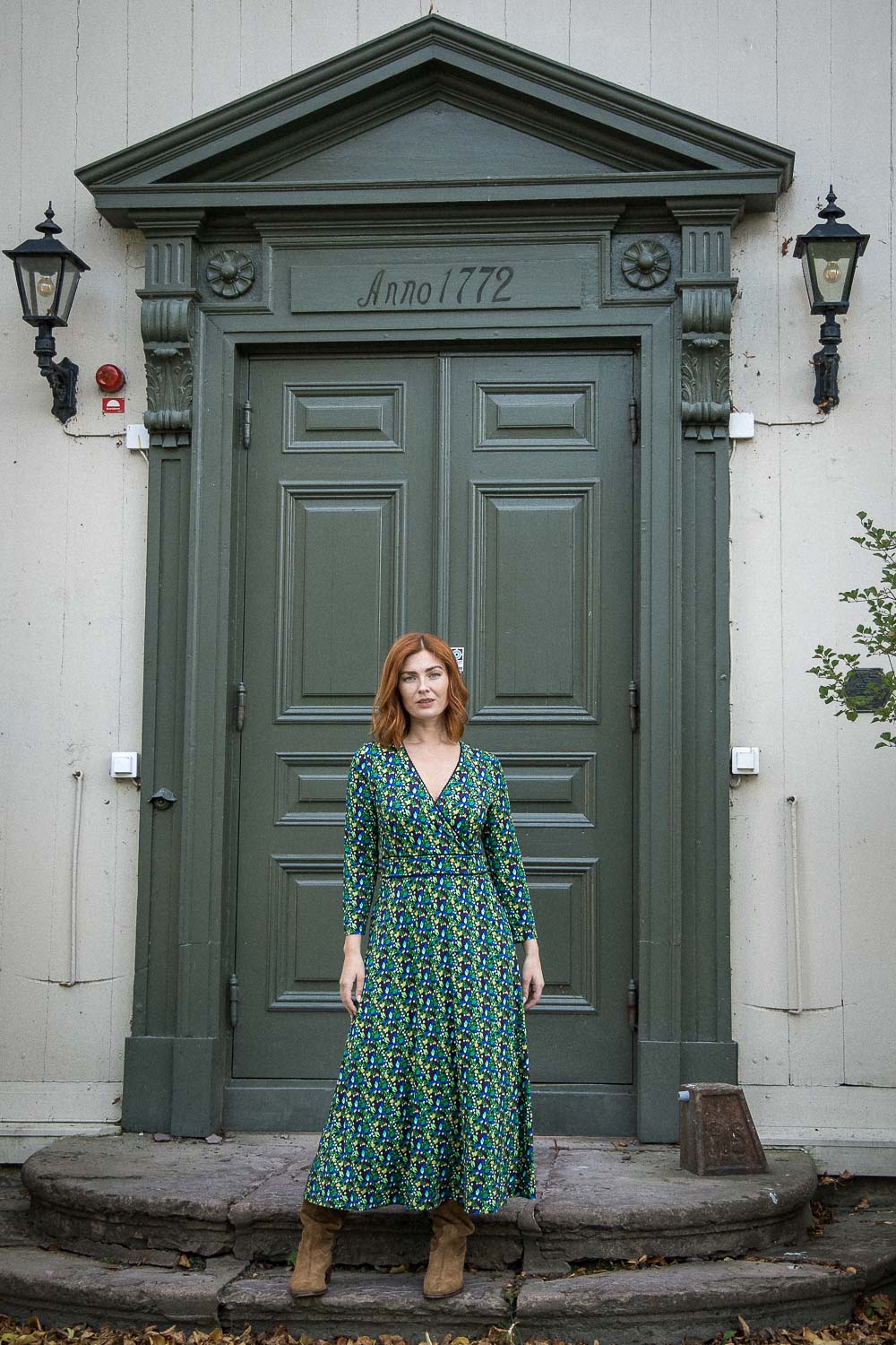 • Vadlång klänning med omlottskuren överdel (stängd omlott).
