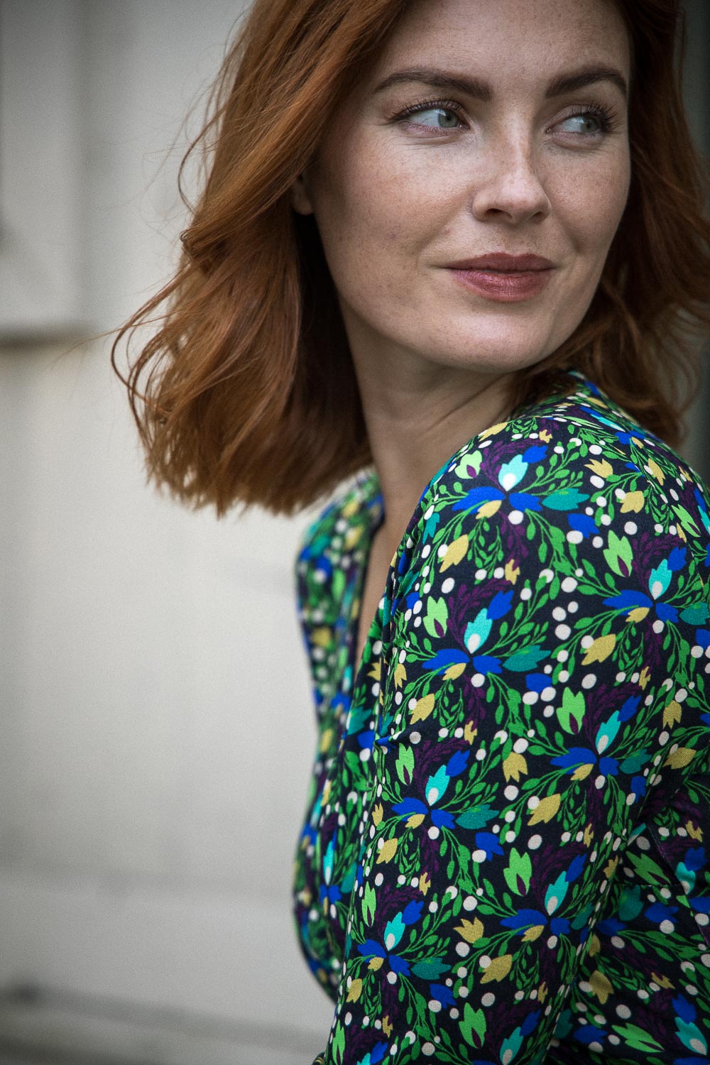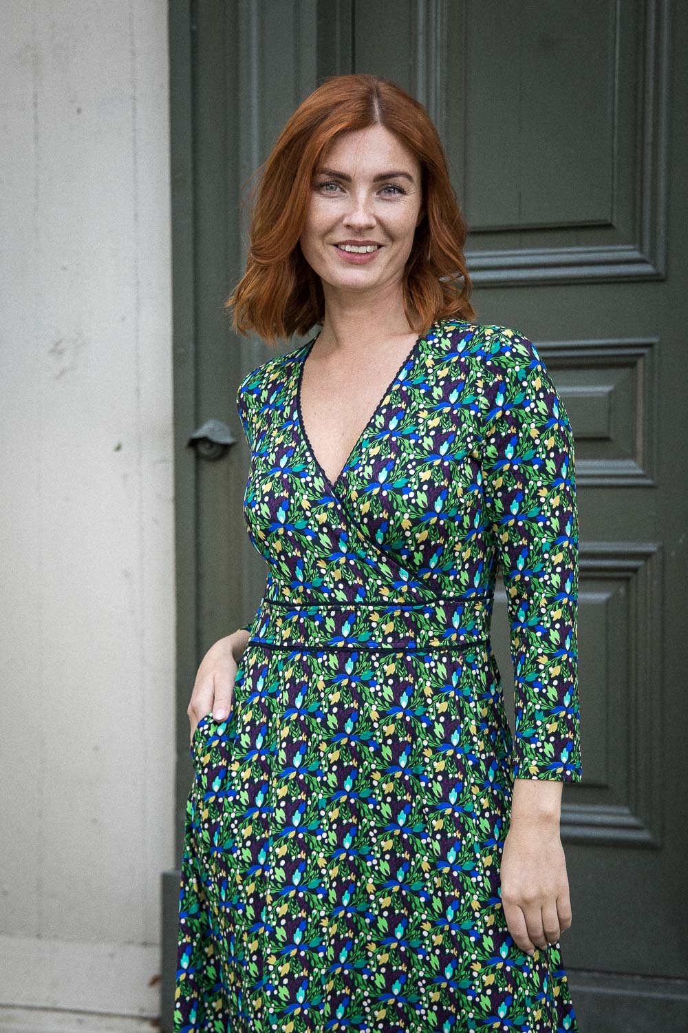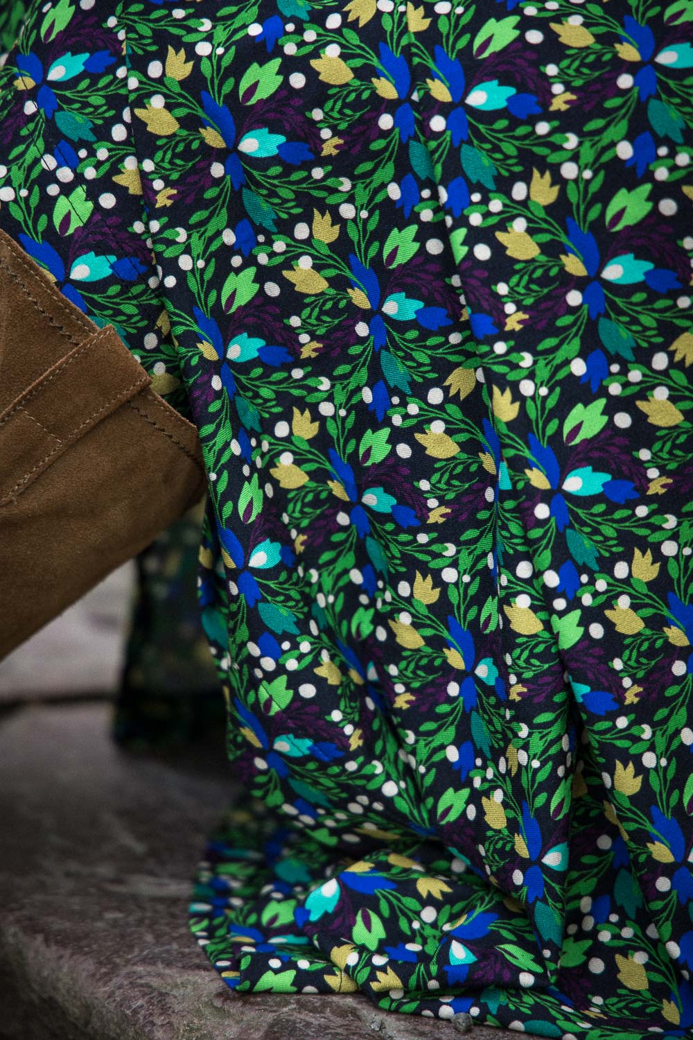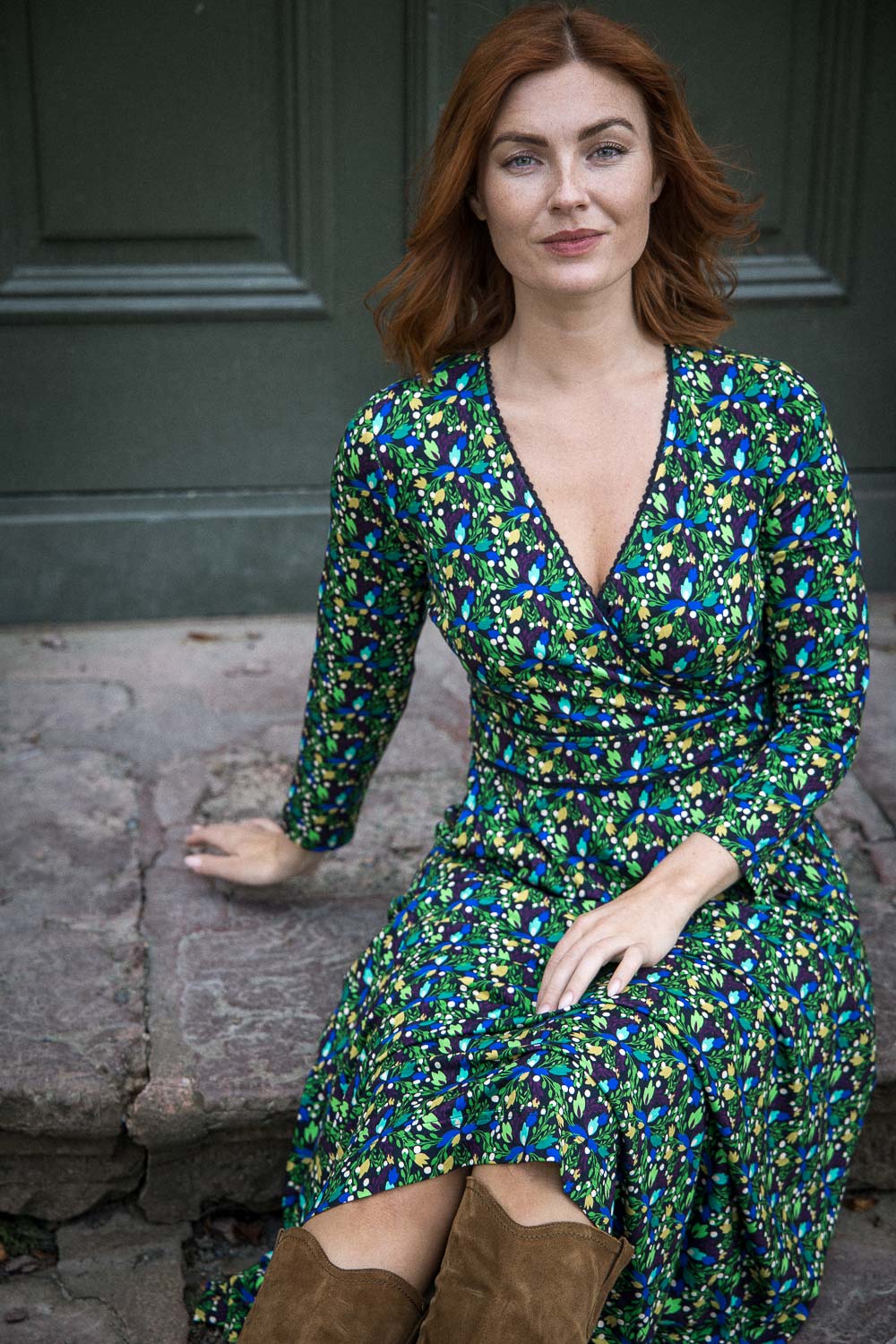 En klänning i mjuk trikå med ett blommönster i grönt, blått, turkost och gult på mörkt marinblå botten – en färgkombination som känns både modern och nostalgisk.