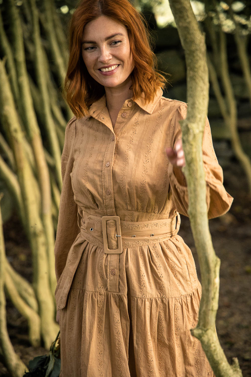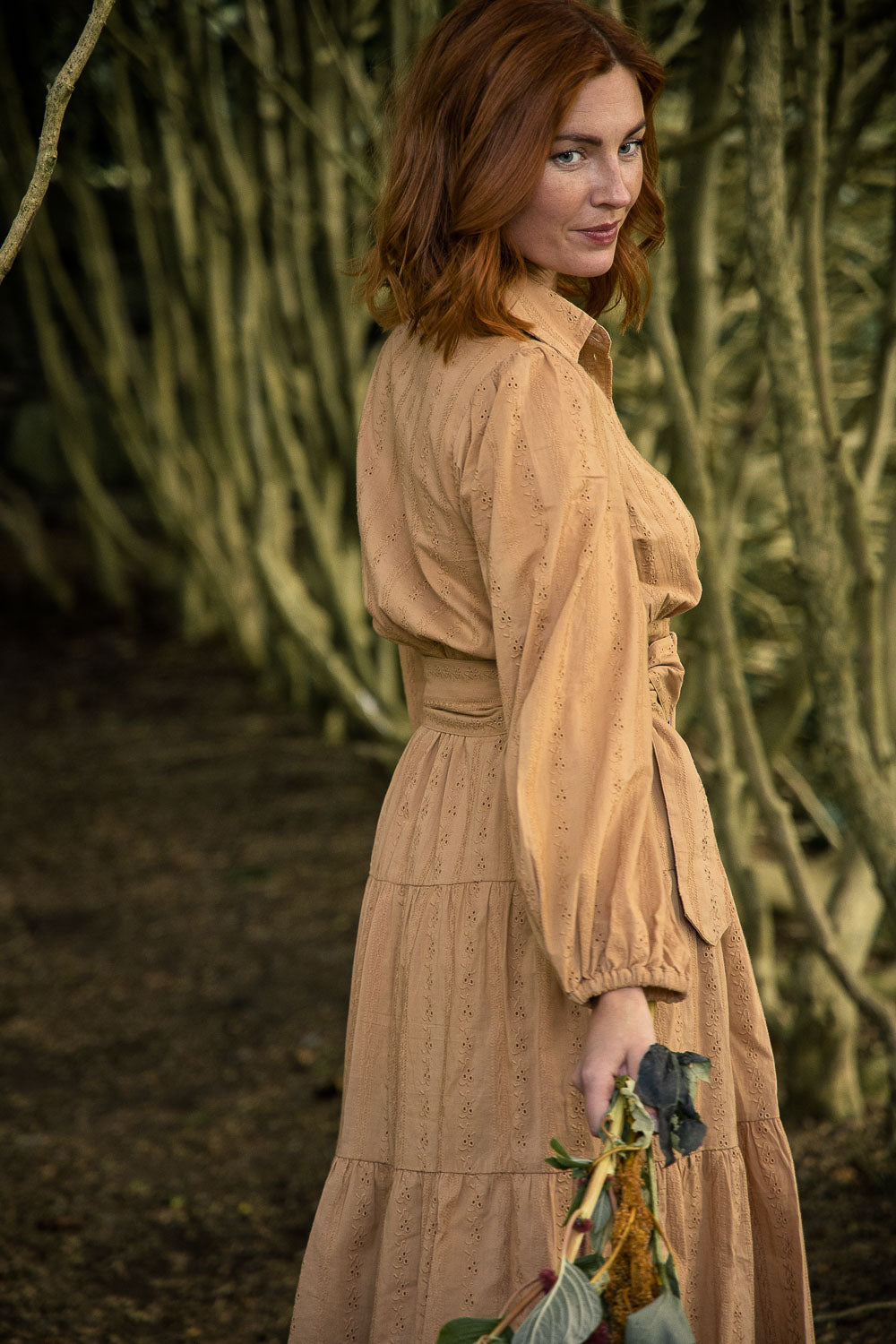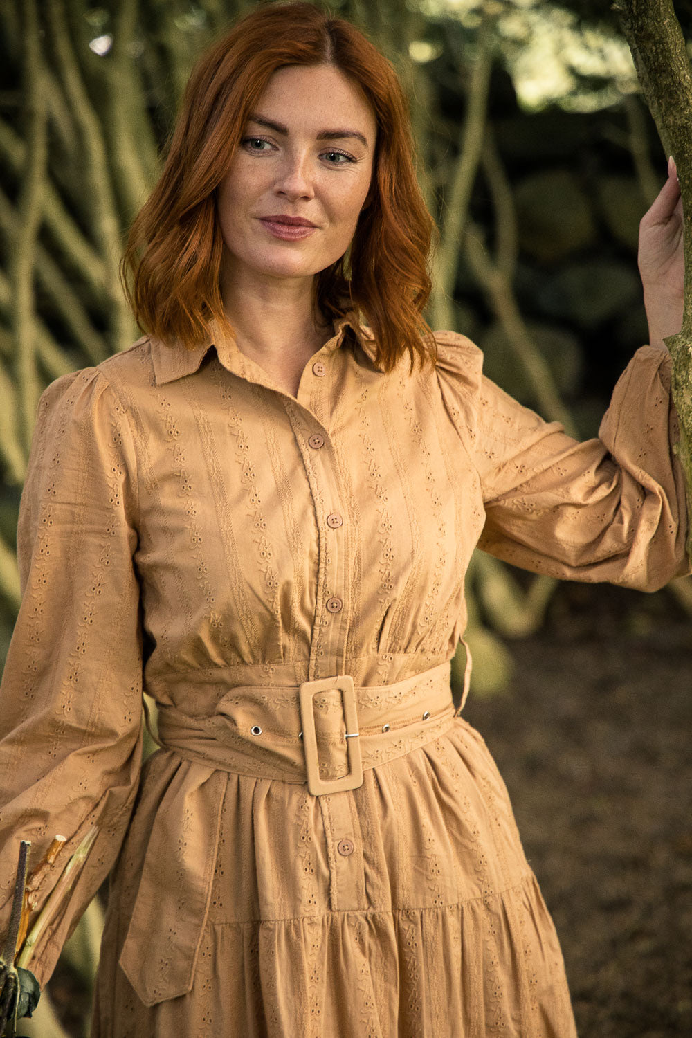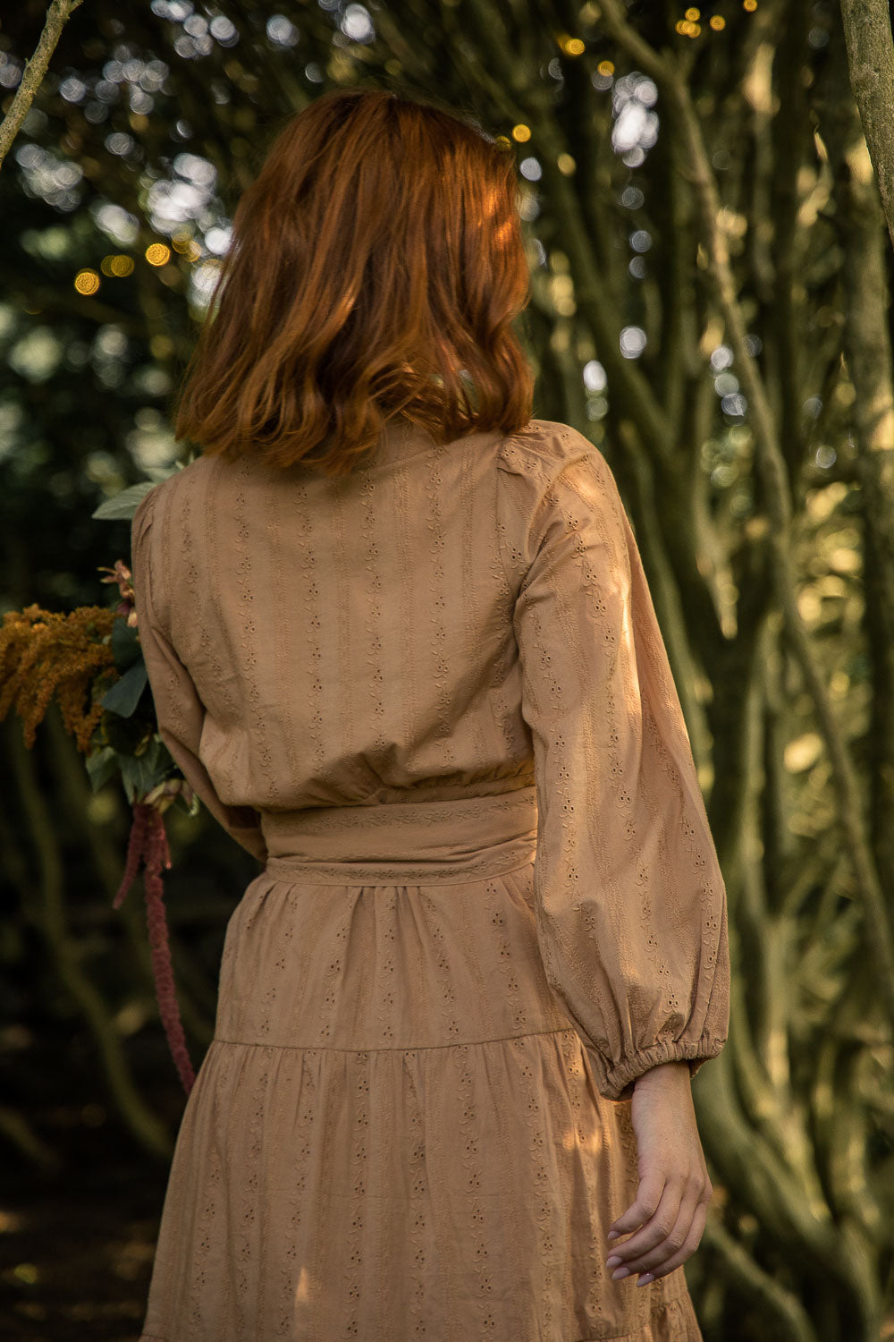 Säg hej till vår nya klänningsmodell sydd i broderie anglaise, en skjortklänning där klassiska detaljer möter en feminin silhuett med bohemisk charm. Färgen är mjuk som ökensand och framhäver det broderade bomullstygets vackra struktur.