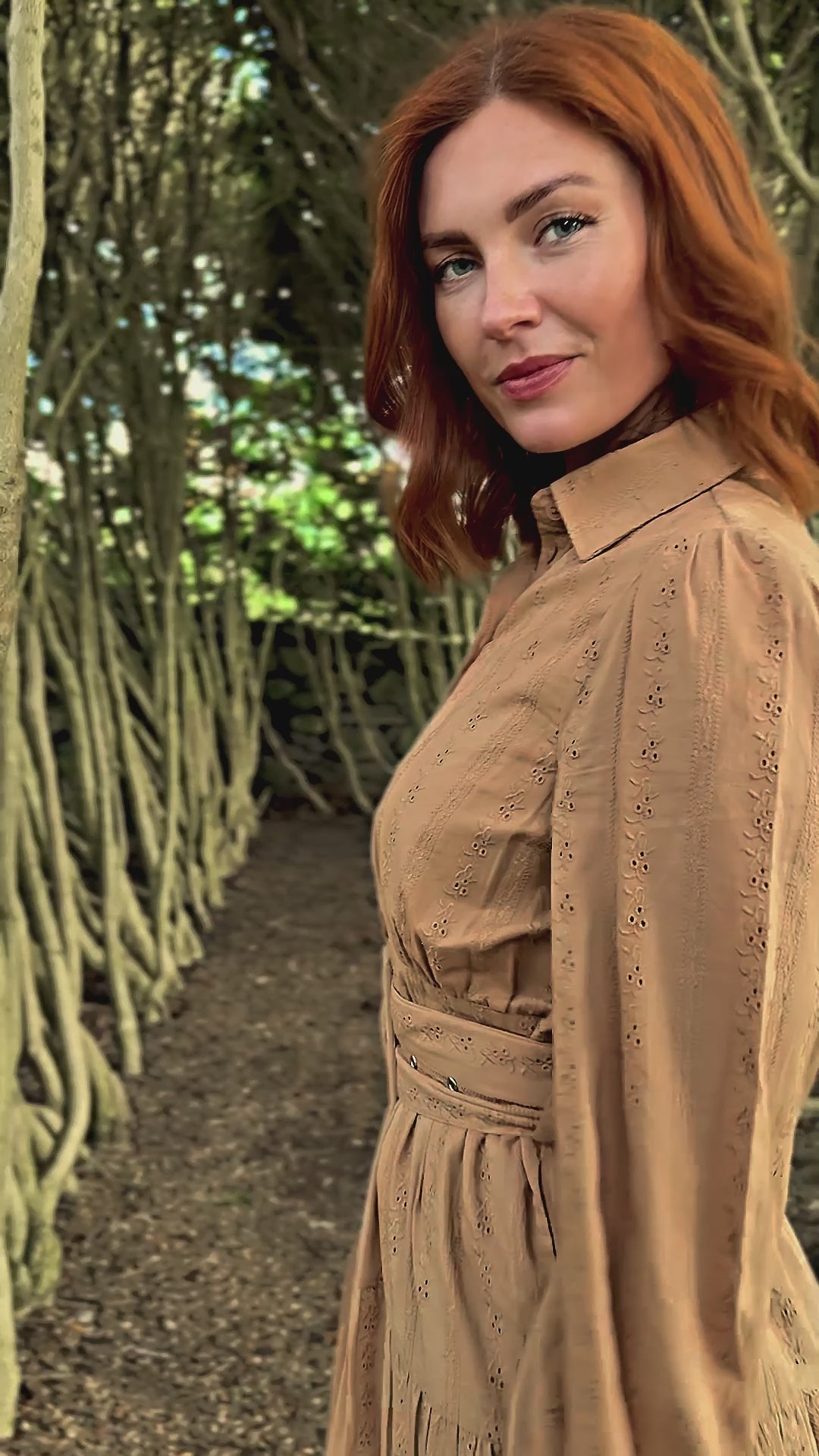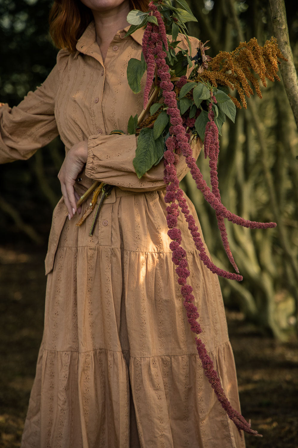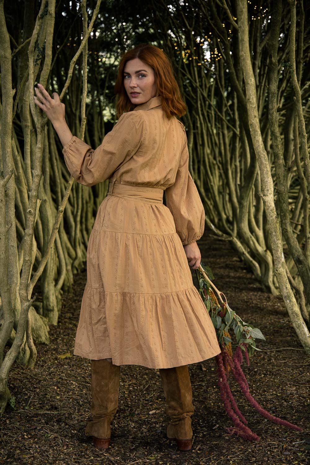 Säg hej till vår nya klänningsmodell sydd i broderie anglaise, en skjortklänning där klassiska detaljer möter en feminin silhuett med bohemisk charm. Färgen är mjuk som ökensand och framhäver det broderade bomullstygets vackra struktur.