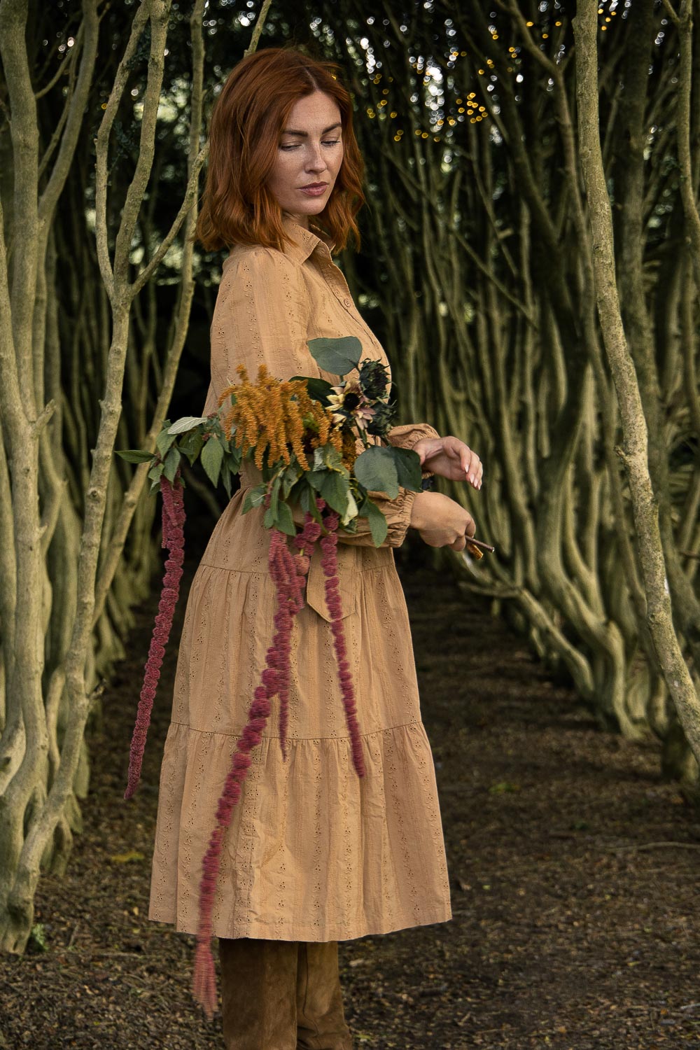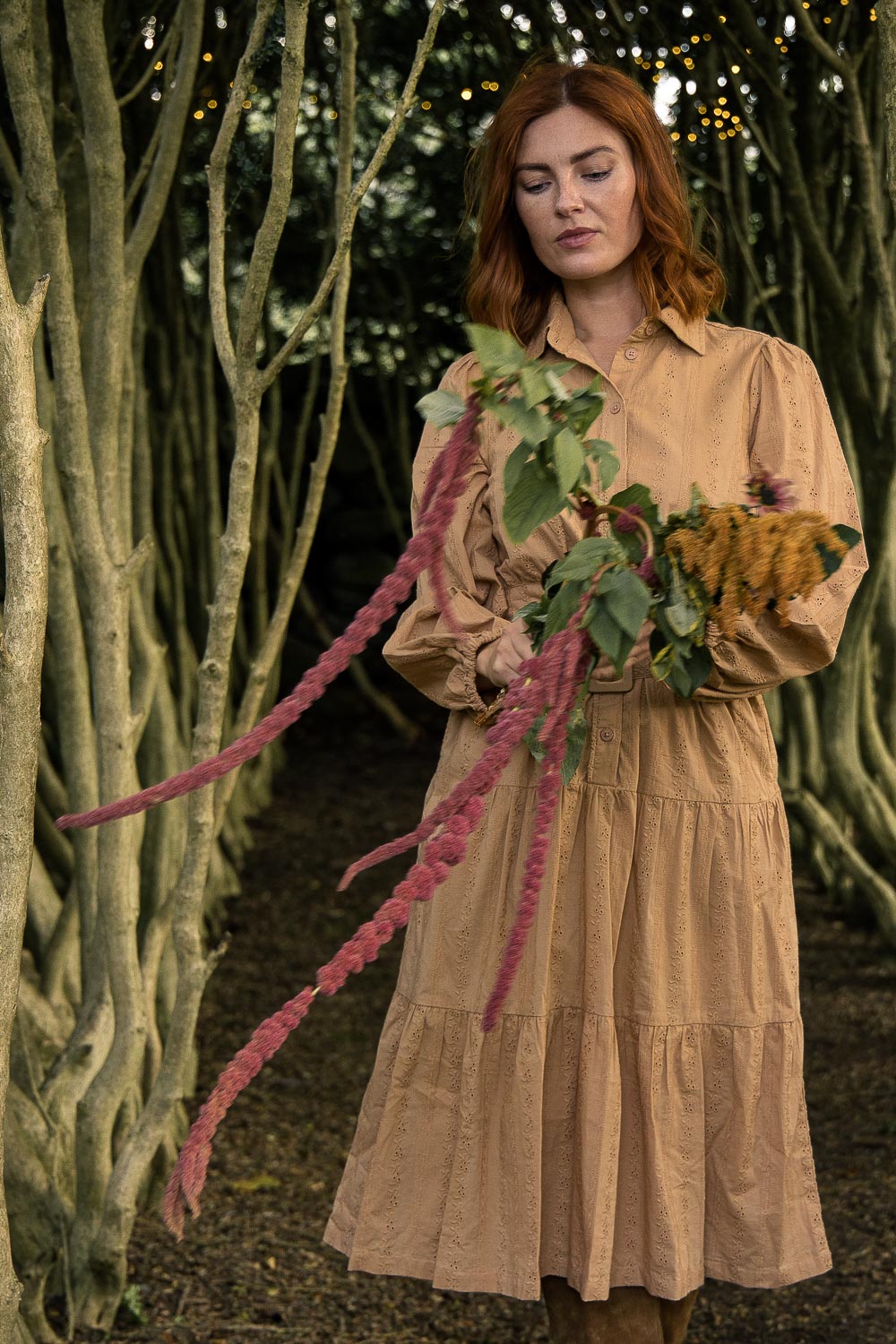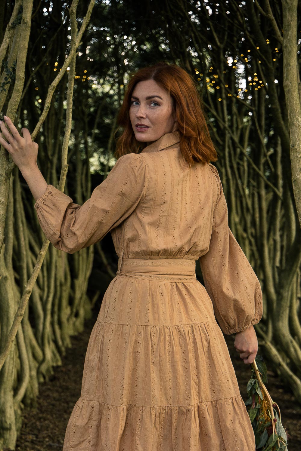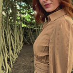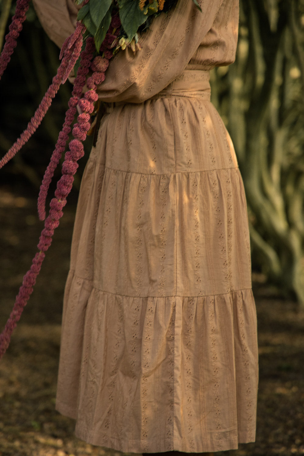 Säg hej till vår nya klänningsmodell sydd i broderie anglaise, en skjortklänning där klassiska detaljer möter en feminin silhuett med bohemisk charm. Färgen är mjuk som ökensand och framhäver det broderade bomullstygets vackra struktur.