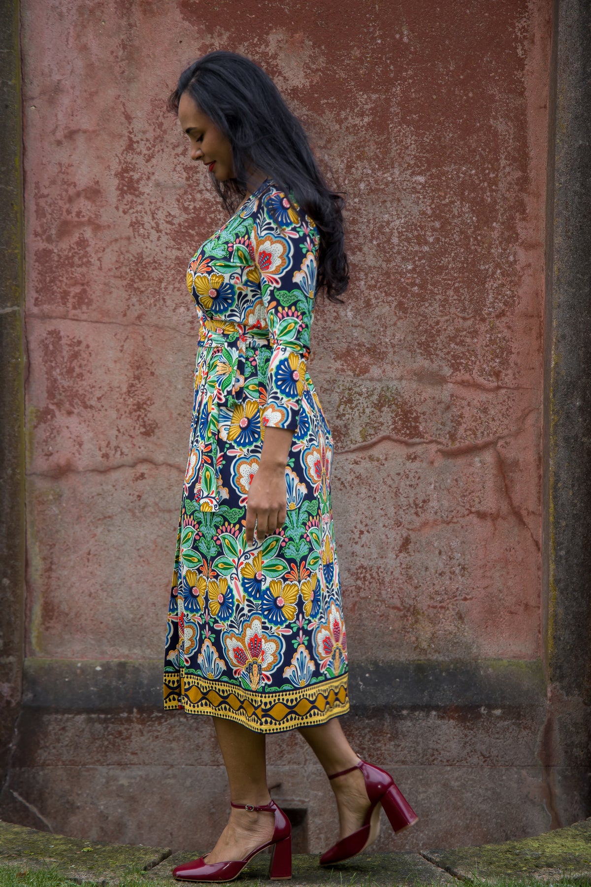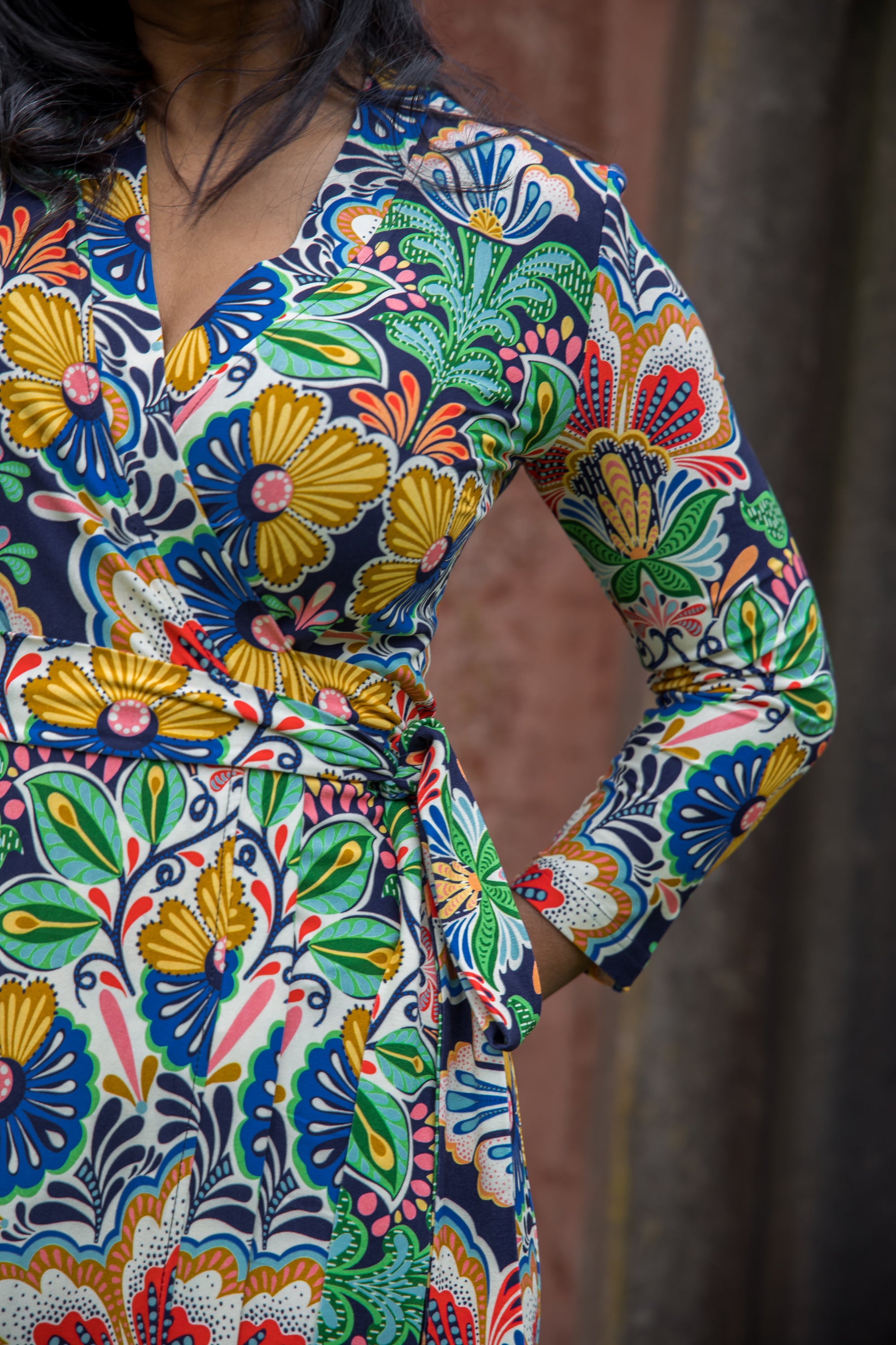 Slim Wrap – Omlottklänning med rakare kjol och färgstarkt folklore-mönster.